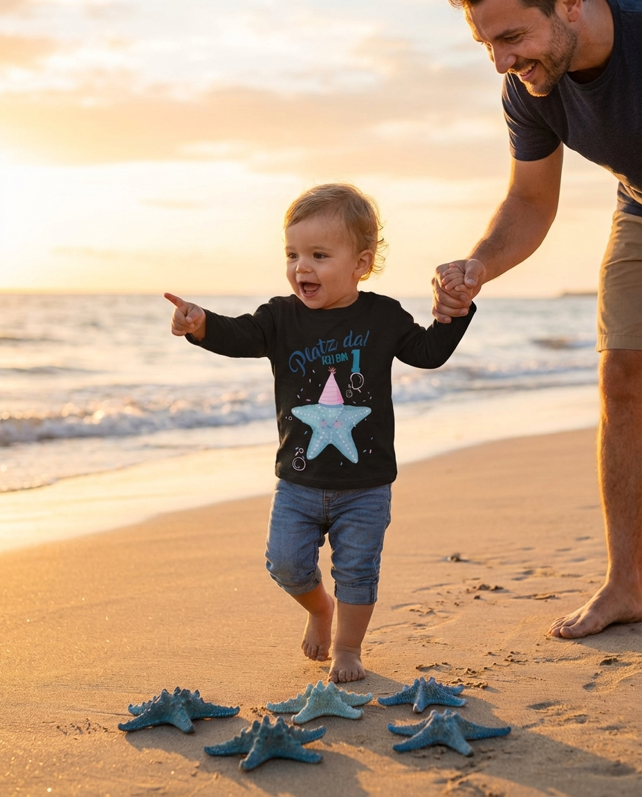 Stell dir vor, wie stolz dein kleiner Schatz beim ersten Geburtstag strahlt – und alle wissen sofort: Hier kommt das Geburtstagskind! Dieses süße Longsleeve mit dem frechen "Platz Da ich bin Eins"-Spruch und dem niedlichen Seestern macht deinen kleinen Liebling zum Star seines besonderen Tages.