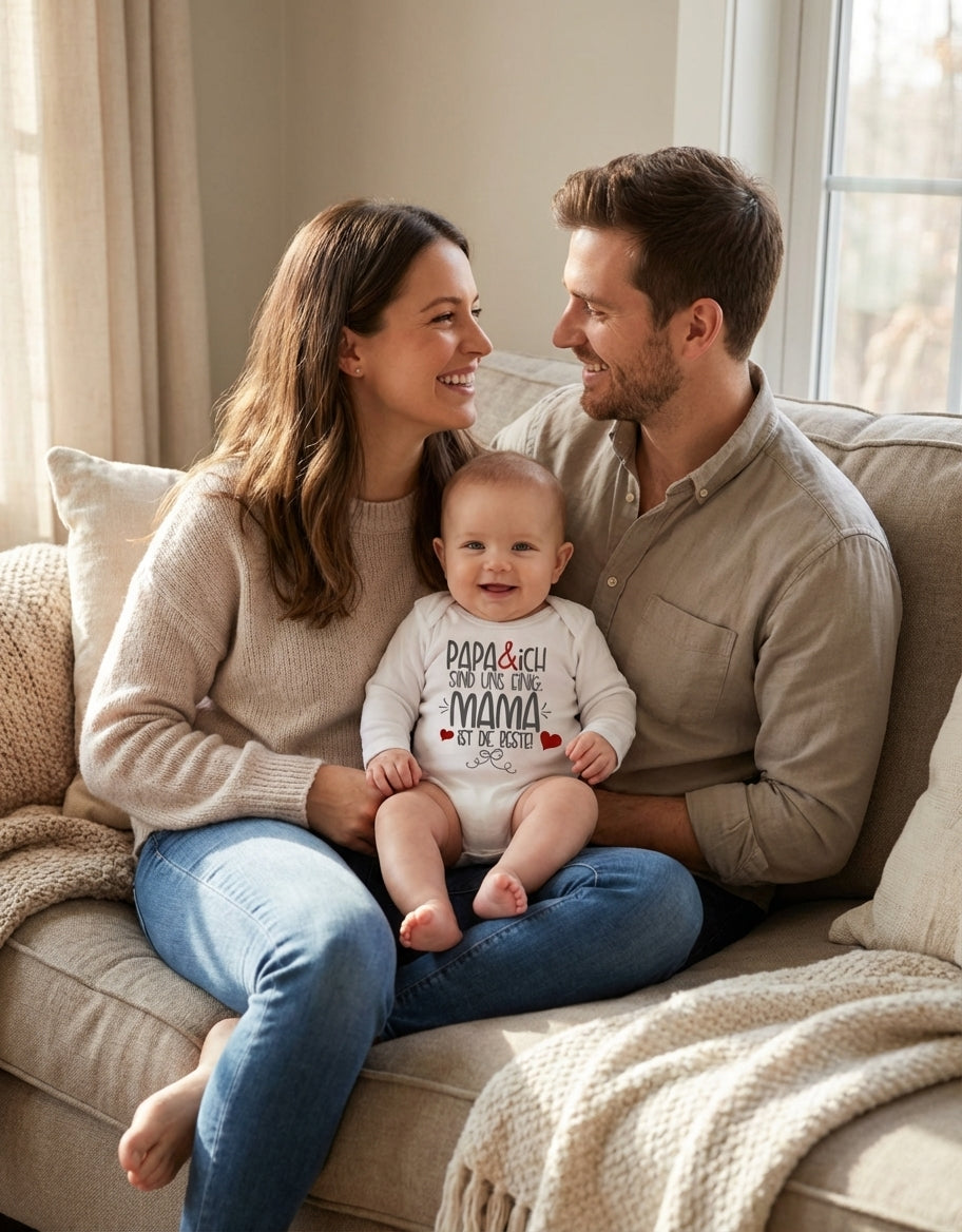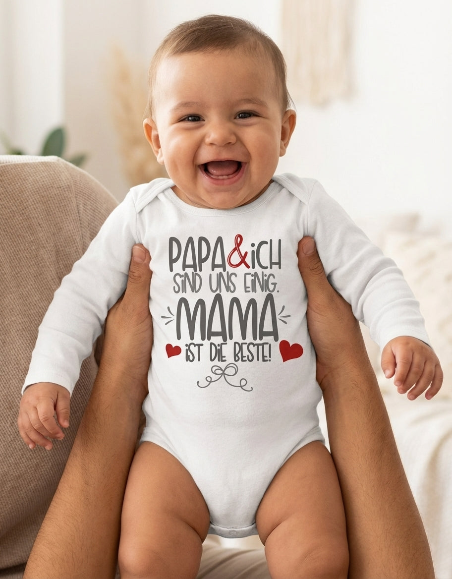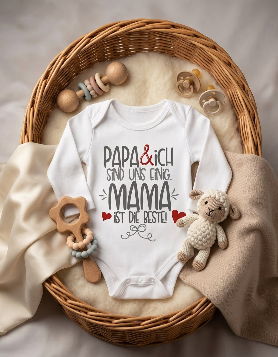 Stell dir vor, dein kleines Wunder strahlt, während es eine Botschaft trägt, die Herzen höherschlagen lässt: "Papa & ich sind uns einig. Mama ist die Beste!" Dieser zauberhafte Bio Langarm Baby Body ist mehr als nur Kleidung – er ist ein liebevolles Statement, das jeden Tag ein Lächeln auf Mamas Gesicht zaubert und zeigt, wie sehr sie geliebt wird. Ein Must-have für alle kleinen Schätze und ihre größten Fans!