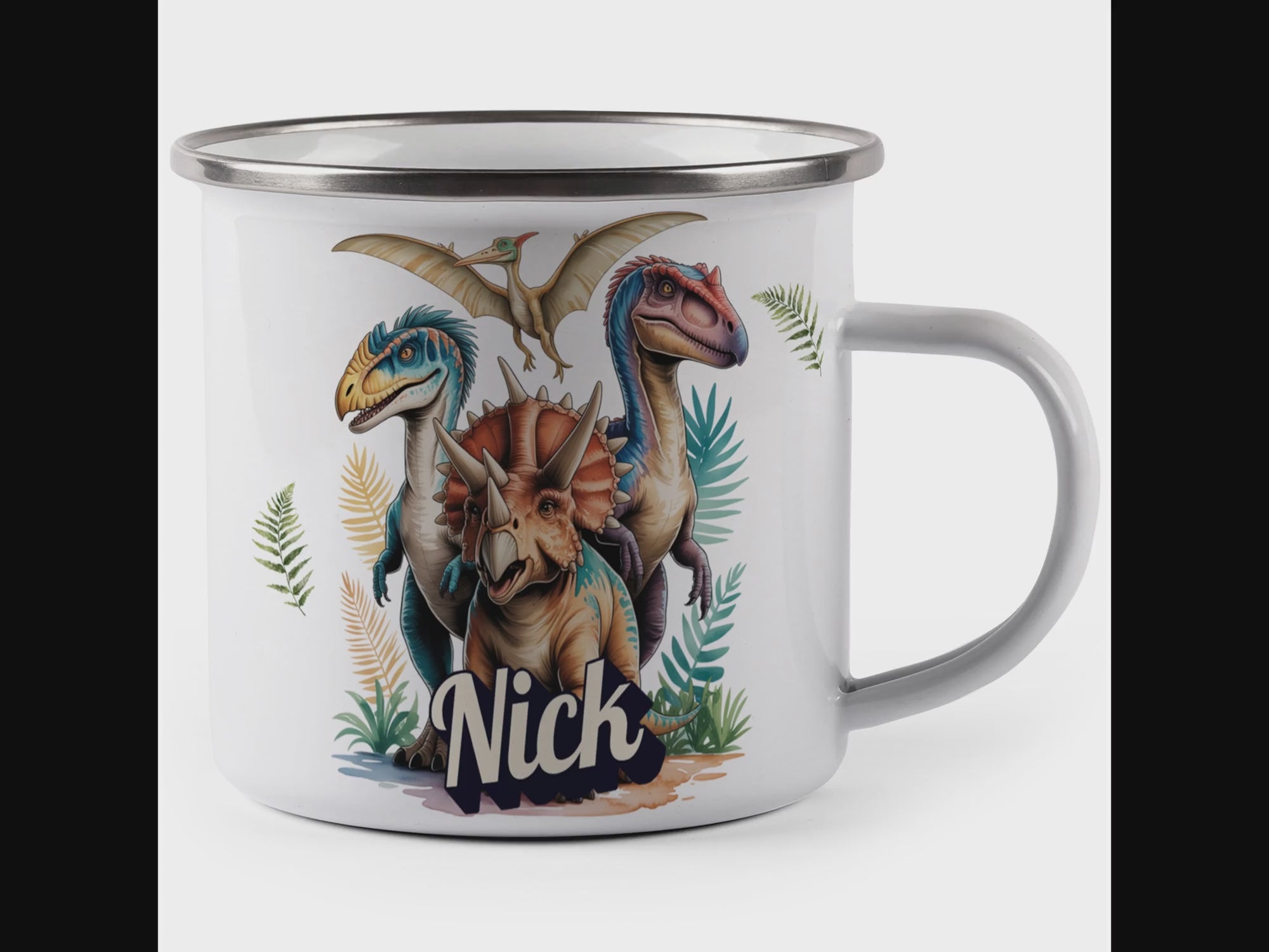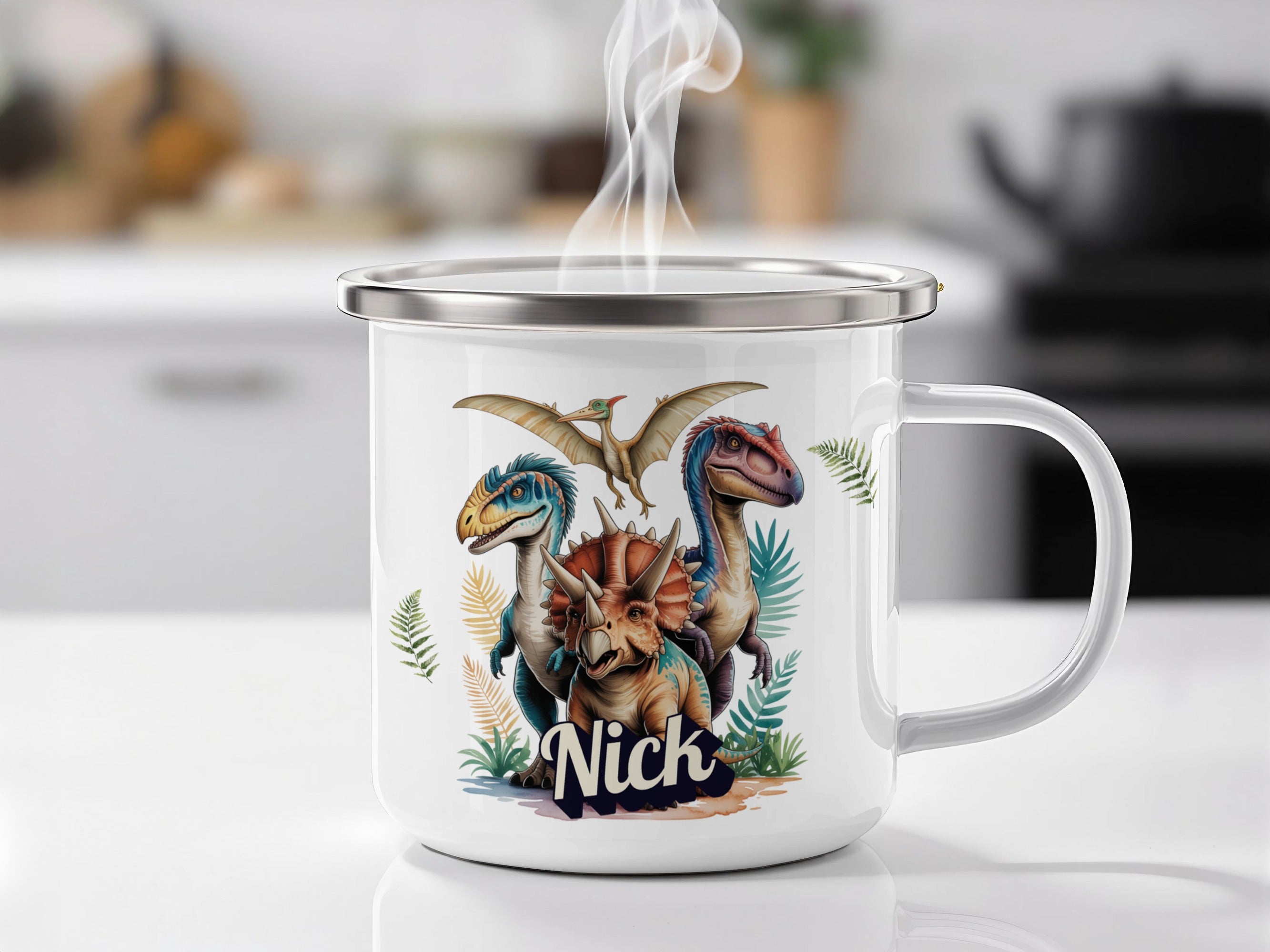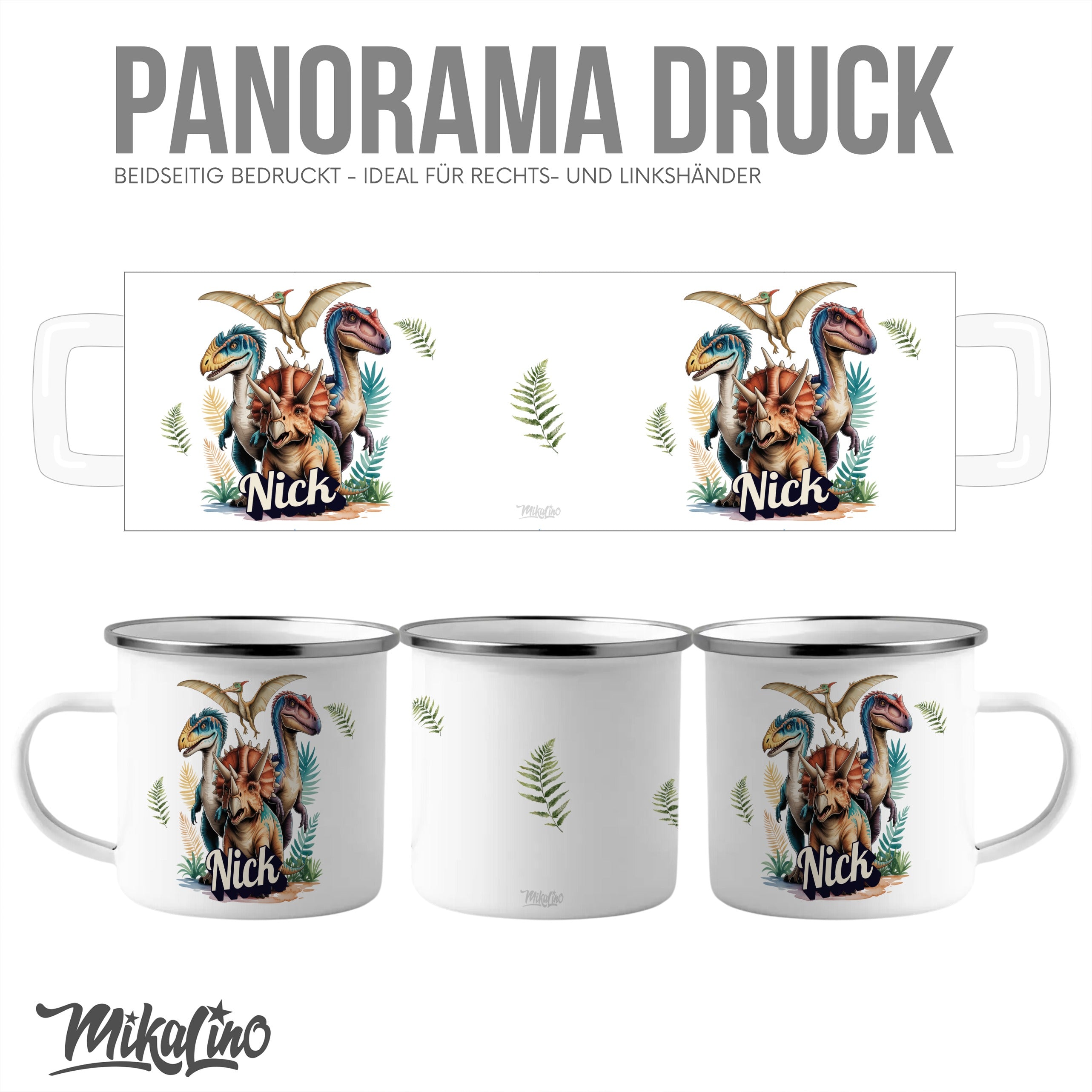 Die personalisierte Emaille Tasse mit Dino Crew-Motiv von MIKALINO ist das perfekte Geschenk für kleine Dinosaurier-Forscher, die Triceratops, Velociraptor, oder dem Flugsaurier Pteranodon lieben. Jede Tasse wird mit deinem Wunschnamen bedruckt und so zu einem ganz persönlichen Unikat.
