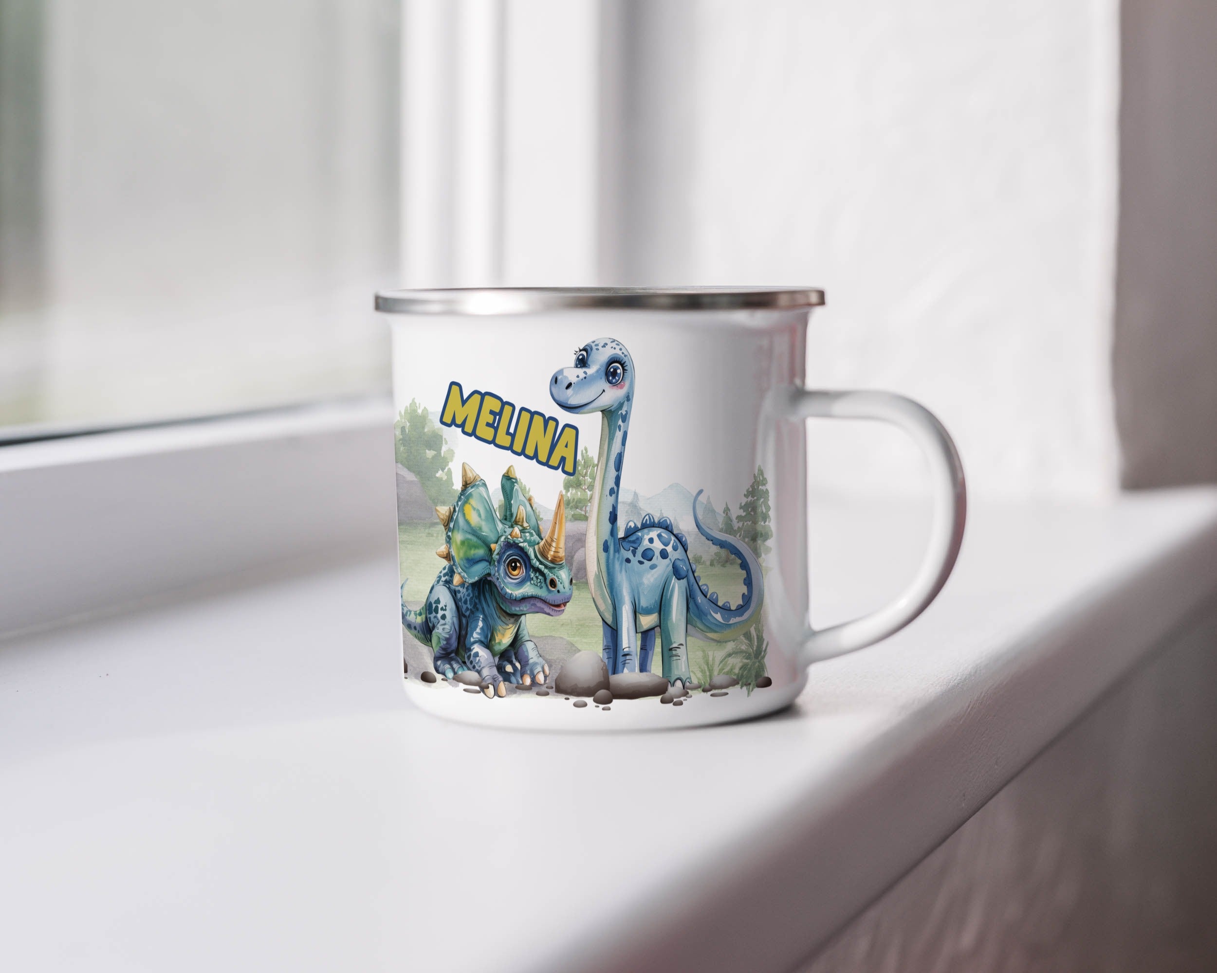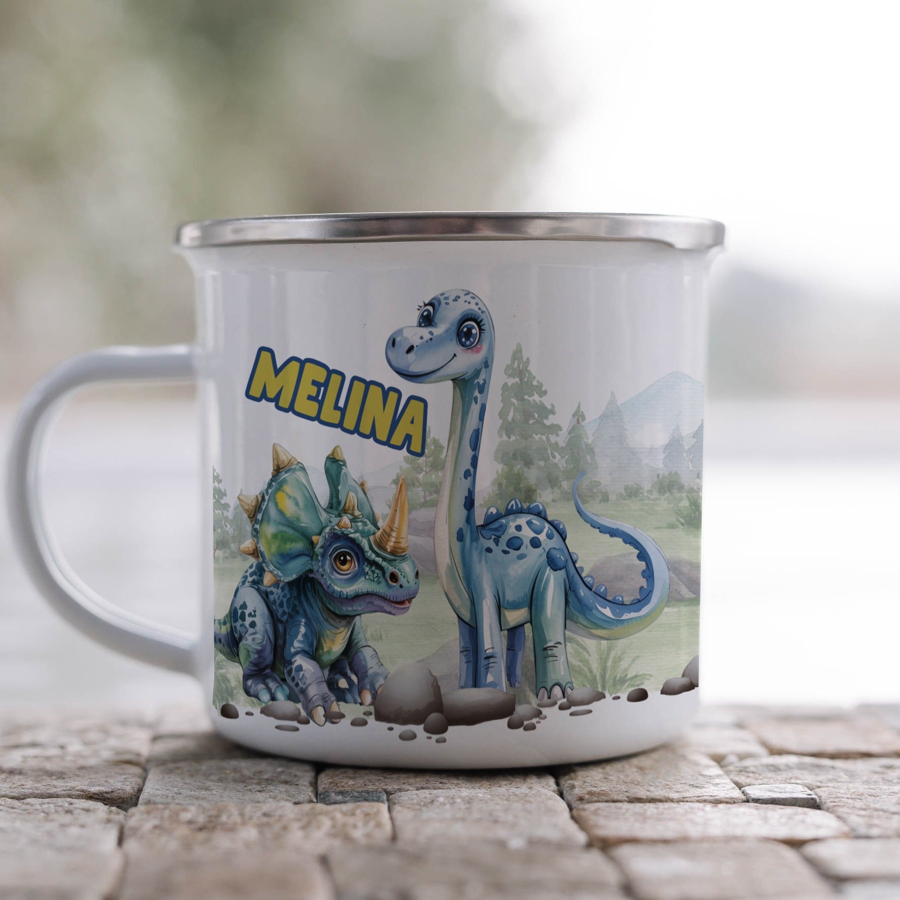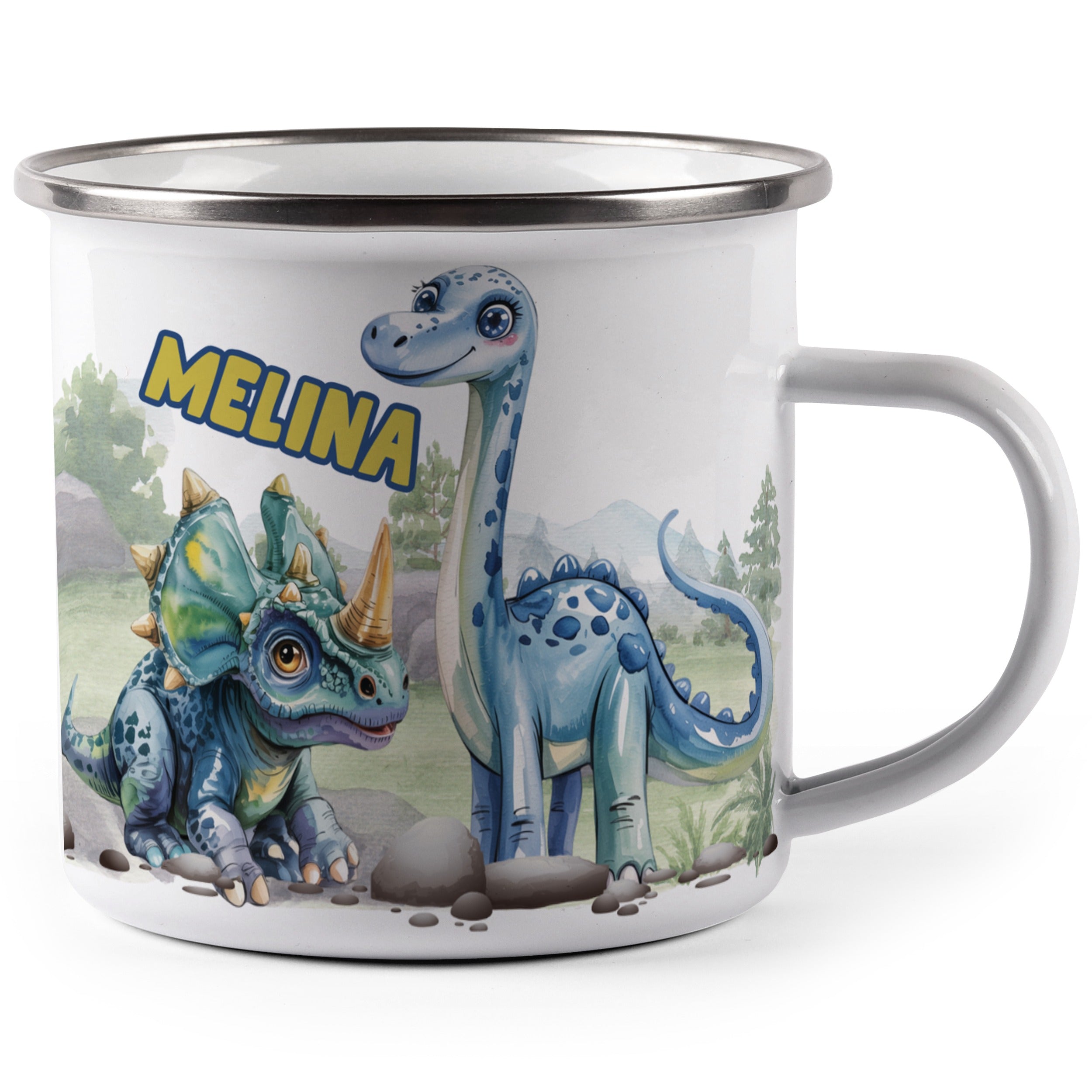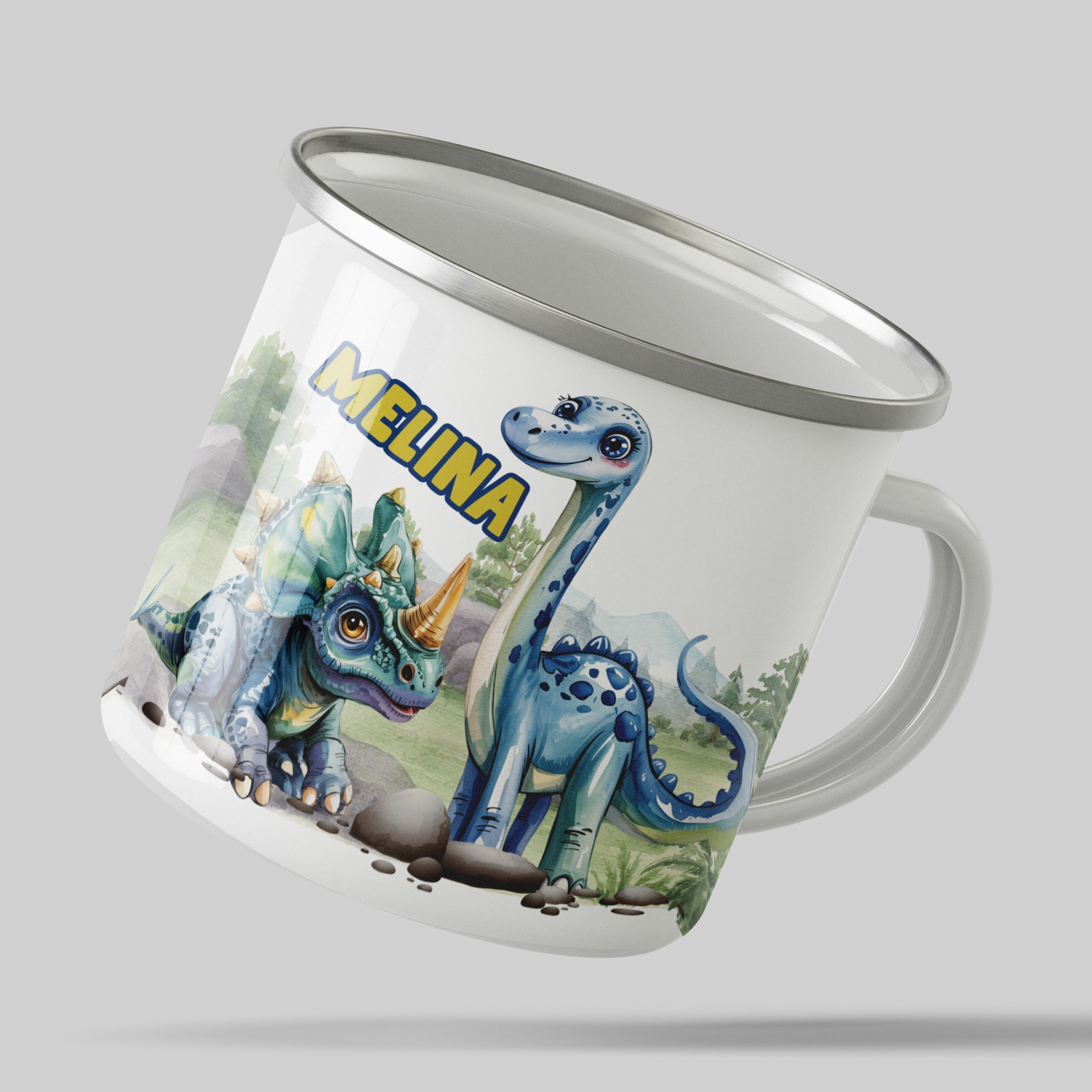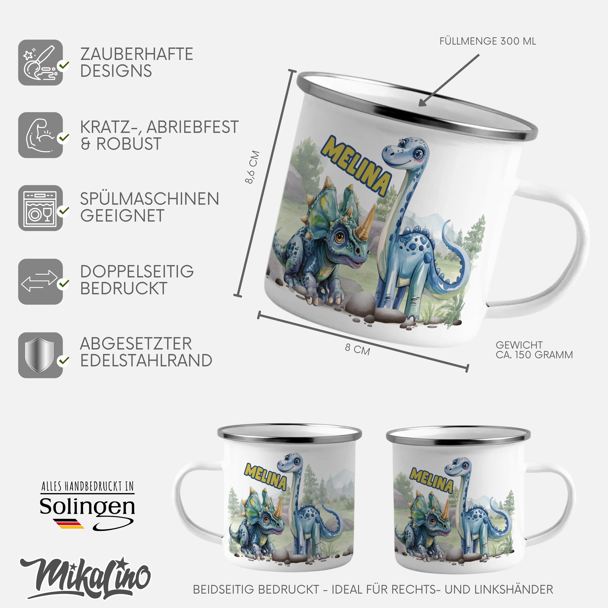 Emaille Tasse Dino Freunde Duo personalisiert mit Namen Kinder Becher mit Motiv – Emaille Becher für Jungen & Mädchen – Camping Tasse leicht & robust Geschenkidee Kindertasse (7326)