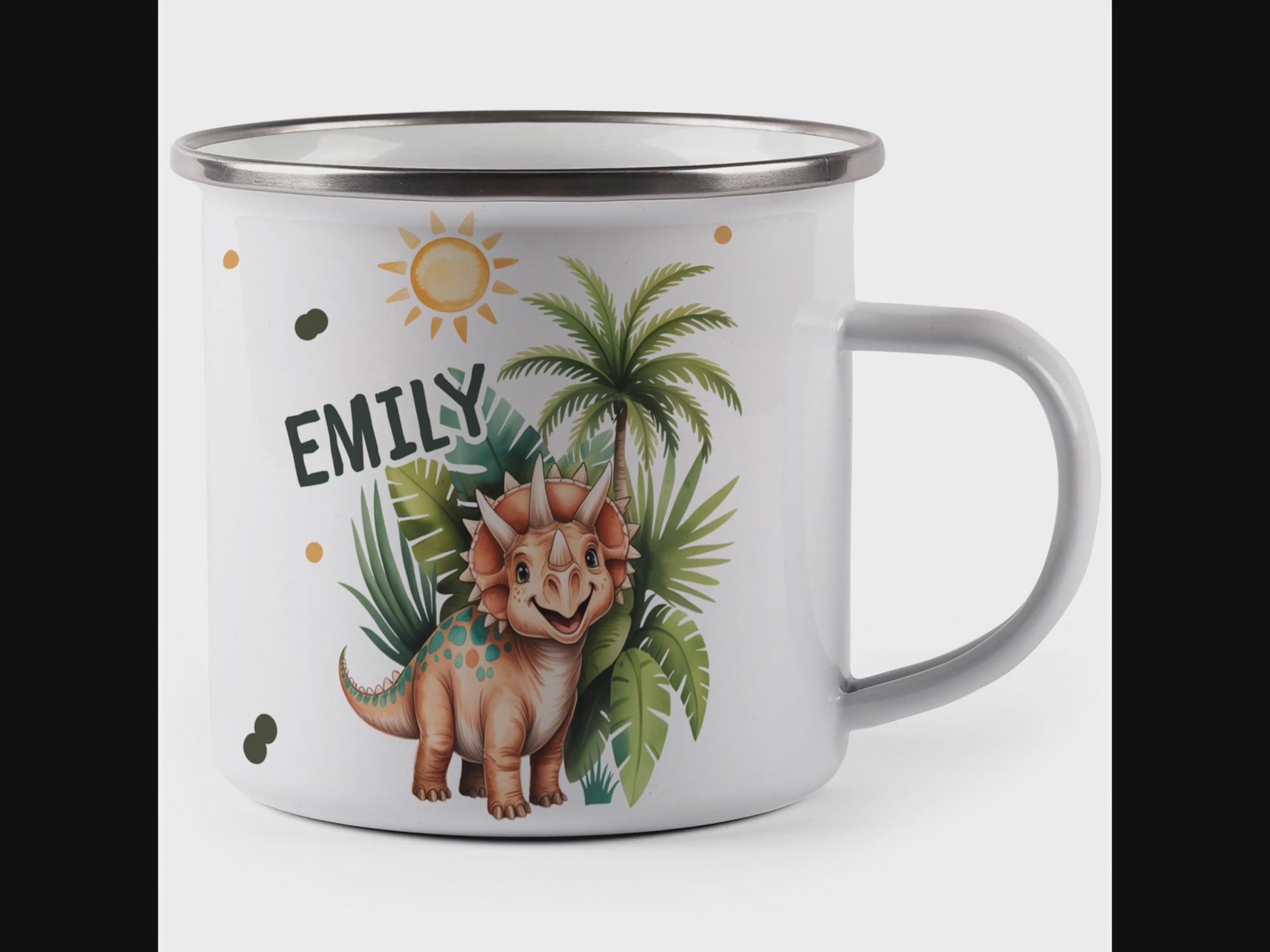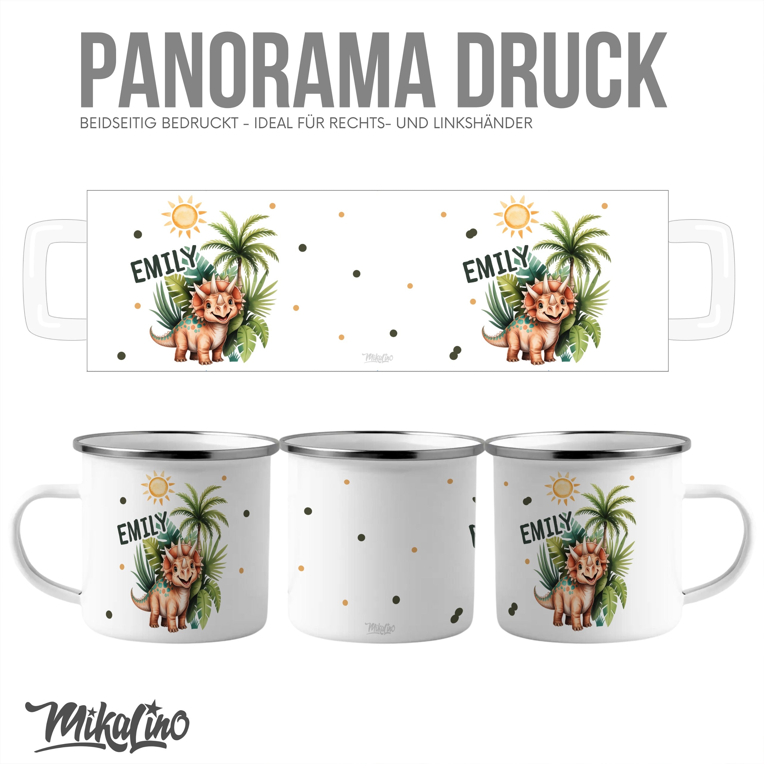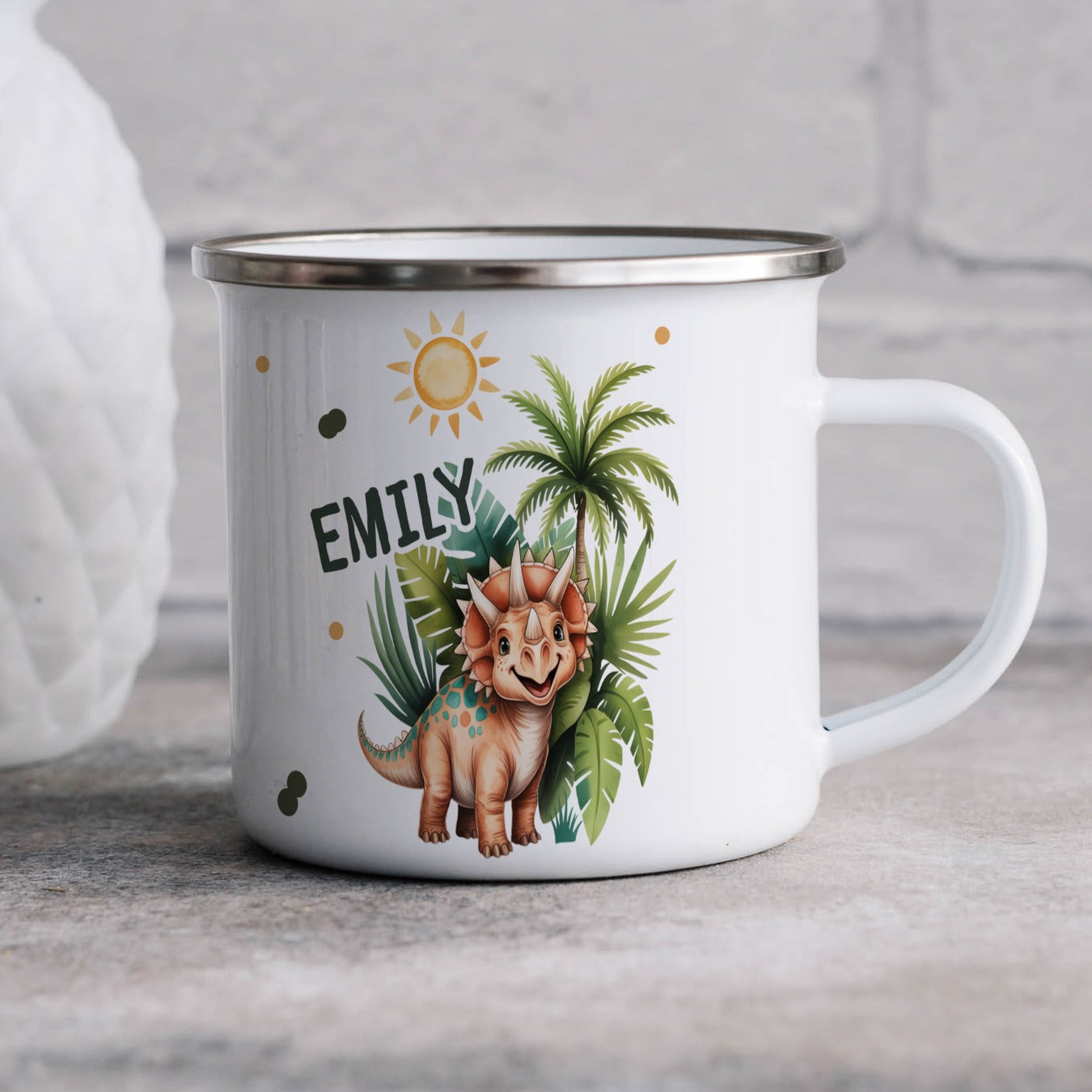 Die personalisierte Emaille Tasse mit Dino fröhlicher Triceratops-Motiv von MIKALINO ist das perfekte Geschenk für Kinder, die sich für die Welt der Dinosaurier und spannende Abenteuer begeistern. Jede Tasse wird mit deinem Wunschnamen bedruckt und so zu einem ganz persönlichen Unikat.