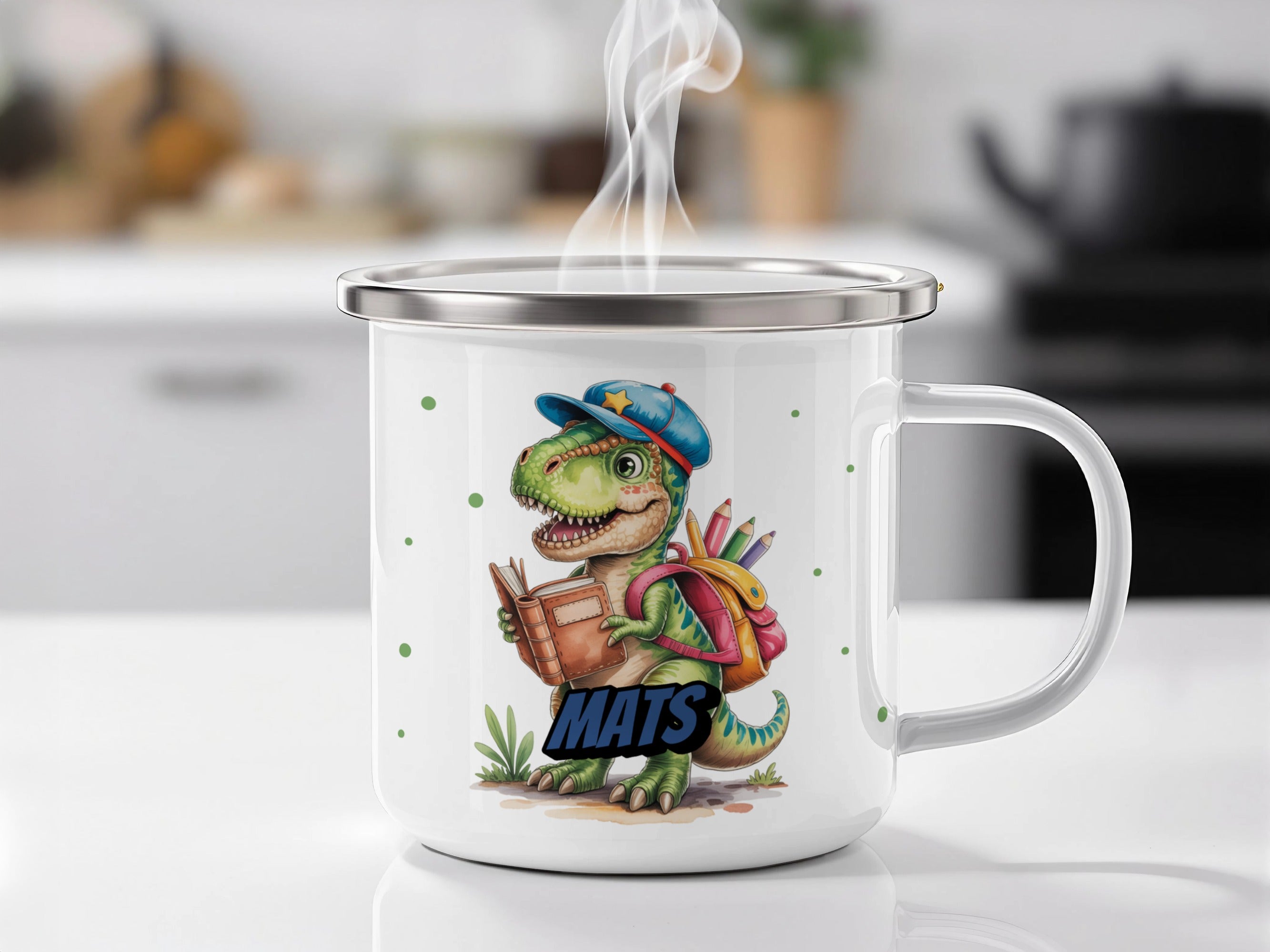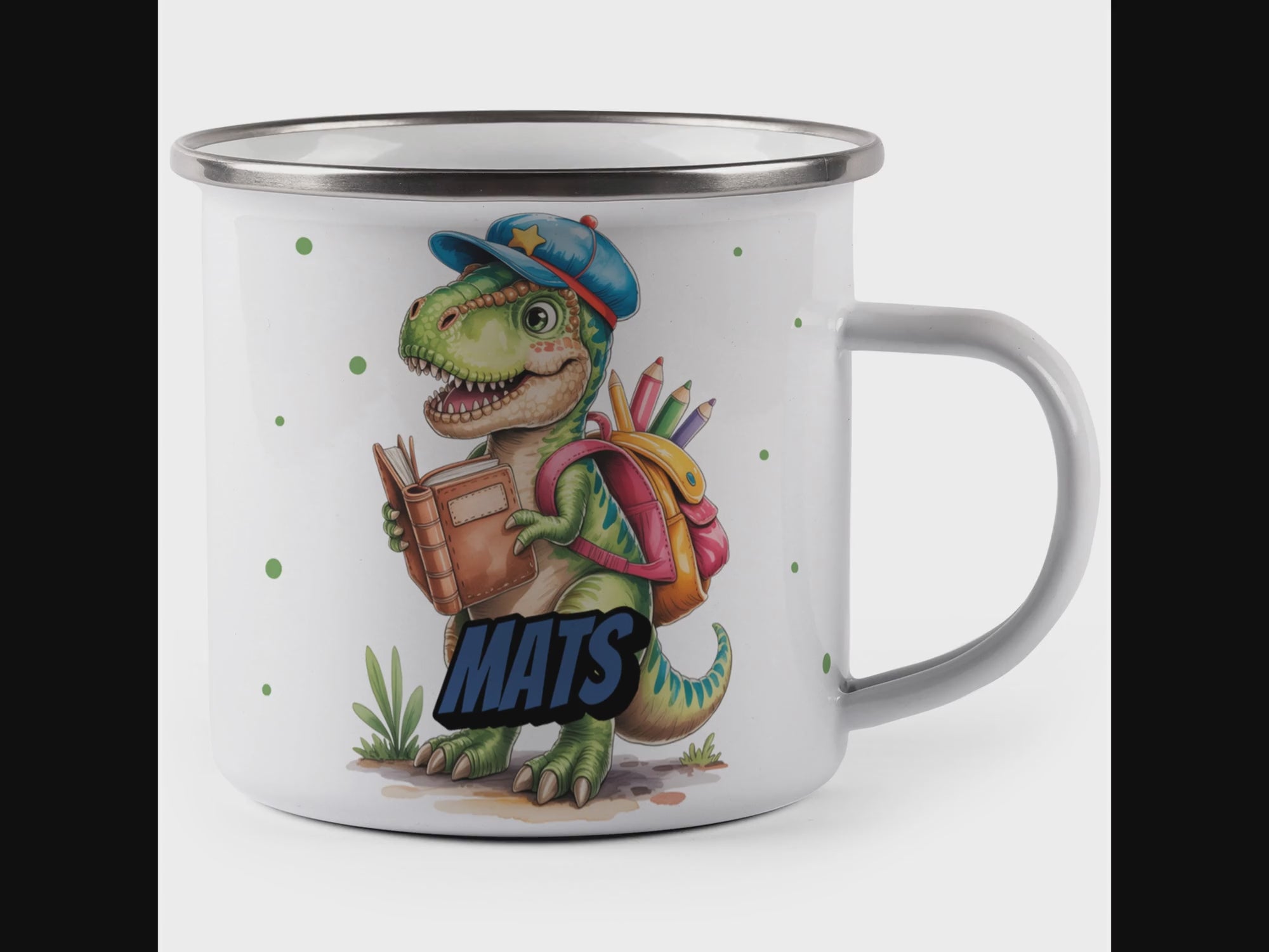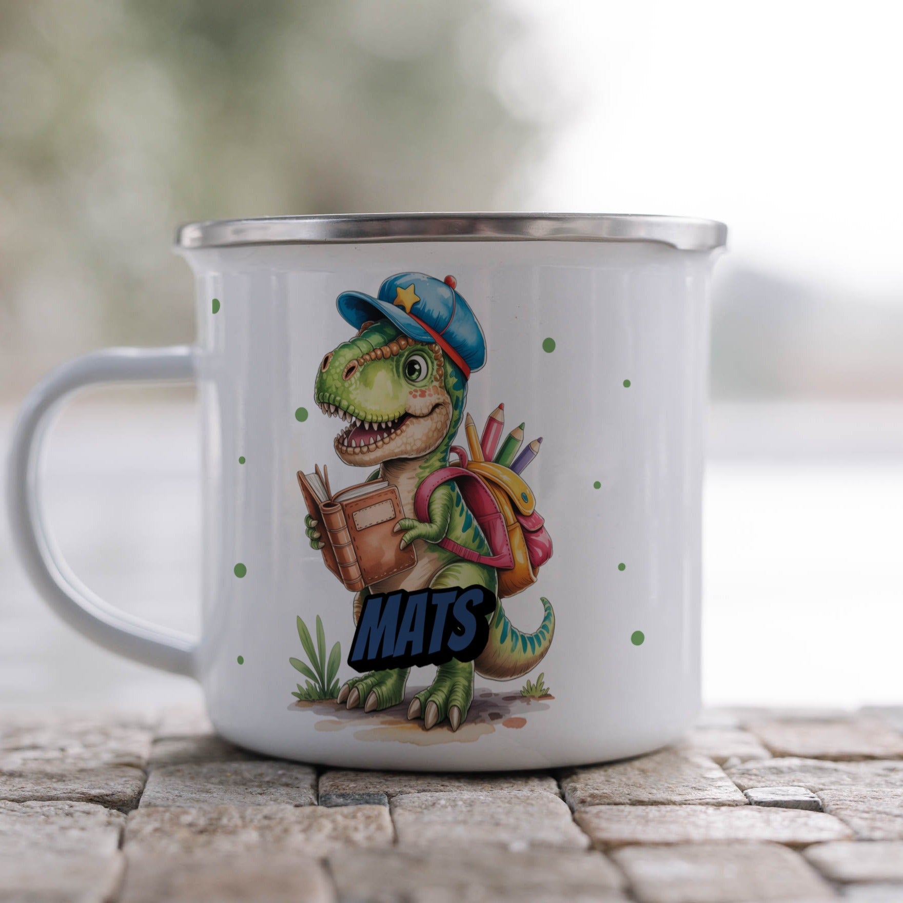 Die personalisierte Emaille Tasse mit Dino mit Ranzen-Motiv von MIKALINO ist das perfekte Geschenk für Kinder, die Dinosaurier lieben und ein besonderes Geschenk zur Einschulung oder für die Kita suchen. Jede Tasse wird mit deinem Wunschnamen bedruckt und so zu einem ganz persönlichen Unikat.