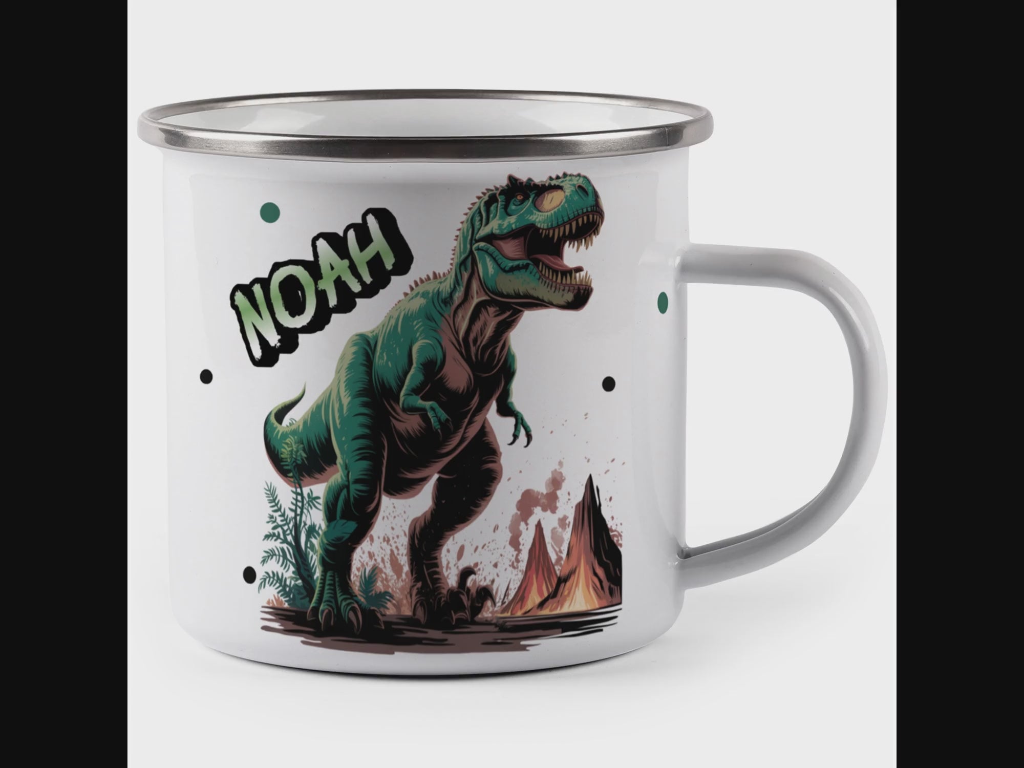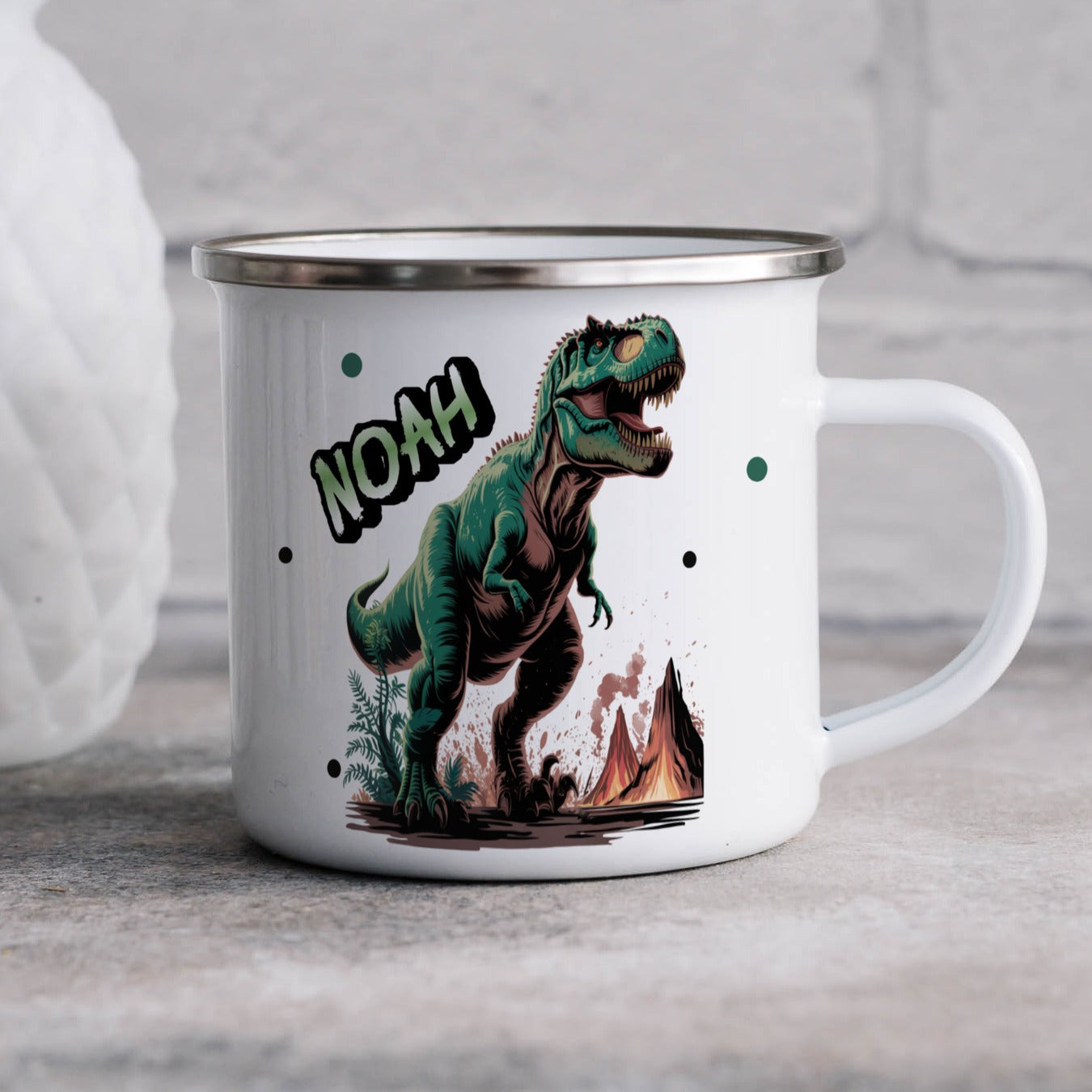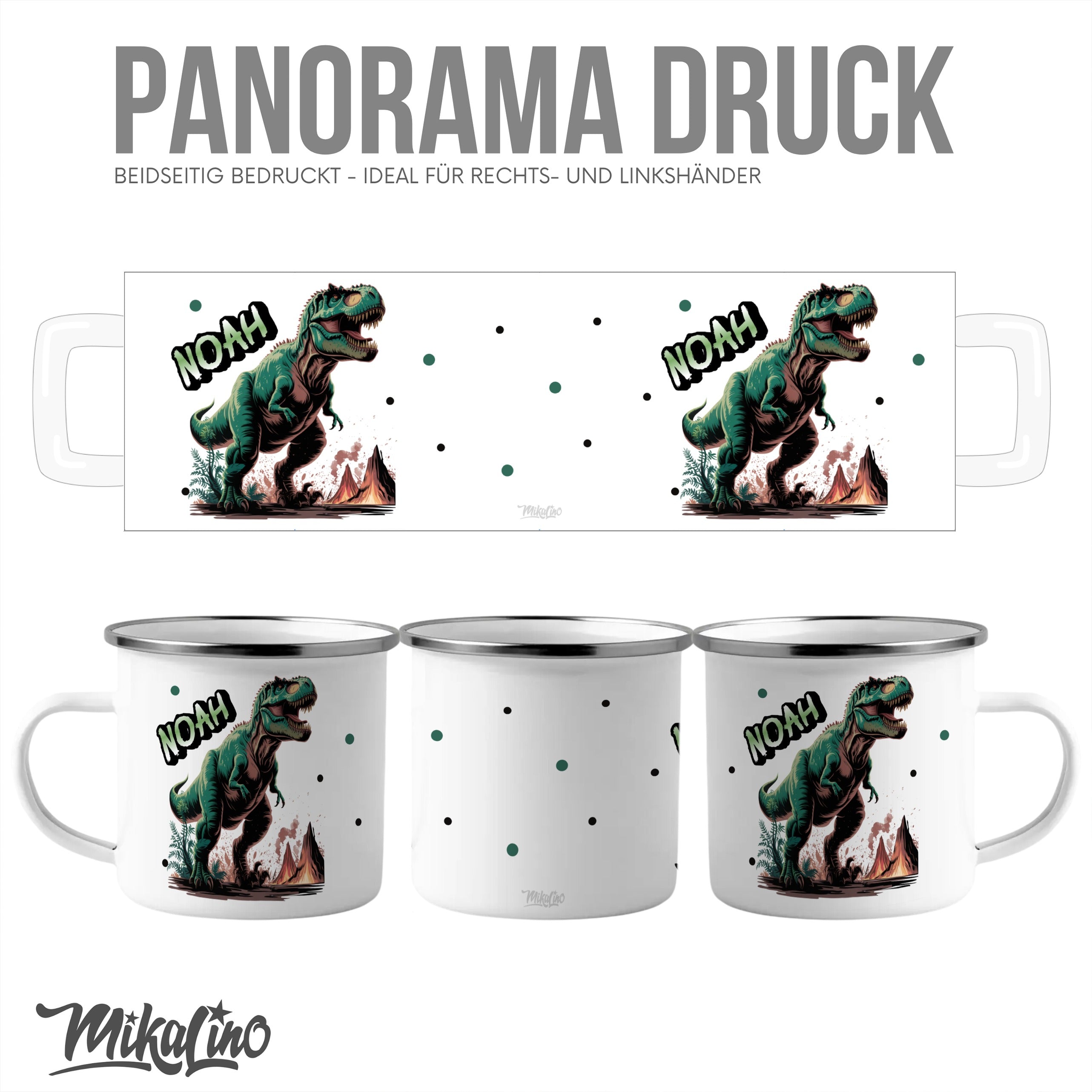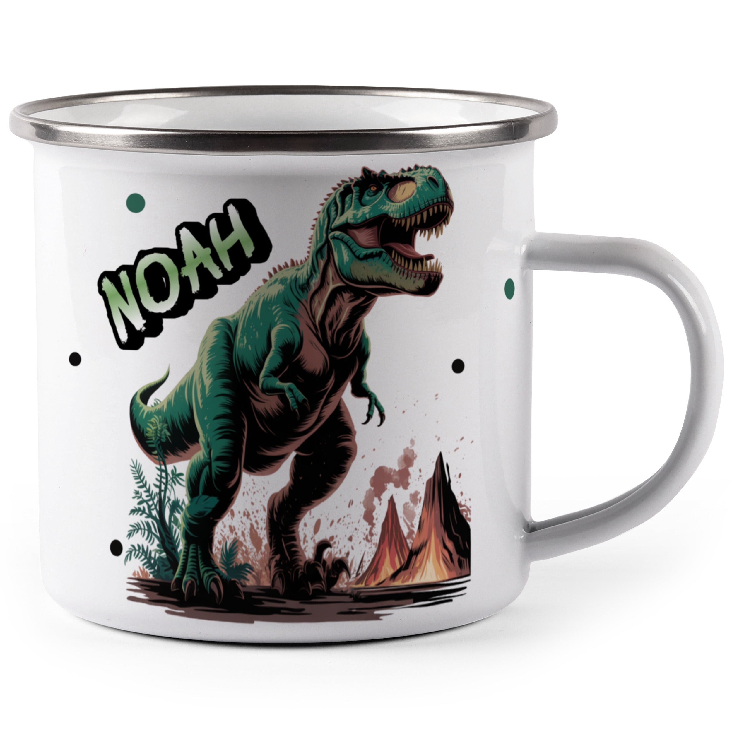 Die personalisierte Emaille Tasse mit Dinosaurier gefährlicher T Rex-Motiv von MIKALINO ist das perfekte Geschenk für Kinder, die sich für die Welt der Dinosaurier und spannende Abenteuer begeistern. Jede Tasse wird mit deinem Wunschnamen bedruckt und so zu einem ganz persönlichen Unikat.