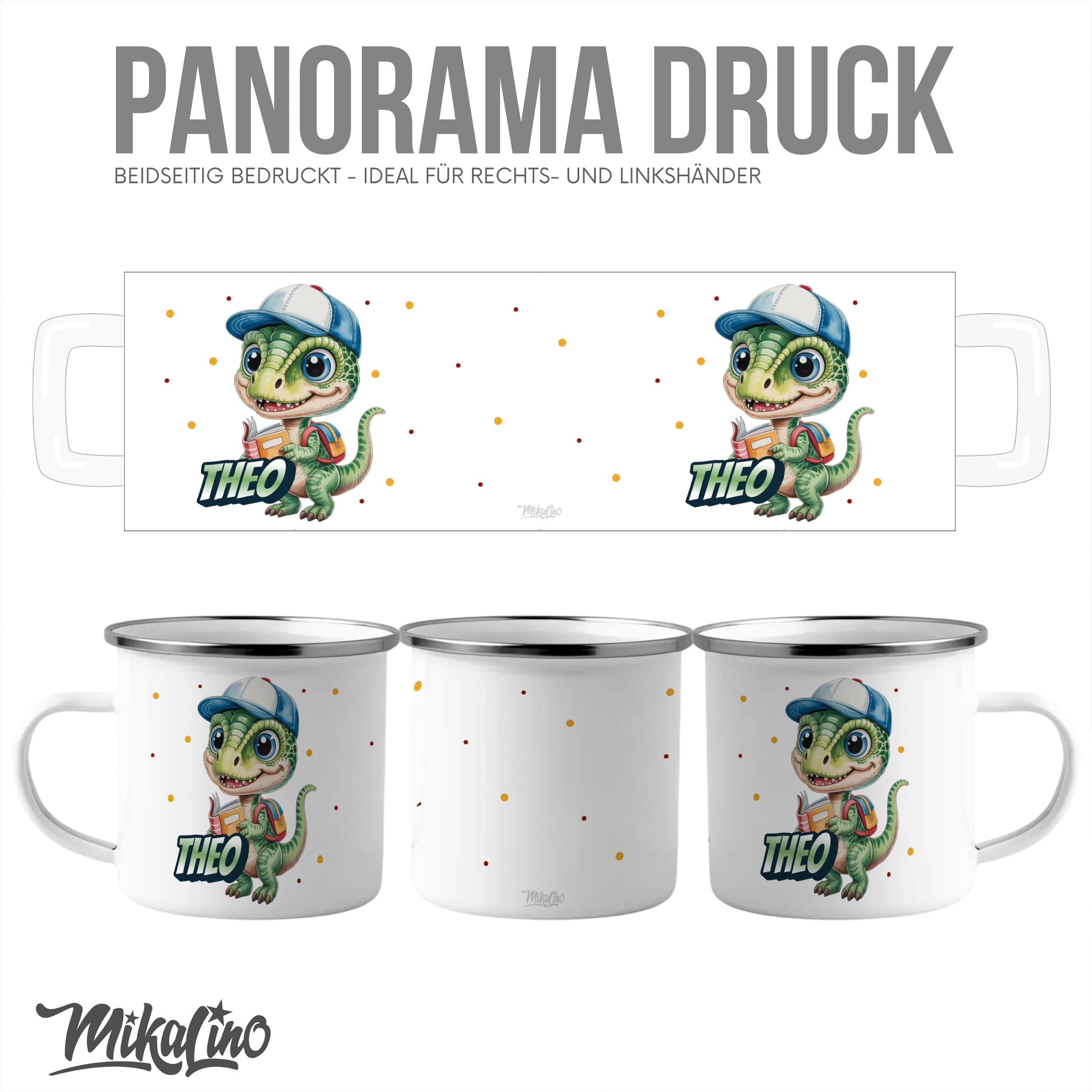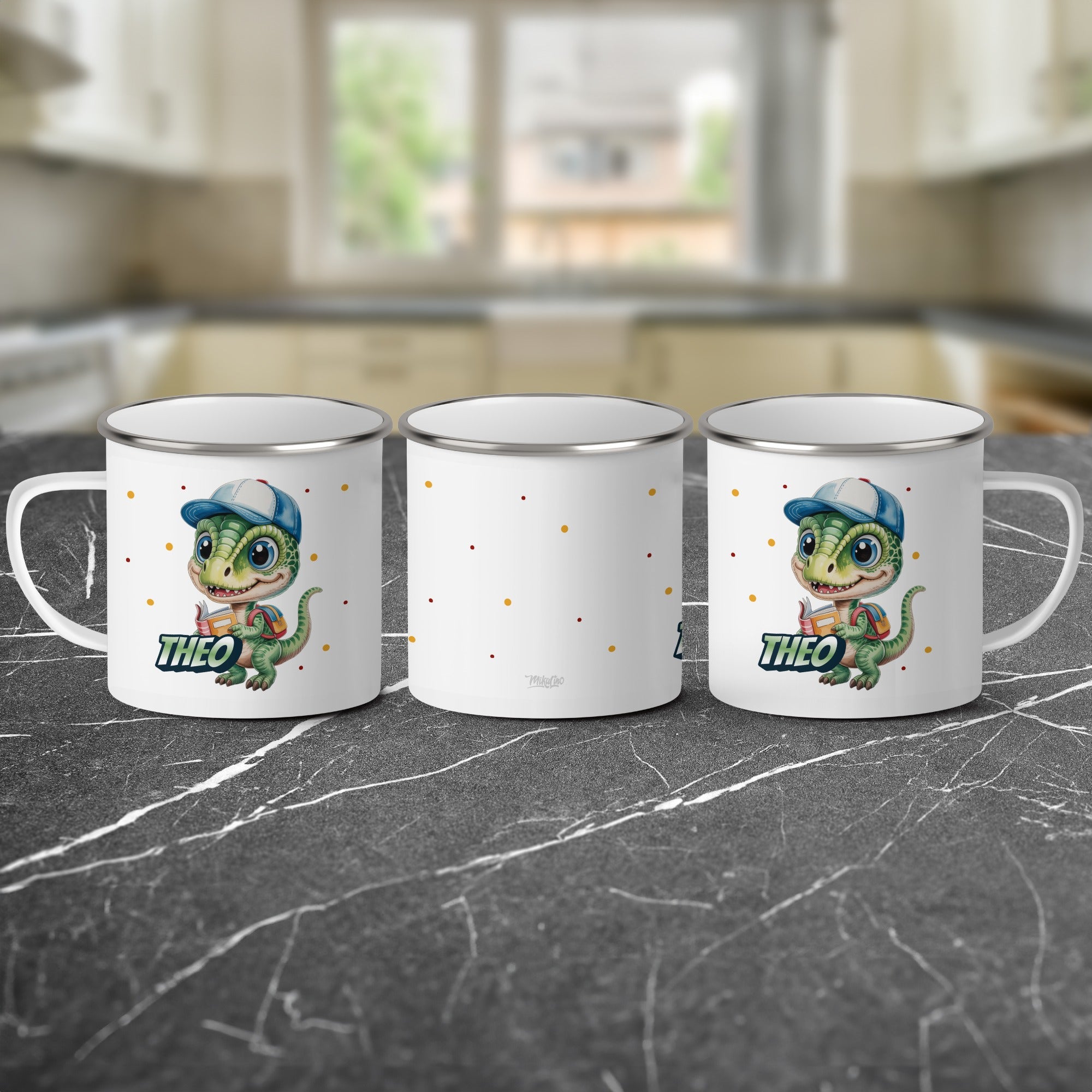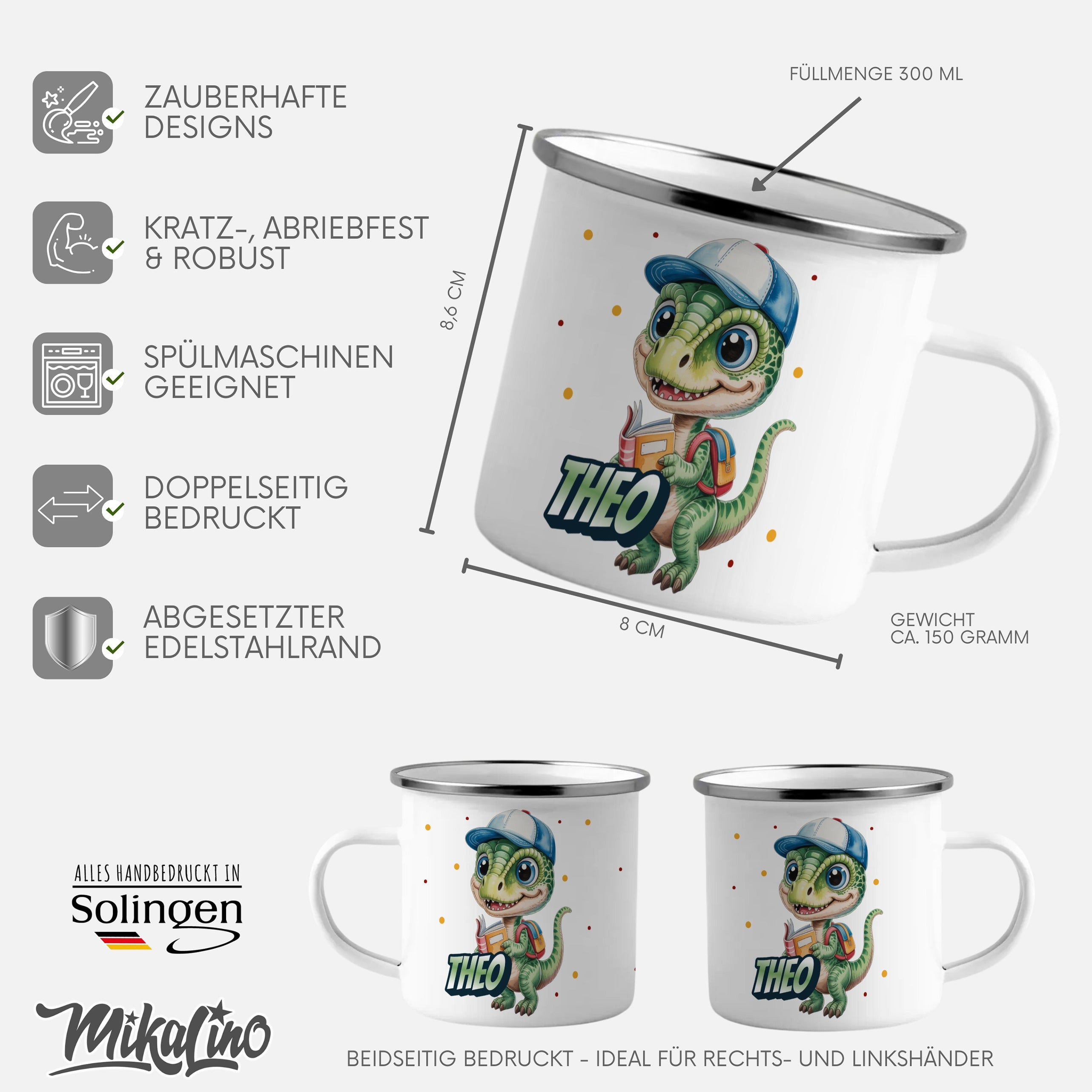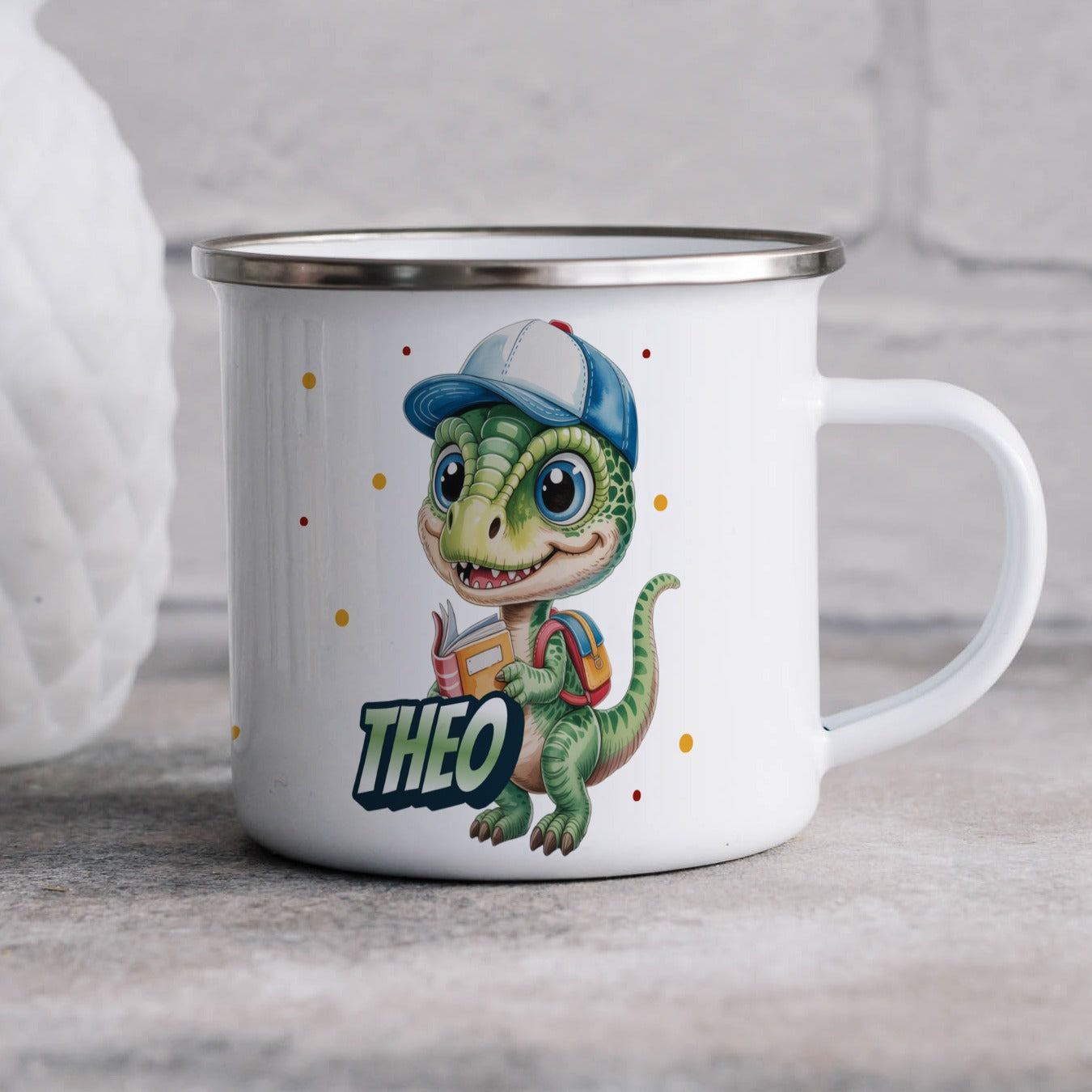 Emaille Tasse Kleiner Schul-Dino personalisiert mit Namen Kinder Becher mit Motiv – Emaille Becher für Jungen & Mädchen – Camping Tasse leicht & robust Geschenkidee Kindertasse (7322)