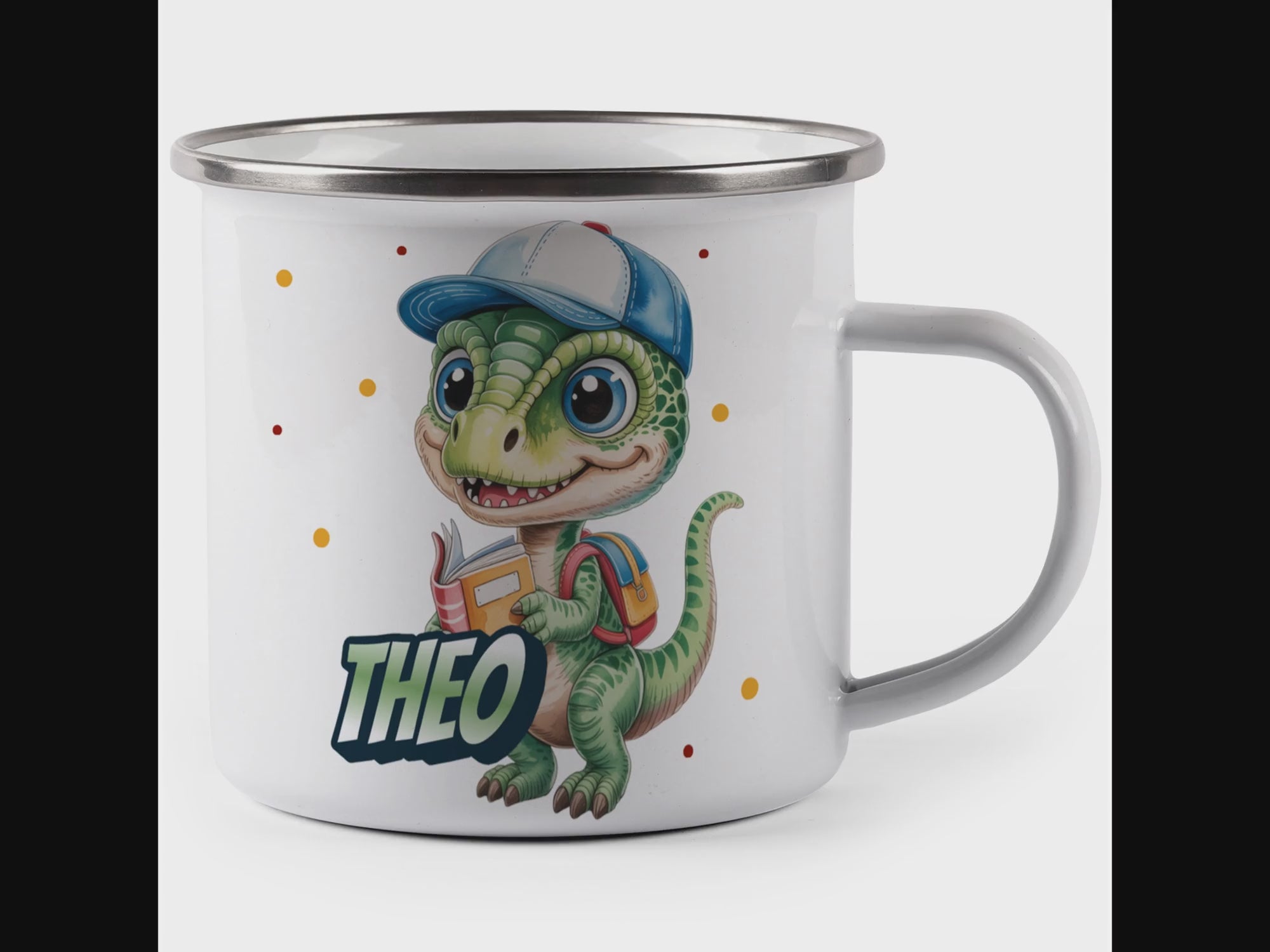 Die personalisierte Emaille Tasse mit Kleiner Schul-Dino-Motiv von MIKALINO ist das perfekte Geschenk für kleine Dino-Fans, die Lesen, Lernen und Abenteuer verbinden möchten. Jede Tasse wird mit deinem Wunschnamen bedruckt und so zu einem ganz persönlichen Unikat.