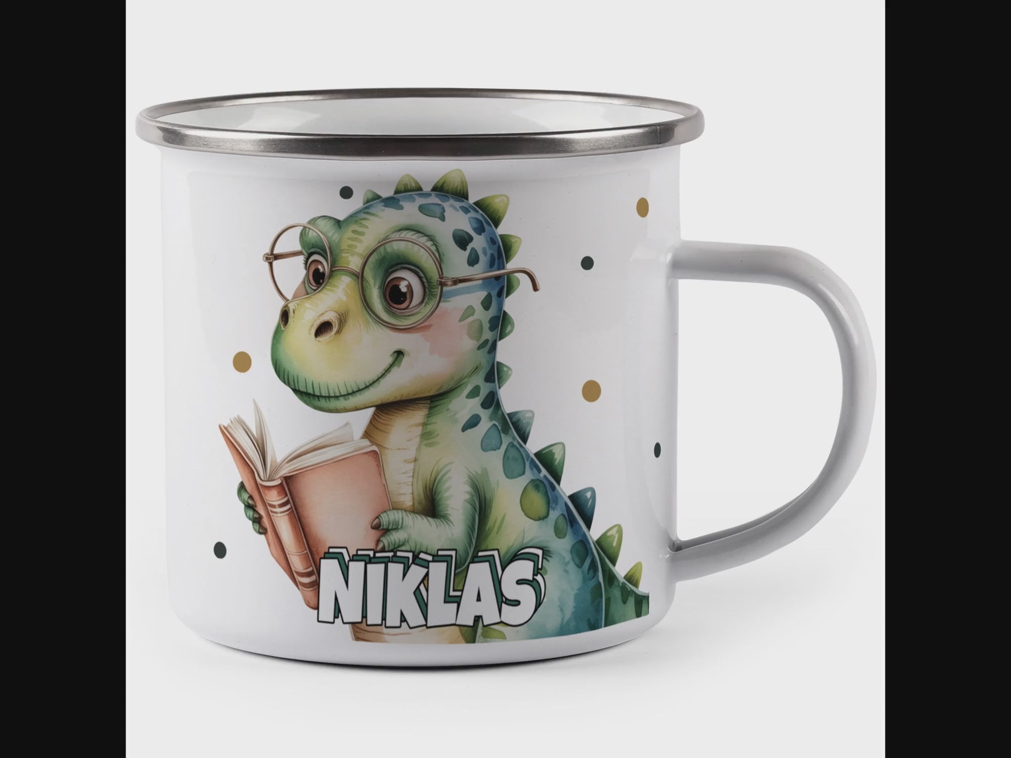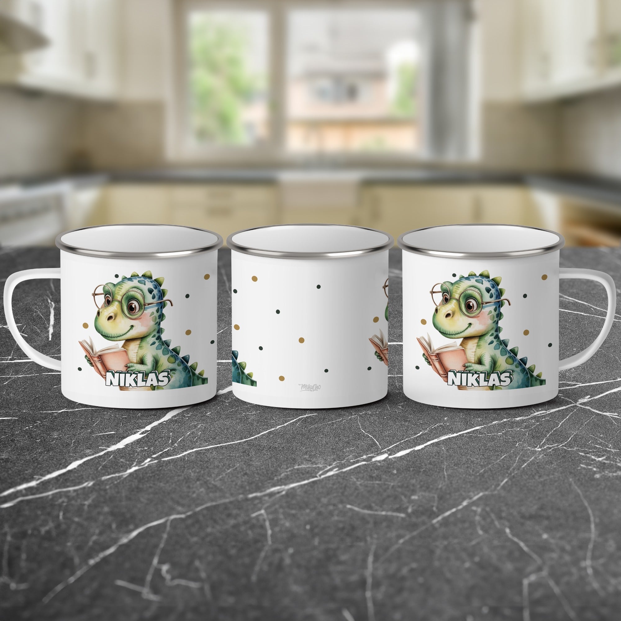 Die personalisierte Emaille Tasse mit Schlauer Dino-Motiv von MIKALINO ist das perfekte Geschenk für kleine Bücherwürmer und Dinosaurier-Fans, die Freude am Lesen haben. Jede Tasse wird mit deinem Wunschnamen bedruckt und so zu einem ganz persönlichen Unikat.