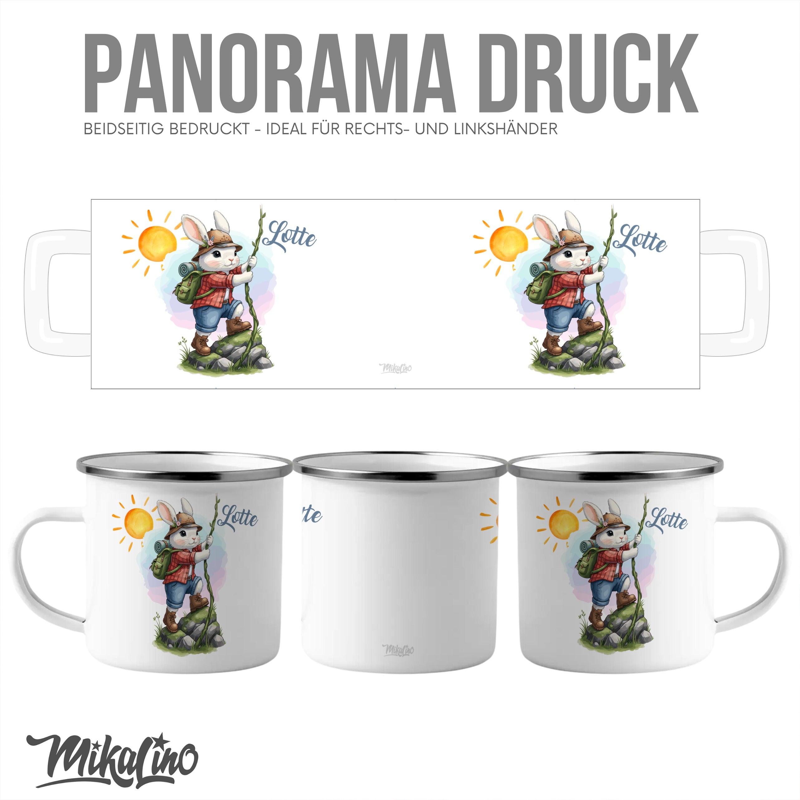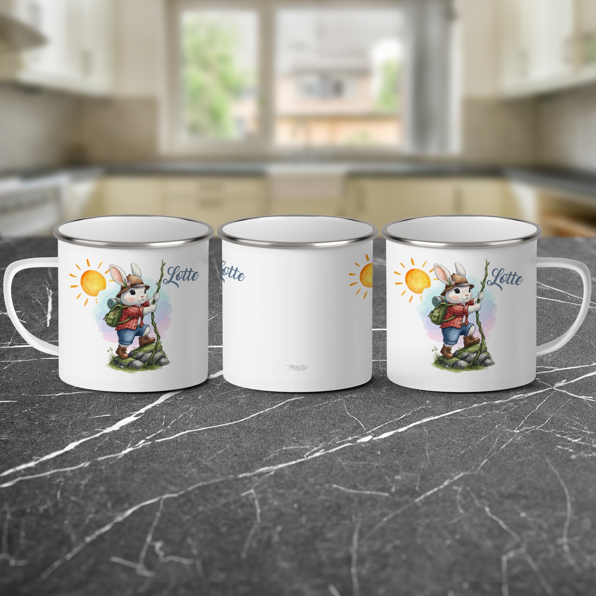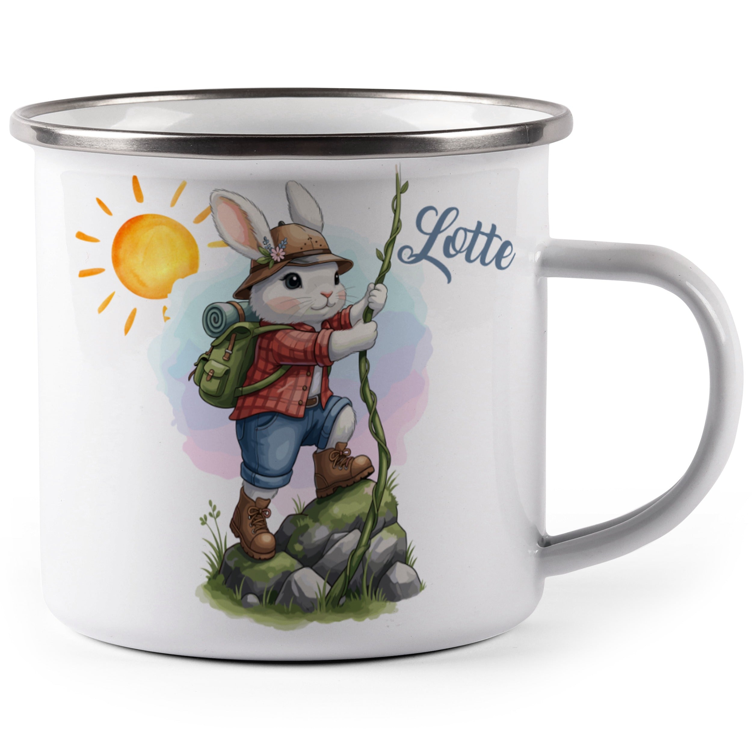 Emaille Tasse Hase mit Rucksack und Wanderstock personalisiert mit Namen Kinder Becher mit Motiv – Emaille Becher für Jungen & Mädchen – Camping Tasse leicht & robust Geschenkidee Kindertasse (7510)