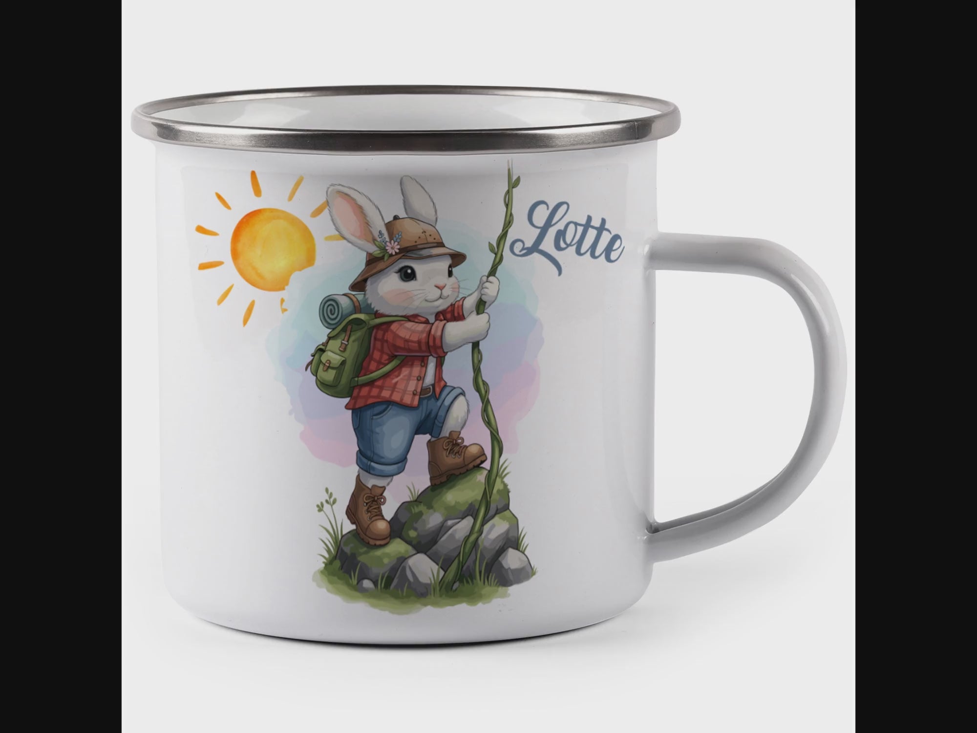 Die personalisierte Emaille Tasse mit Hase mit Rucksack und Wanderstock-Motiv von MIKALINO ist das perfekte Geschenk für alle, die das Wandern, die Berge und liebevoll gestaltete Tiermotive lieben – ideal als Geschenk für Naturfreunde und kleine Abenteurer.. Jede Tasse wird mit deinem Wunschnamen bedruckt und so zu einem ganz persönlichen Unikat.