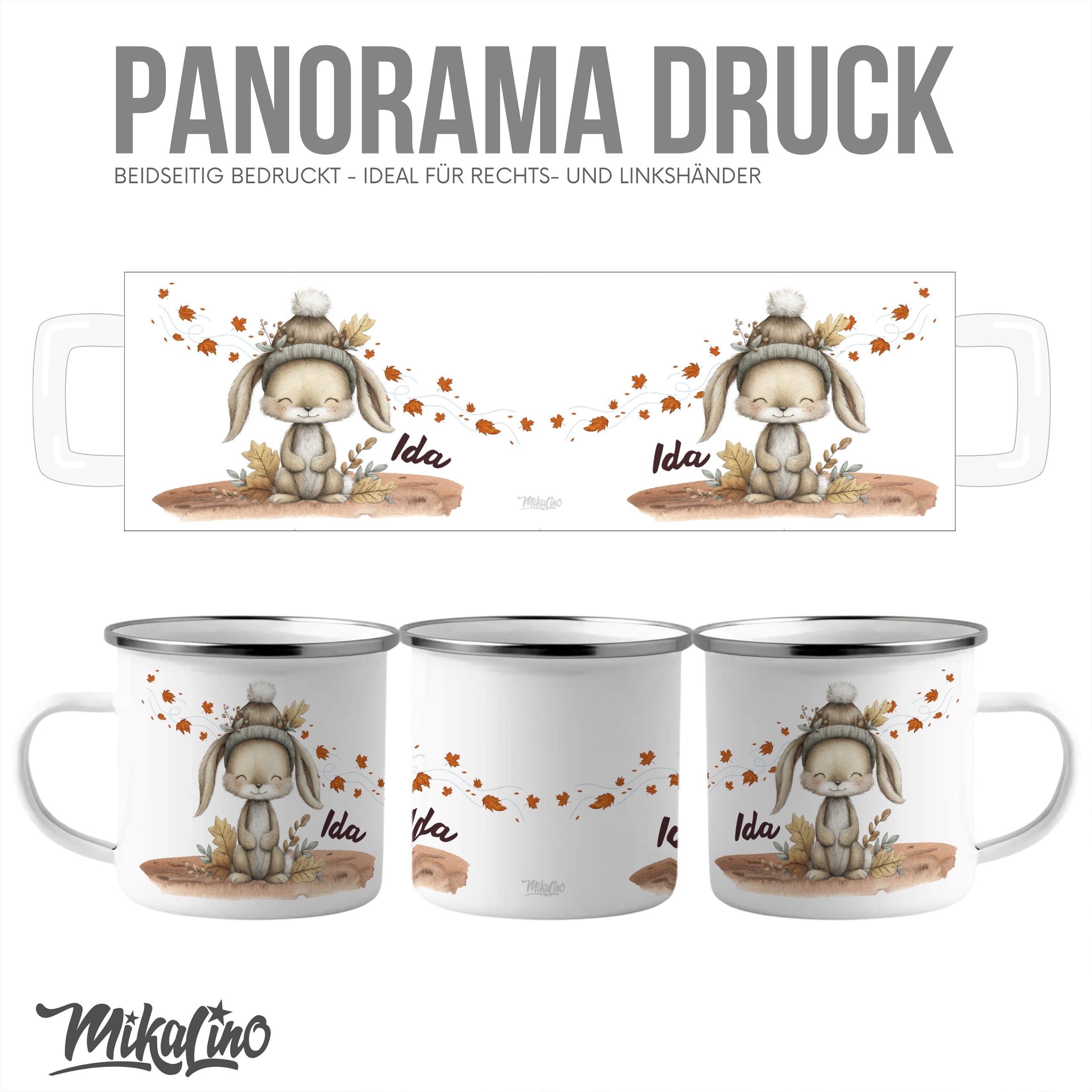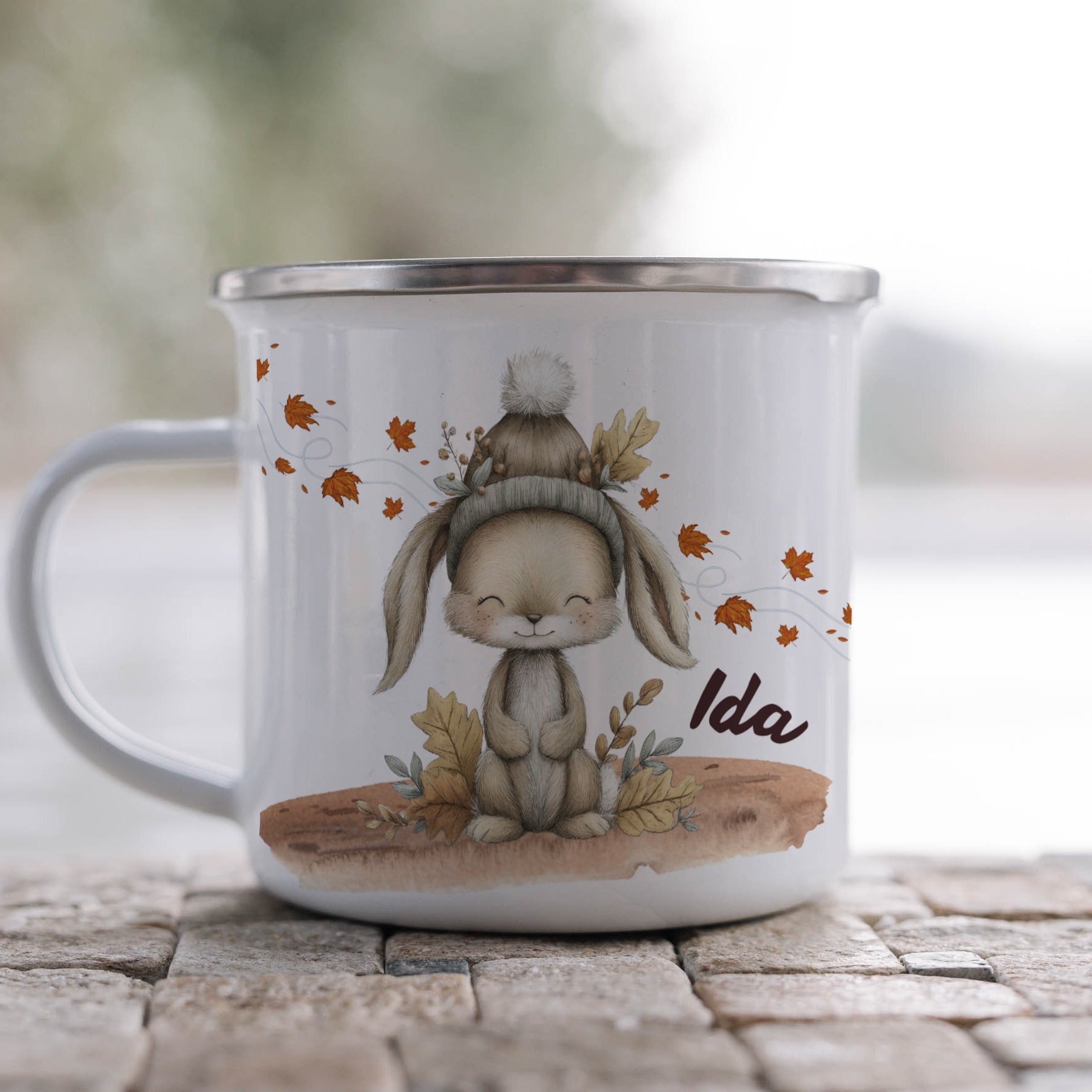 Emaille Tasse Hase Motiv liebevolles Waldtier Design personalisiert mit Namen Kinder Becher mit Motiv – Emaille Becher für Jungen & Mädchen – Camping Tasse leicht & robust Geschenkidee Kindertasse (7514)