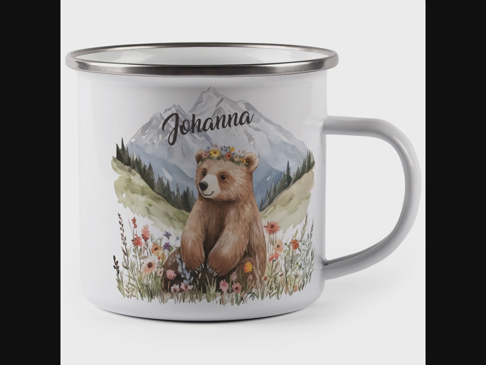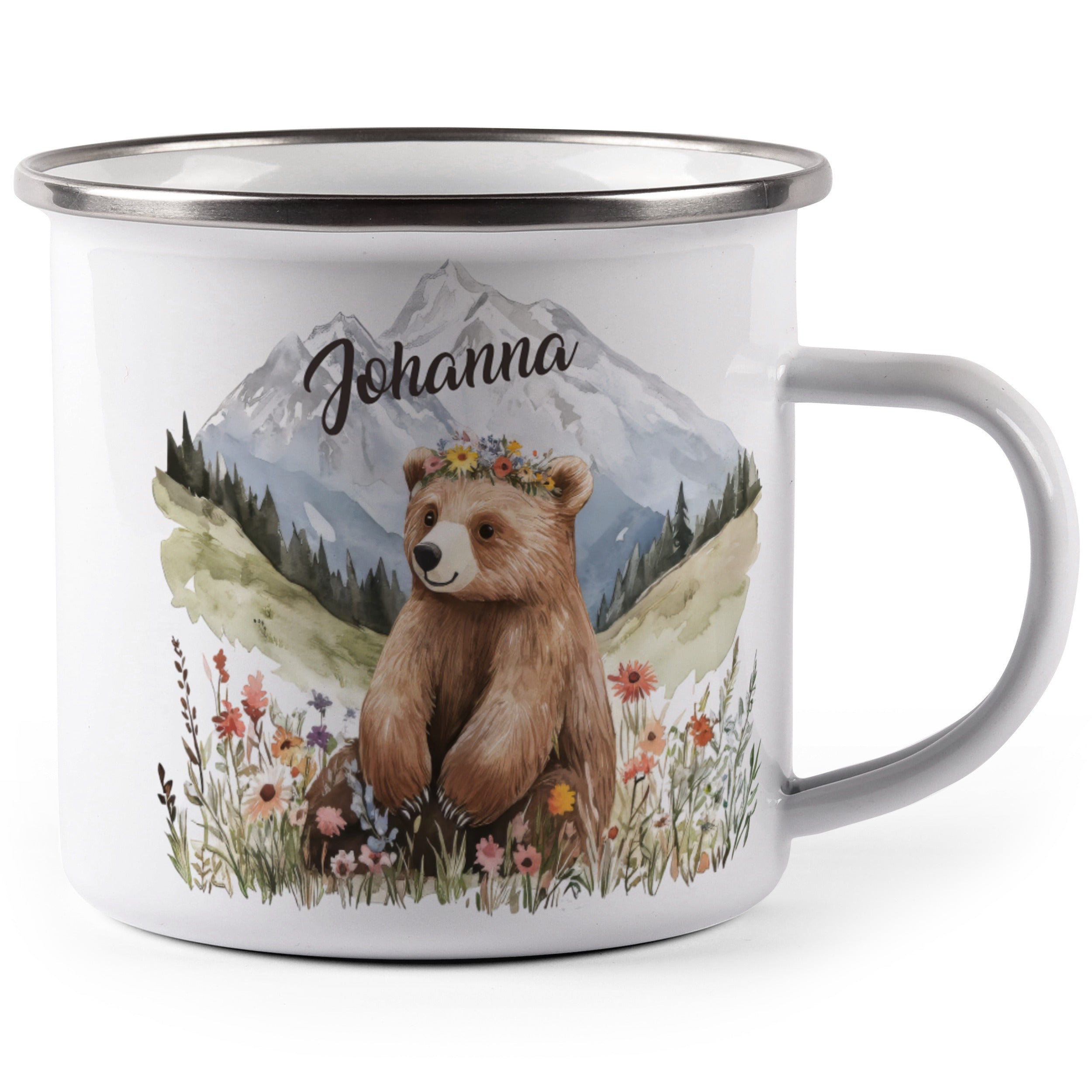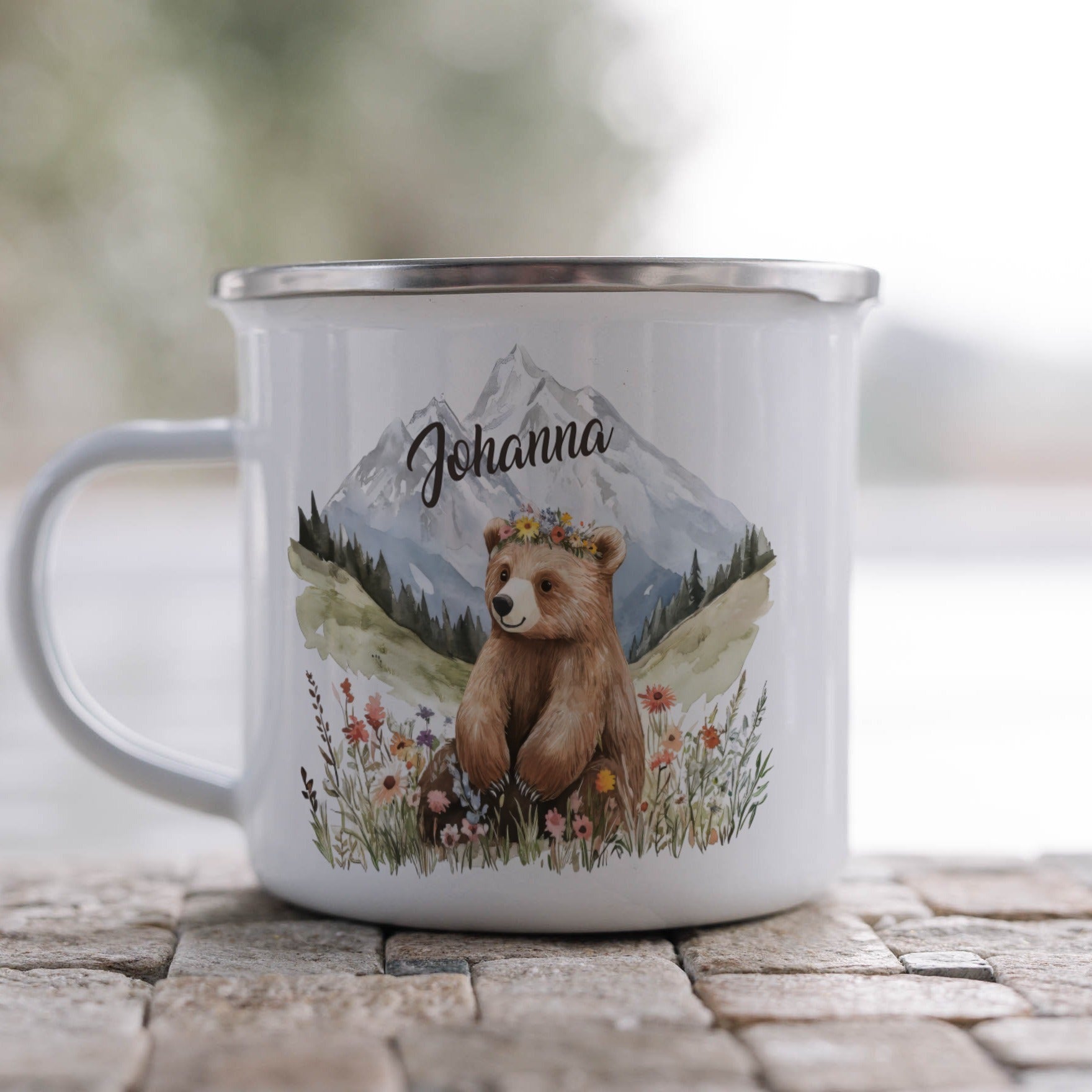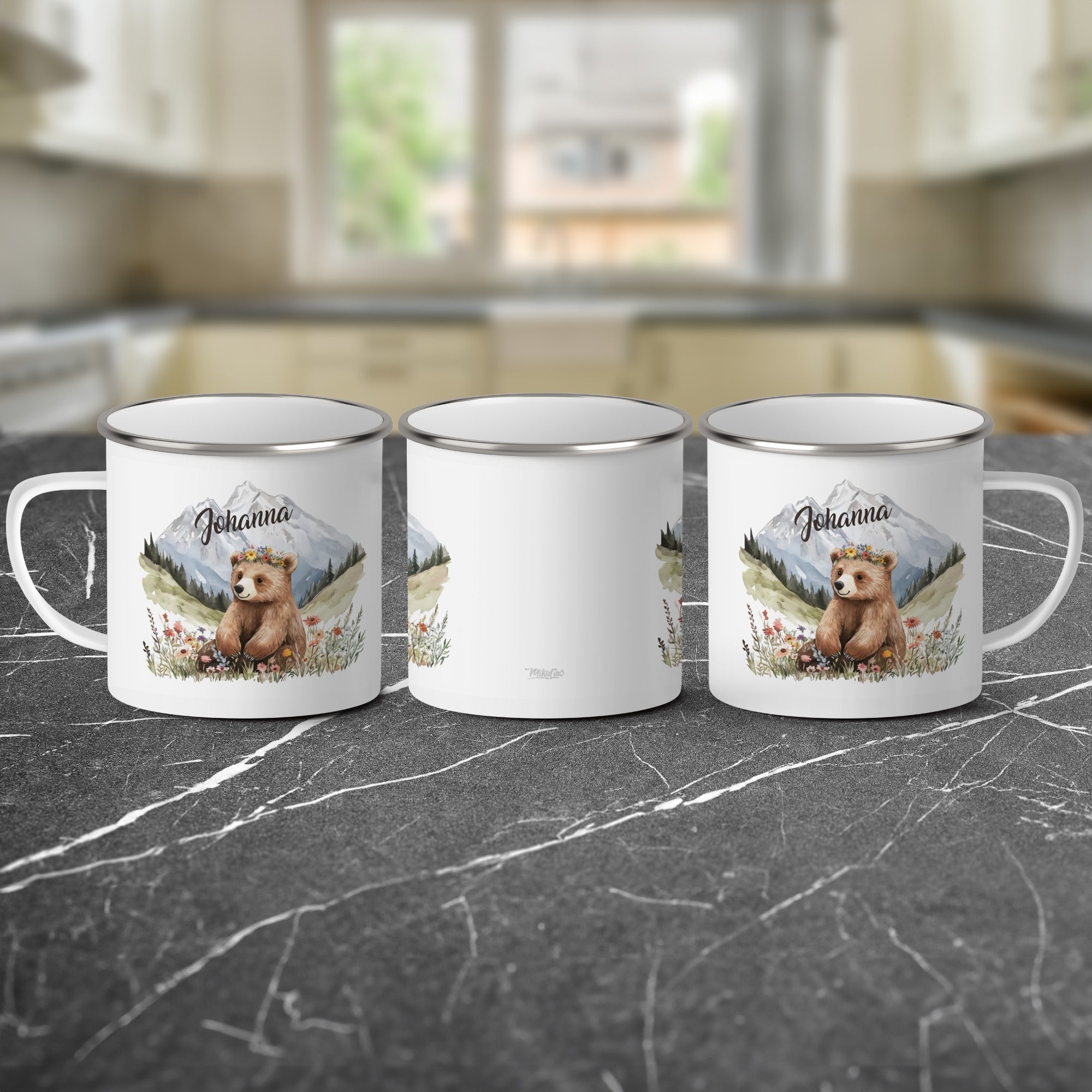 Die personalisierte Emaille Tasse mit Bär Motiv liebevolles Waldtier Design-Motiv von MIKALINO ist das perfekte Geschenk für alle, die Bären und liebevoll illustrierte Tiermotive lieben – der Braunbär mit Blumenkranz vor malerischer Bergkulisse vereint Stärke, Sanftheit und die Schönheit der Natur.. Jede Tasse wird mit deinem Wunschnamen bedruckt und so zu einem ganz persönlichen Unikat.