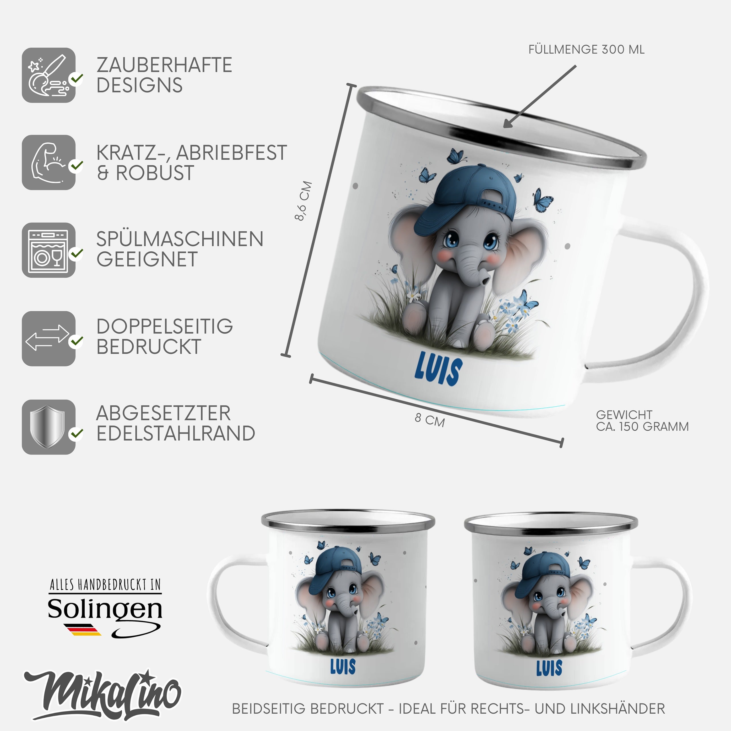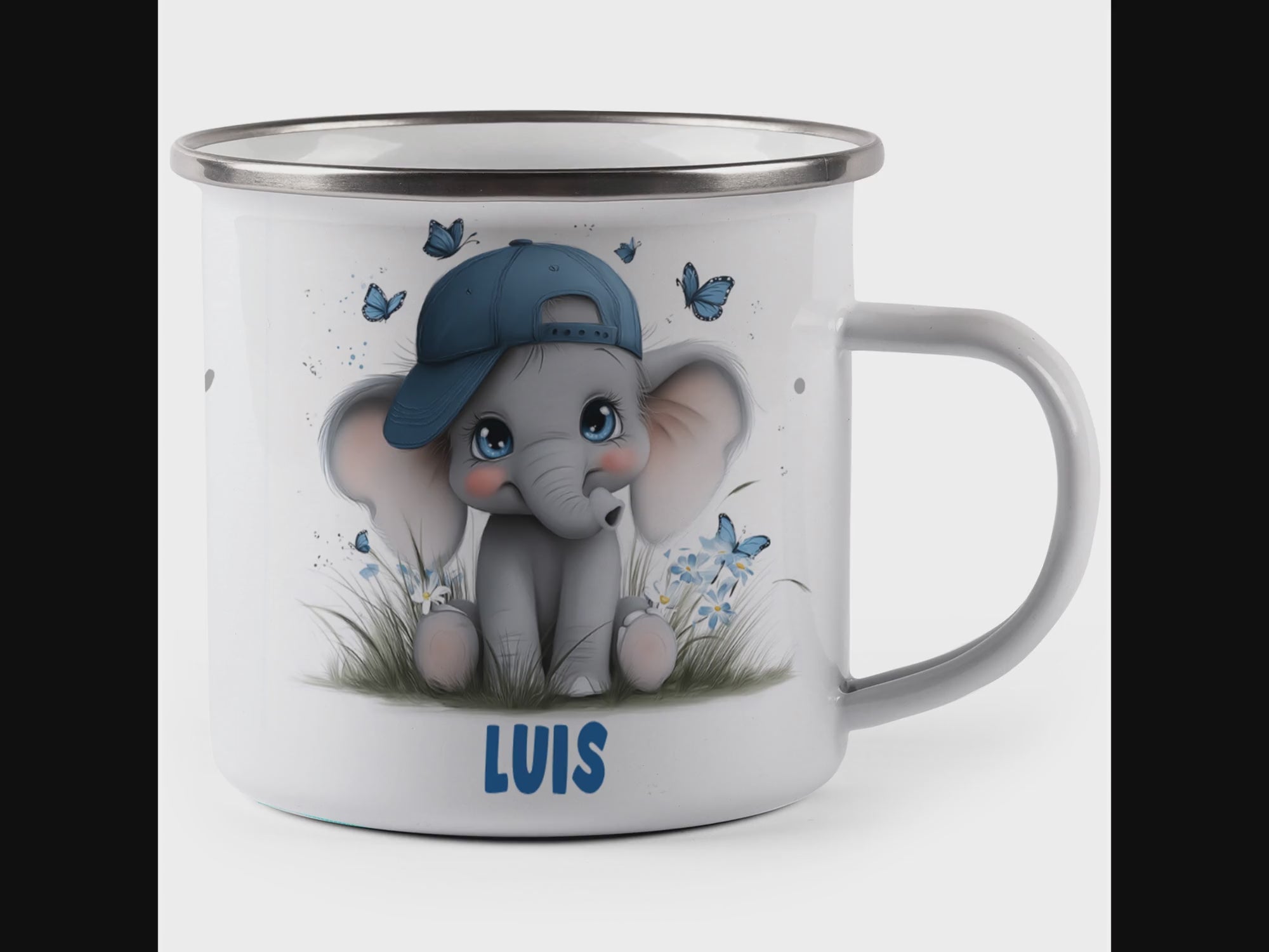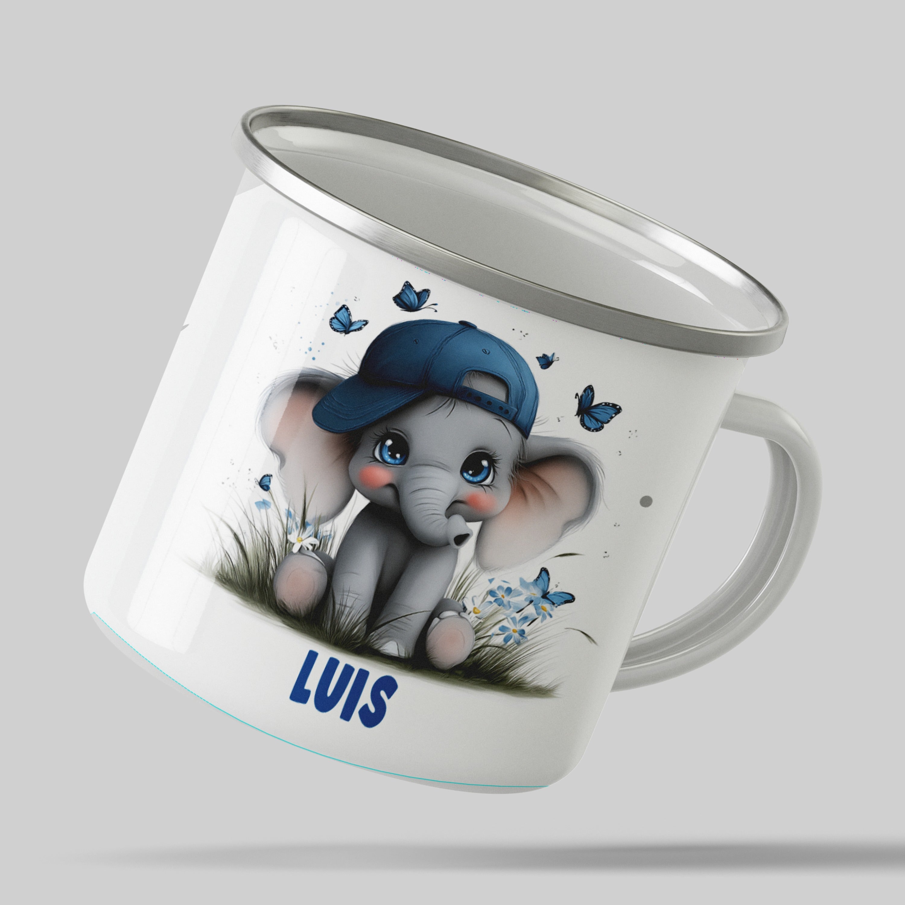 Die personalisierte Emaille Tasse mit Elefant Jungenmotiv – süßes Babymotiv-Motiv von MIKALINO ist das perfekte Geschenk für alle, die niedliche Tiermotive und liebevolle Geschenke für Kinder mögen – der kleine Elefant mit blauer Mütze und Schmetterlingen bringt Freude und Wärme in jedes Kinderherz.. Jede Tasse wird mit deinem Wunschnamen bedruckt und so zu einem ganz persönlichen Unikat.