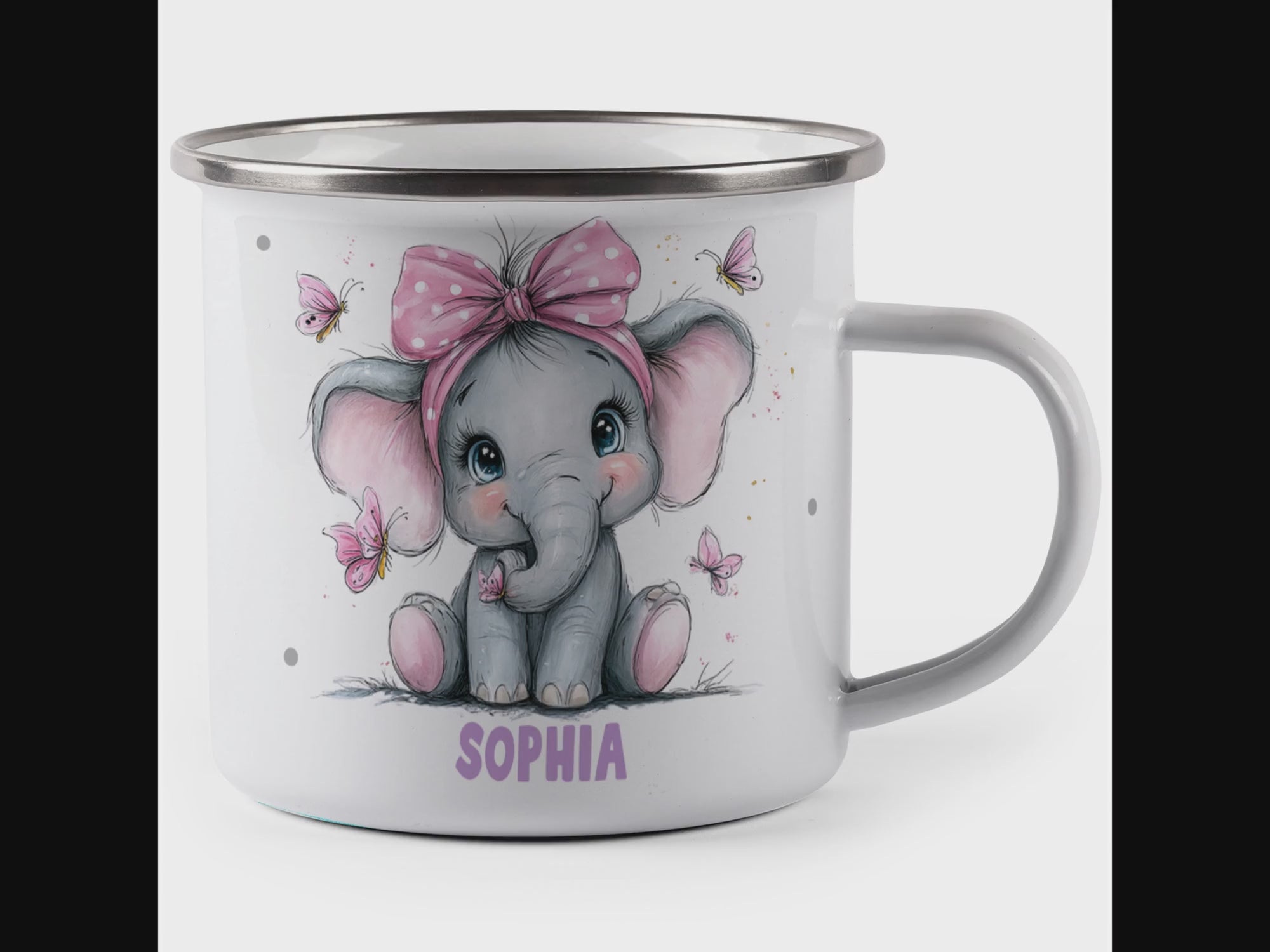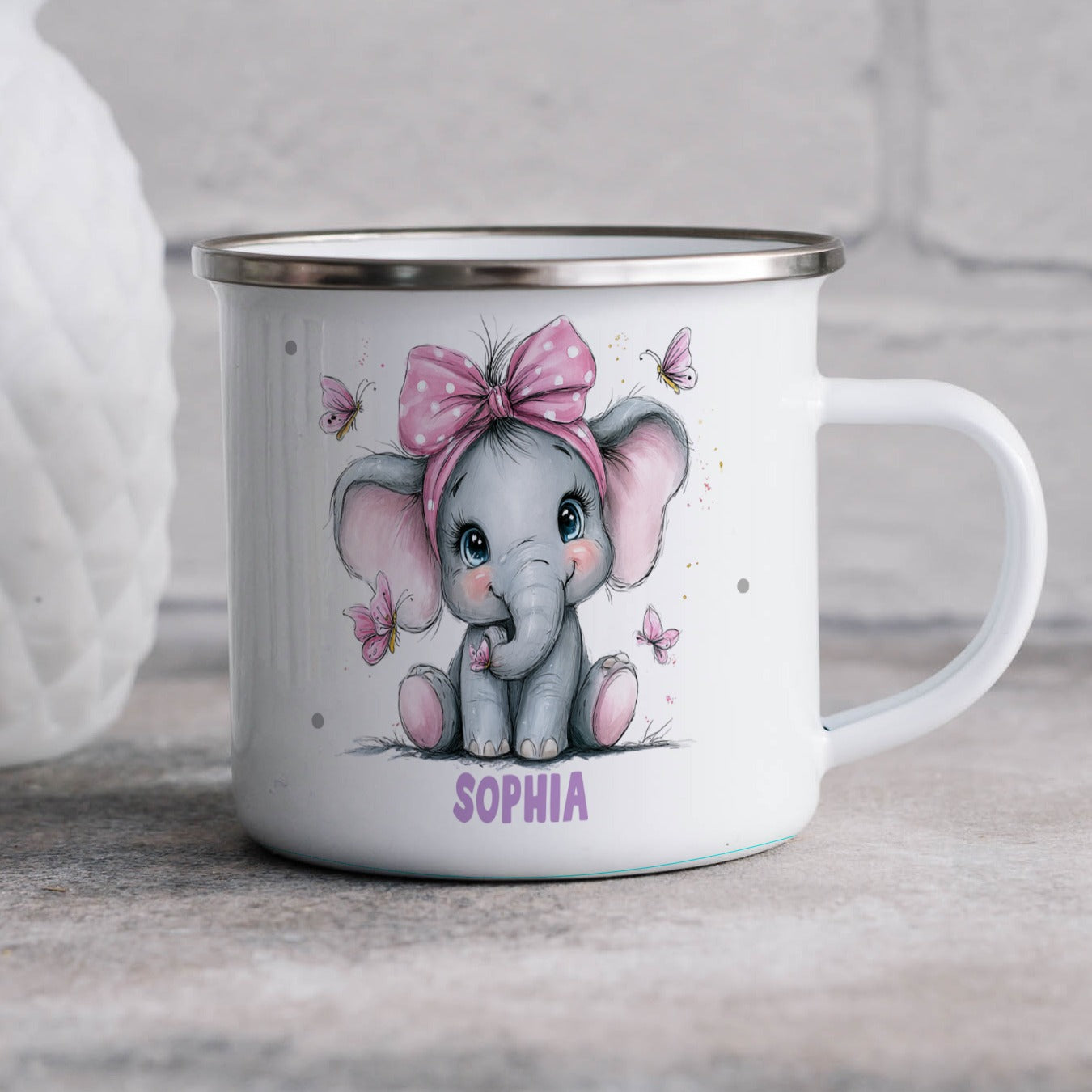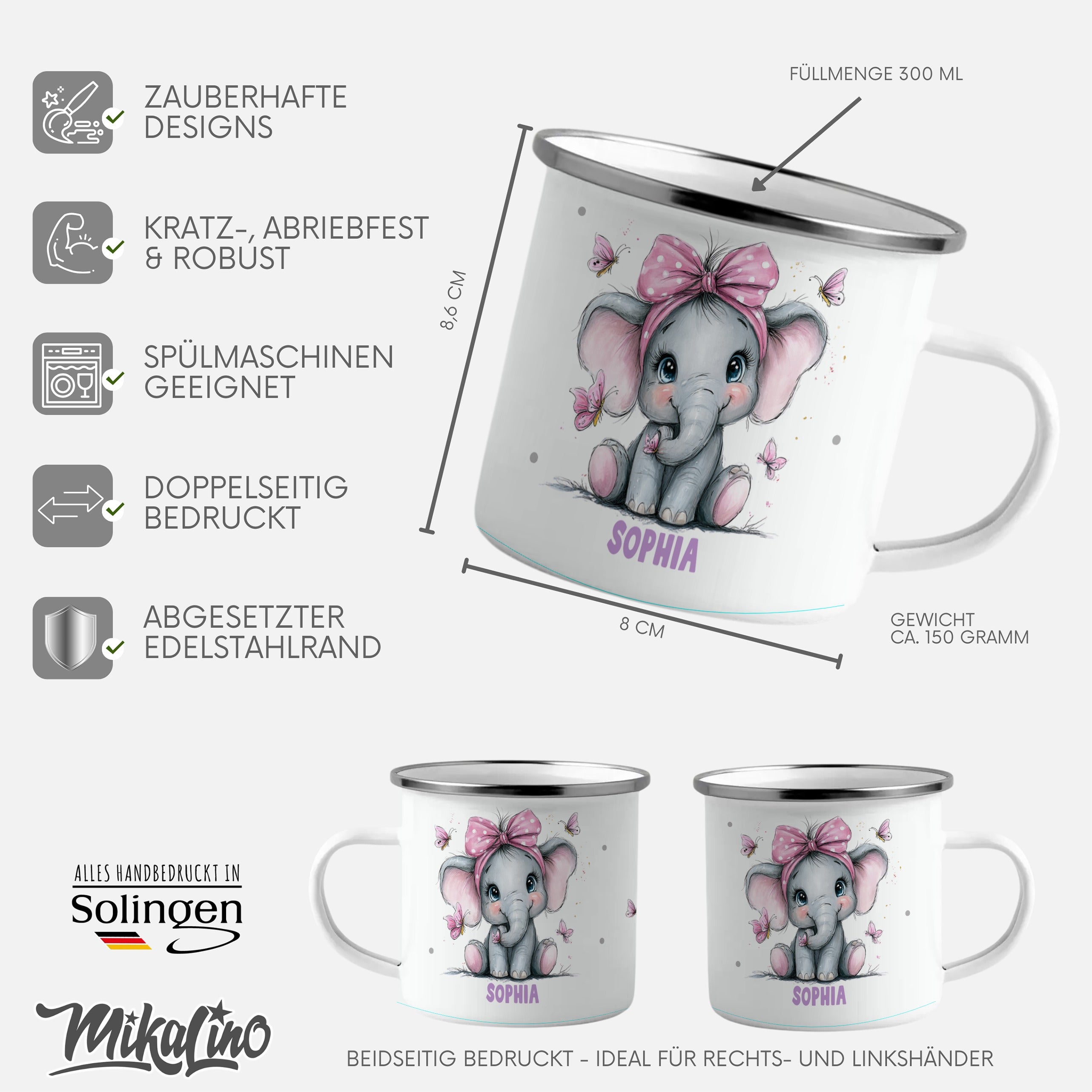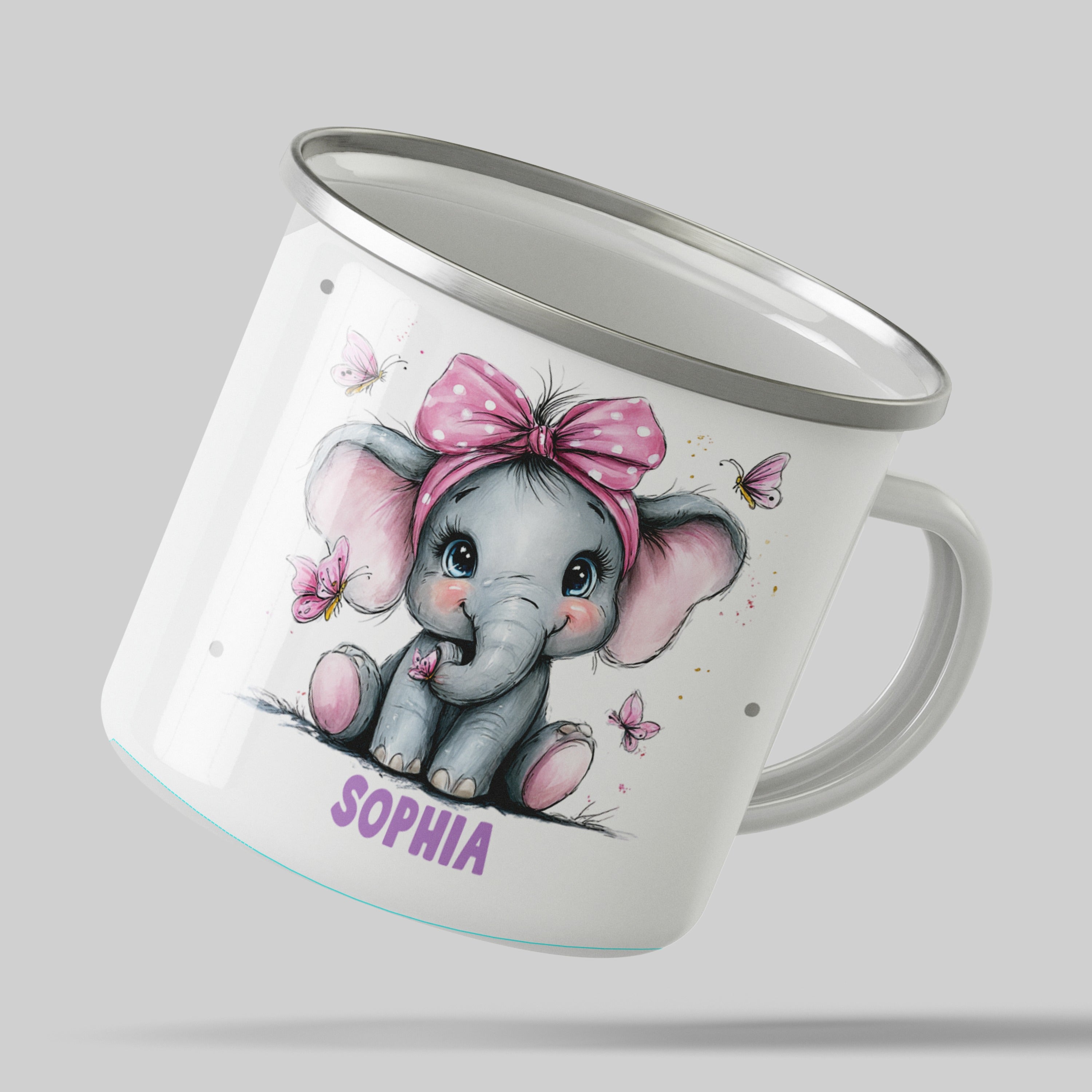 Die personalisierte Emaille Tasse mit Elefant Mädchenmotiv – süßes Babymotiv-Motiv von MIKALINO ist das perfekte Geschenk für alle, die süße Tiermotive und liebevolle Geschenke für Kinder lieben – der kleine Elefant mit rosa Schleife und Schmetterlingen zaubert ein Lächeln auf jedes Gesicht.. Jede Tasse wird mit deinem Wunschnamen bedruckt und so zu einem ganz persönlichen Unikat.