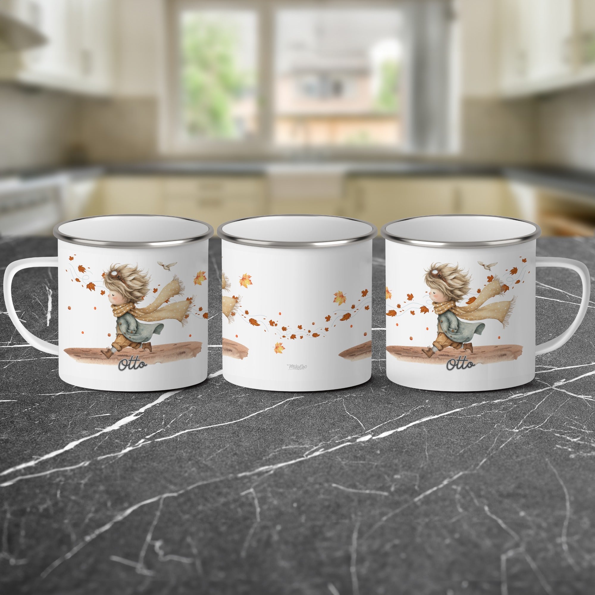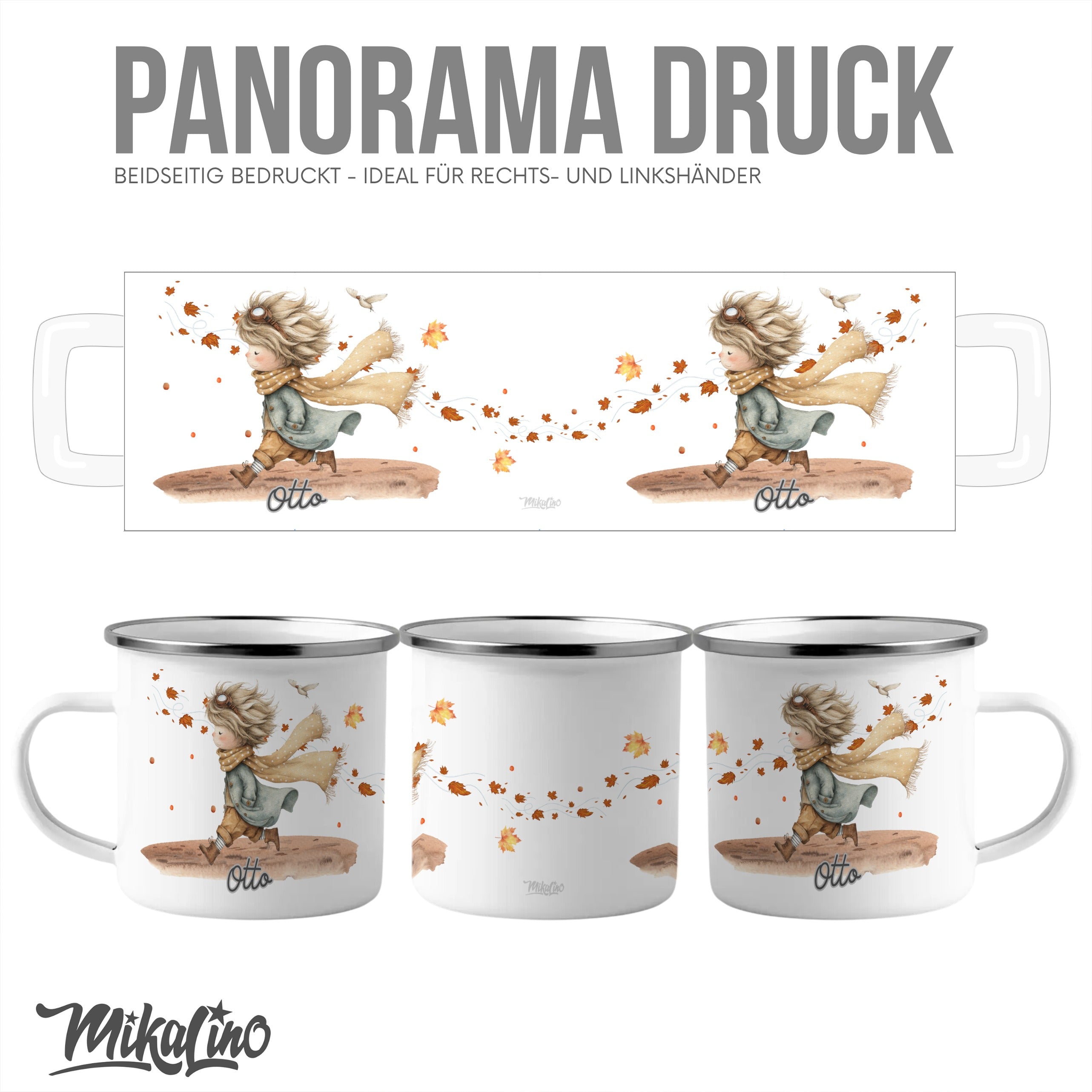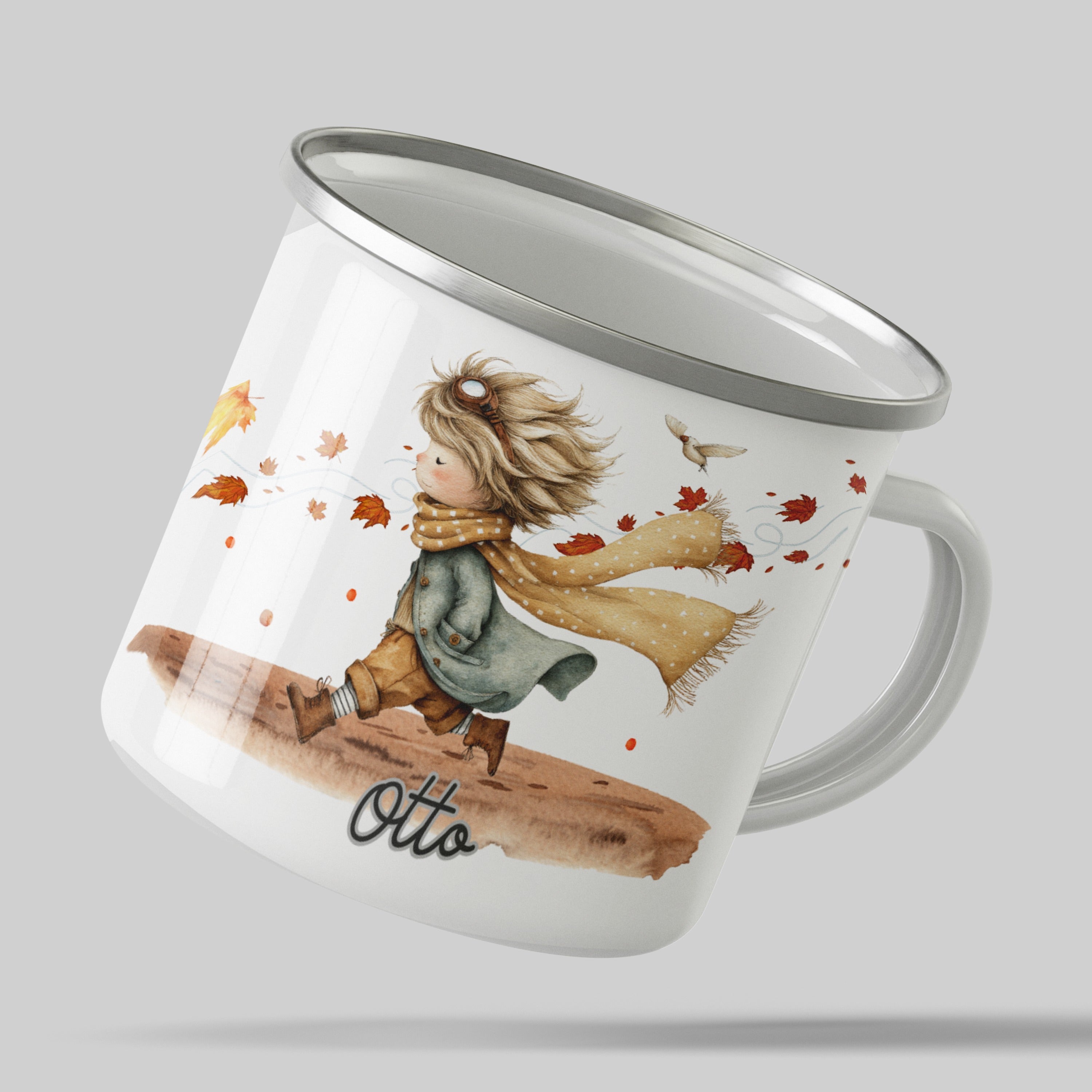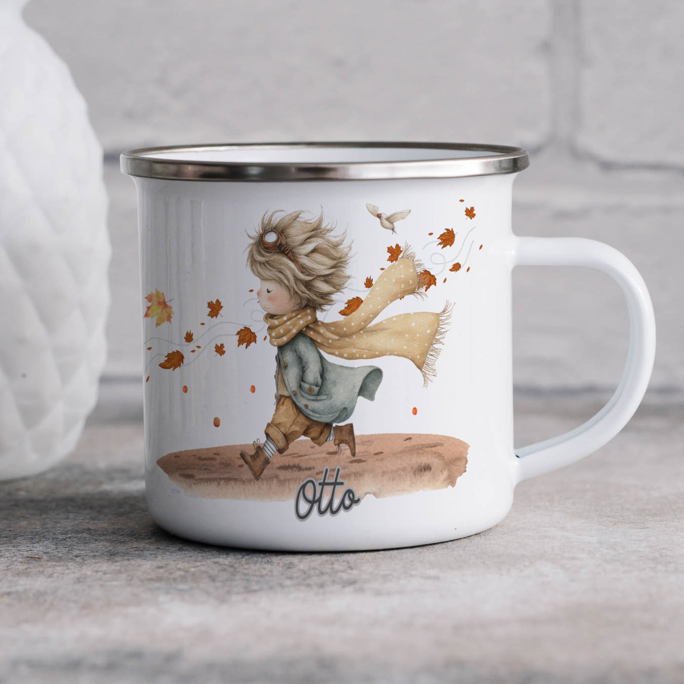 Die personalisierte Emaille Tasse mit fröhlicher Junge Herbstmotiv-Motiv von MIKALINO ist das perfekte Geschenk für alle, die liebevoll illustrierte Kindermotive und herbstliche Designs lieben – der Junge mit Schal und wehenden Blättern versprüht Abenteuerlust, Wärme und den Zauber des Herbstes.. Jede Tasse wird mit deinem Wunschnamen bedruckt und so zu einem ganz persönlichen Unikat.