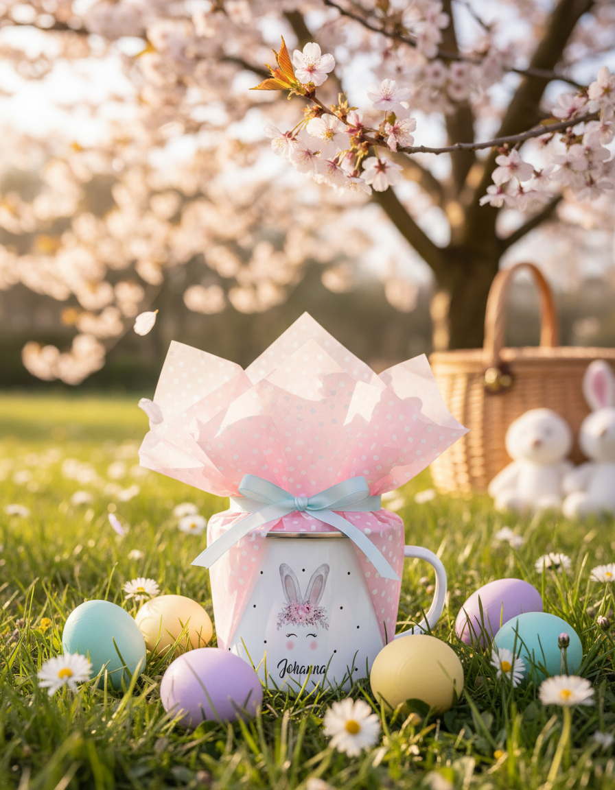 Stell dir vor, wie dein kleiner Schatz morgens mit leuchtenden Augen seine ganz eigene Tasse in den Händen hält. Der bezaubernde Hase inmitten zarter rosa Blüten macht jeden Schluck zu einem kleinen Abenteuer und verwandelt das alltägliche Trinken in pure Freude.