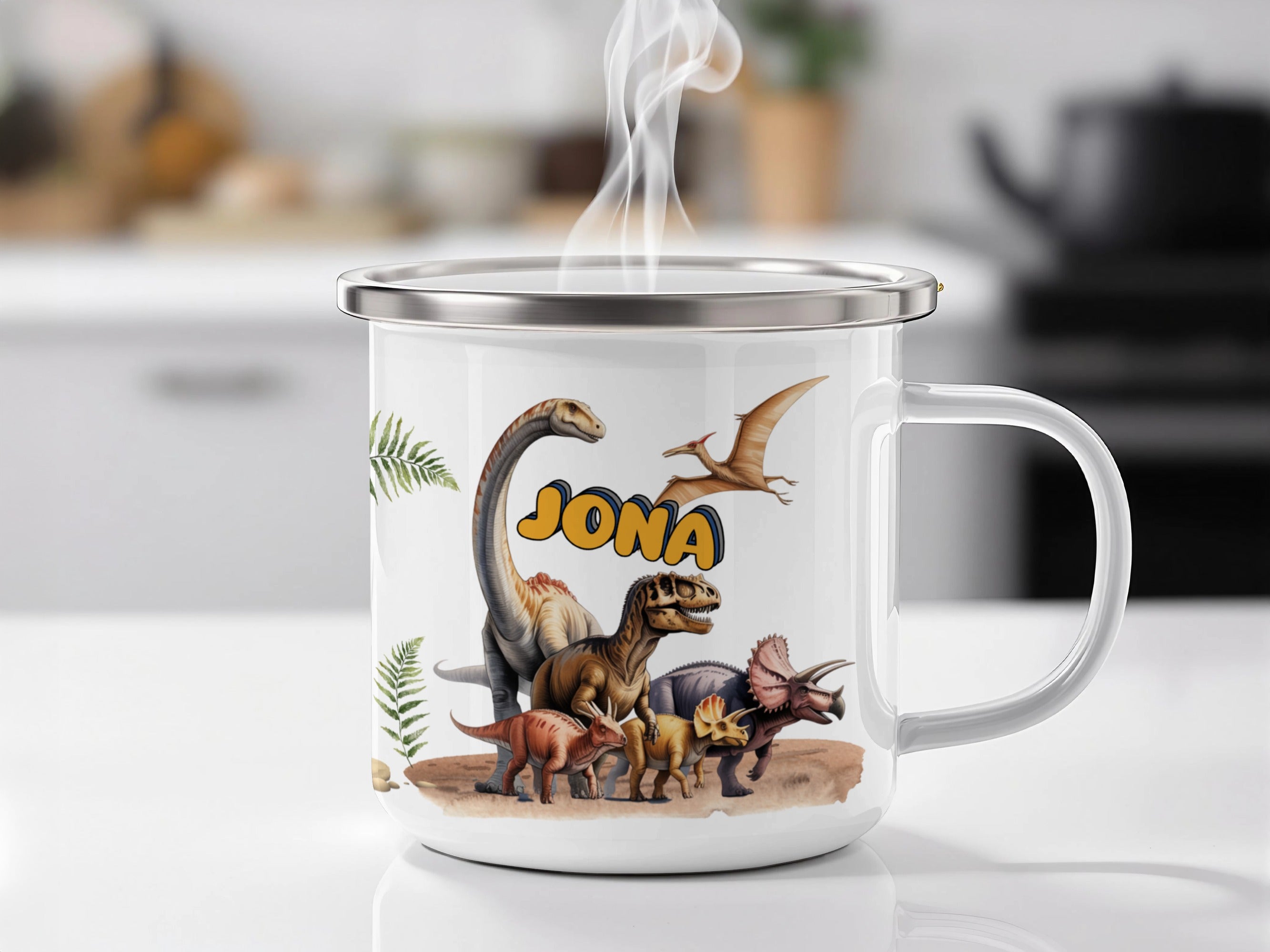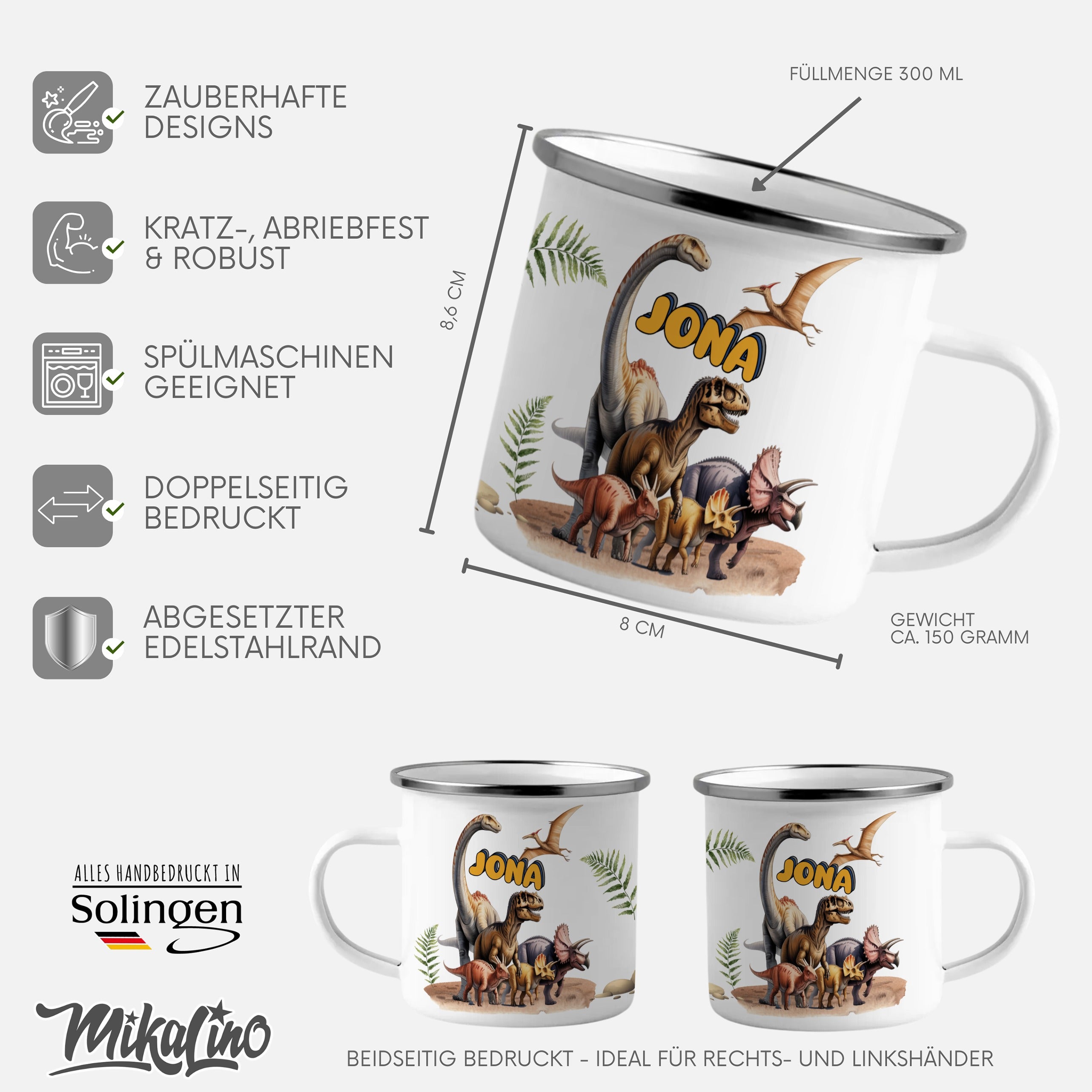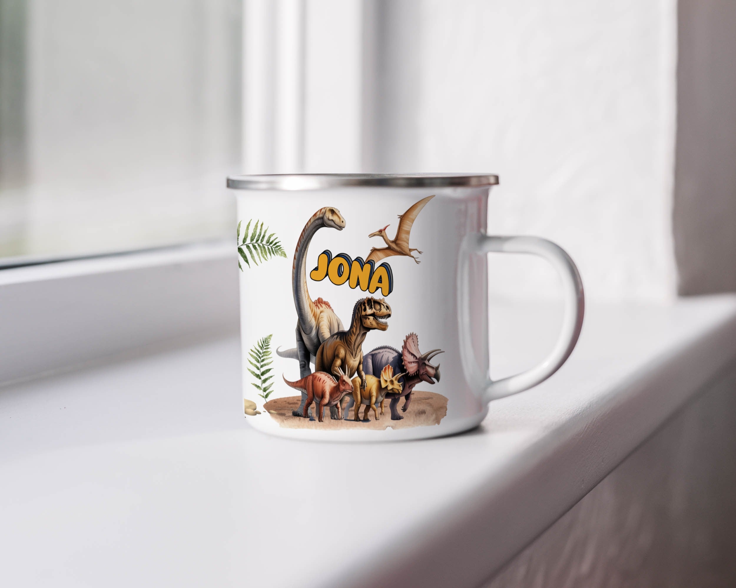 Emaille Tasse Jurassic Freunde personalisiert mit Namen Kinder Becher mit Motiv – Emaille Becher für Jungen & Mädchen – Camping Tasse leicht & robust Geschenkidee Kindertasse (7316)