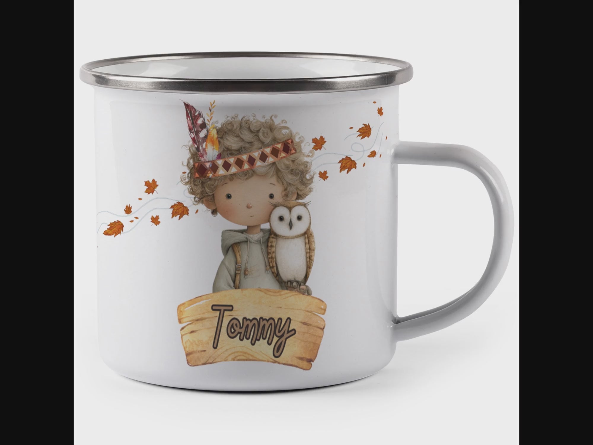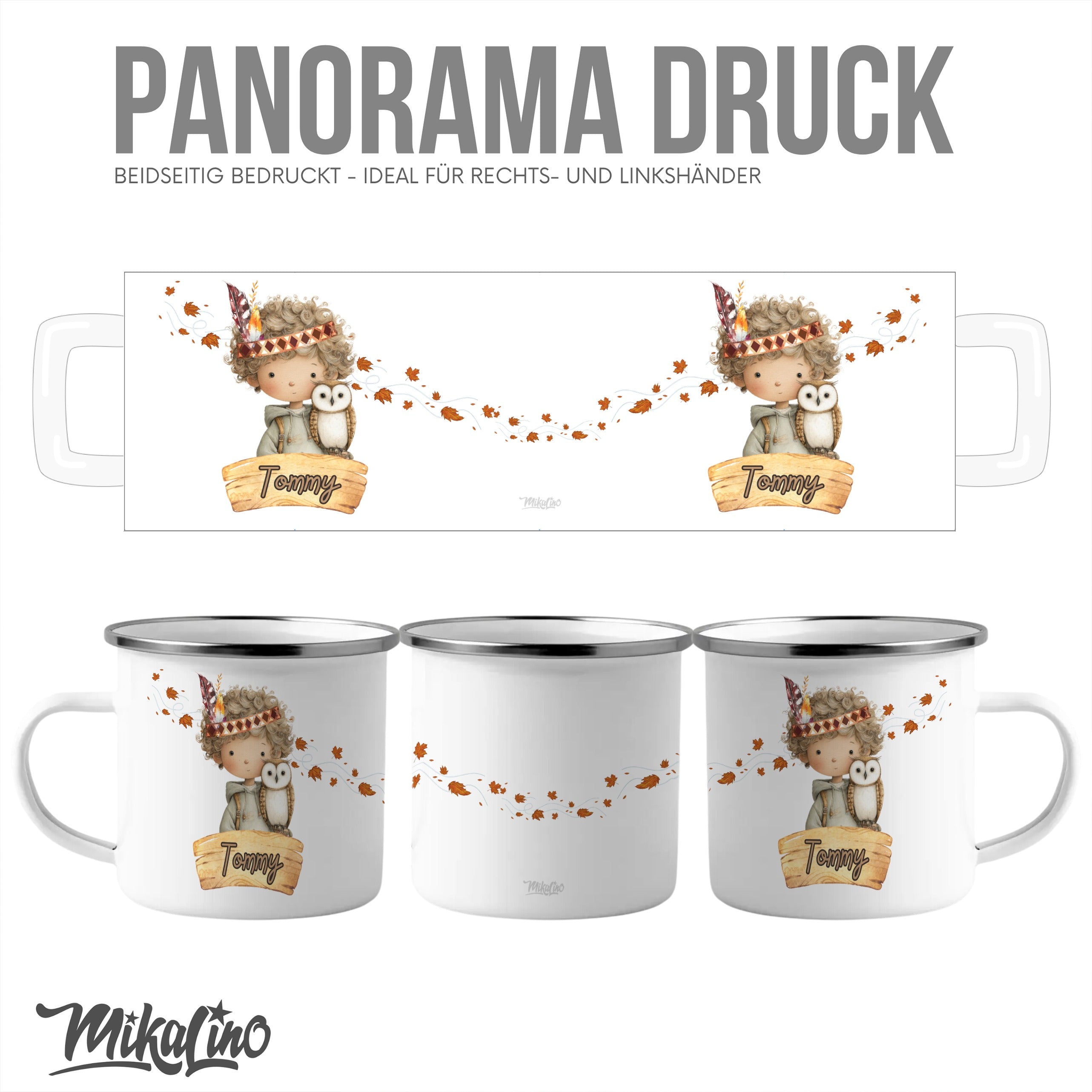 Die personalisierte Emaille Tasse mit Kind mit Stirnband und Eule-Motiv von MIKALINO ist das perfekte Geschenk für alle, die liebevoll illustrierte Kindermotive und Waldtiere lieben – der Junge mit Eule und Federschmuck strahlt Abenteuerlust, Freundschaft und die Magie der Natur aus.. Jede Tasse wird mit deinem Wunschnamen bedruckt und so zu einem ganz persönlichen Unikat.