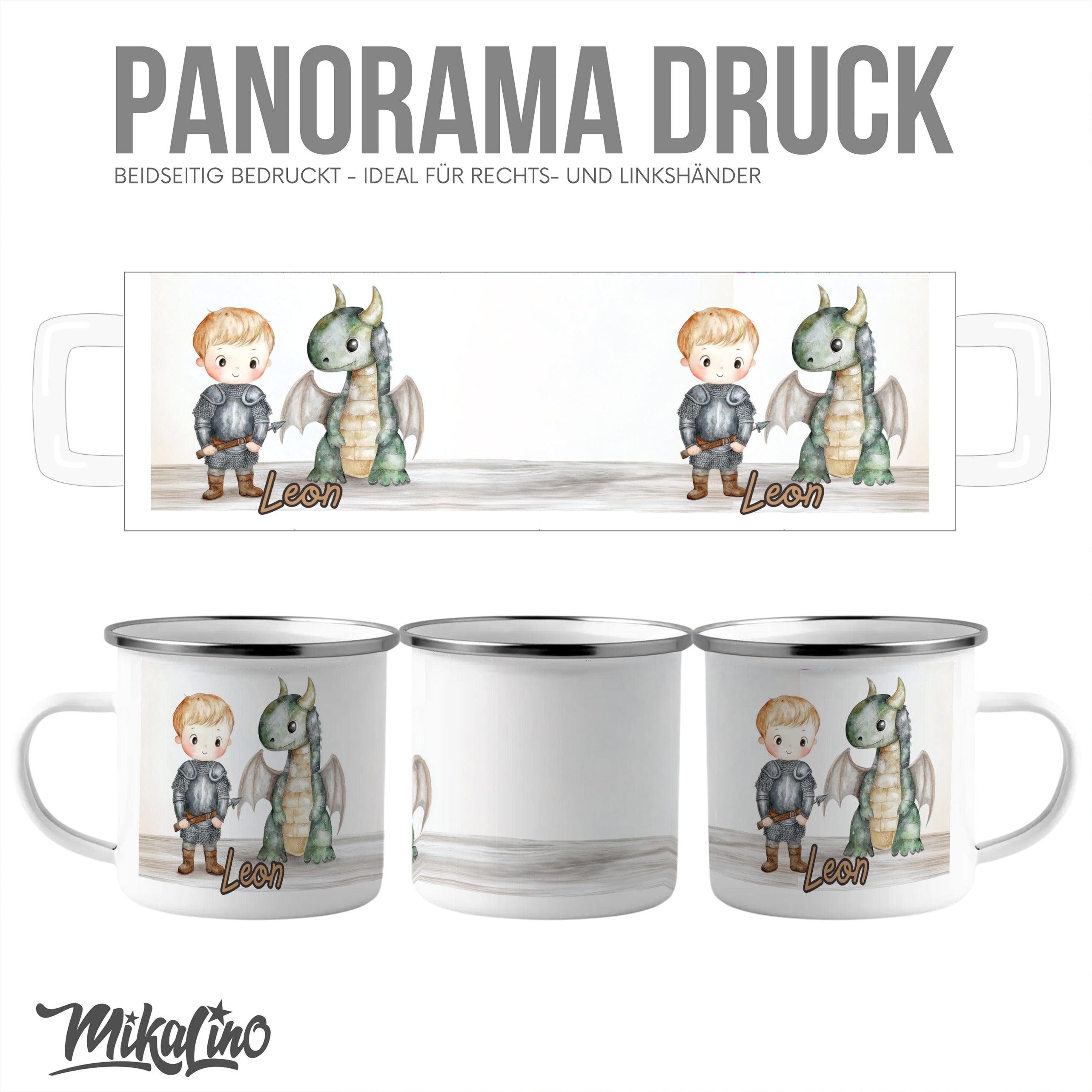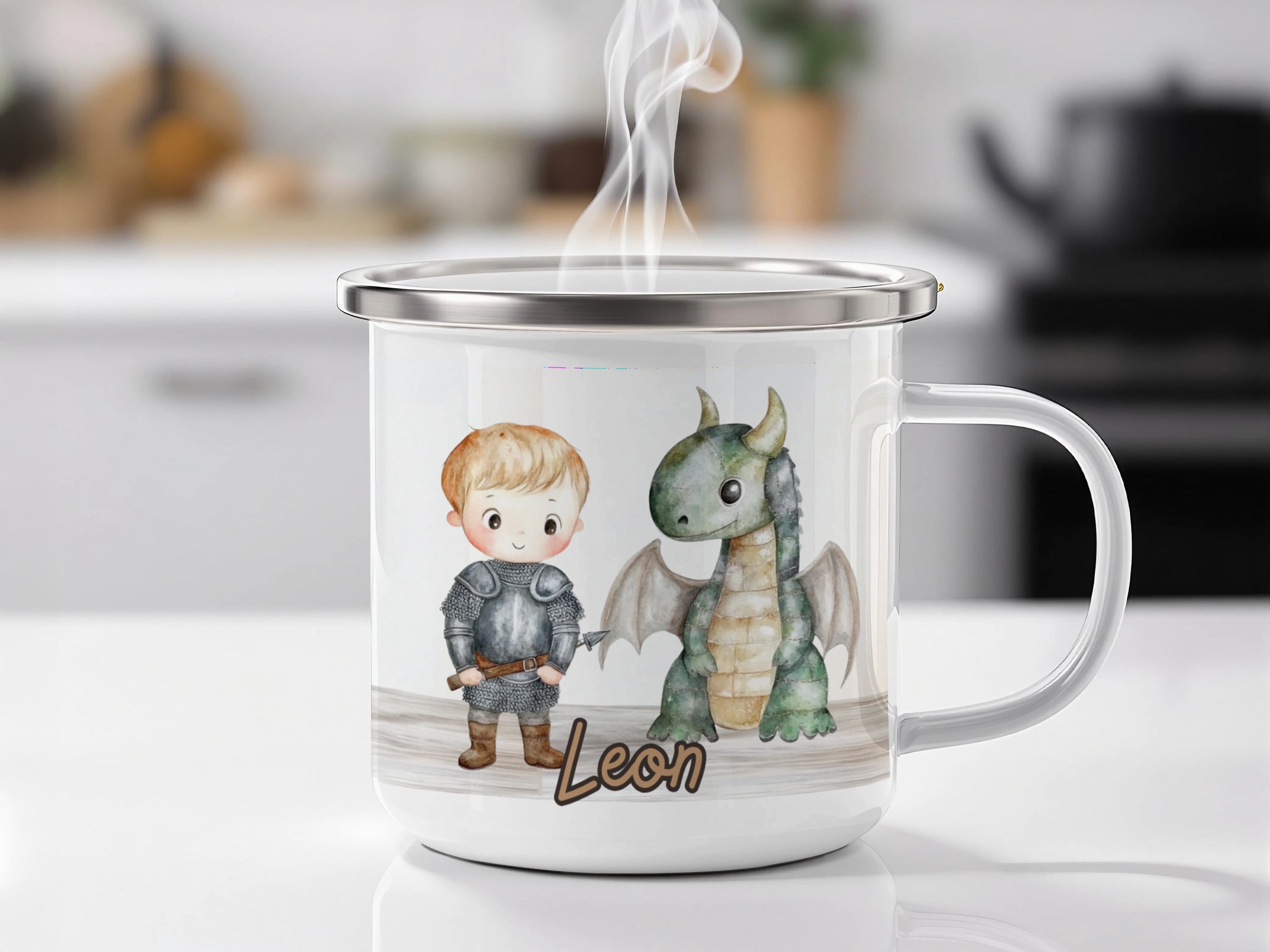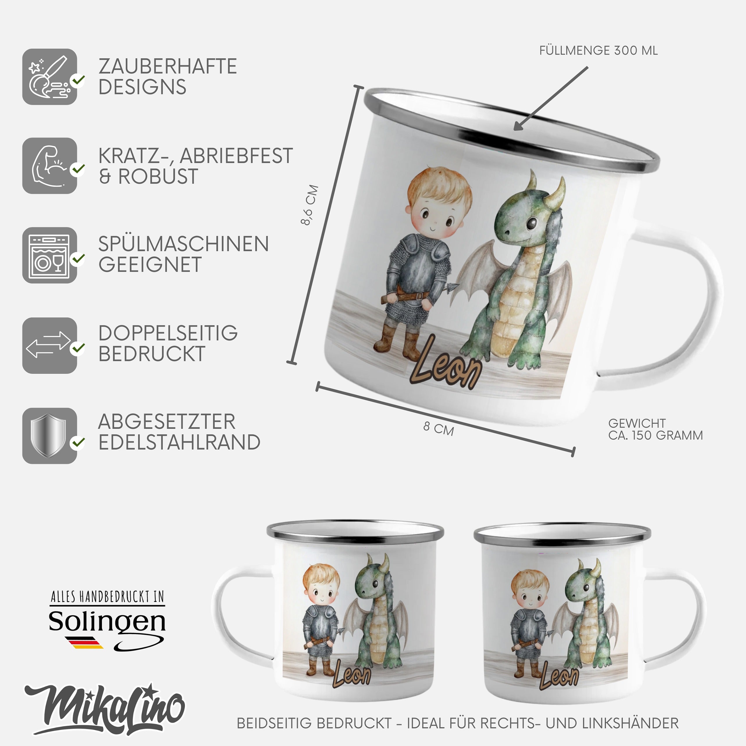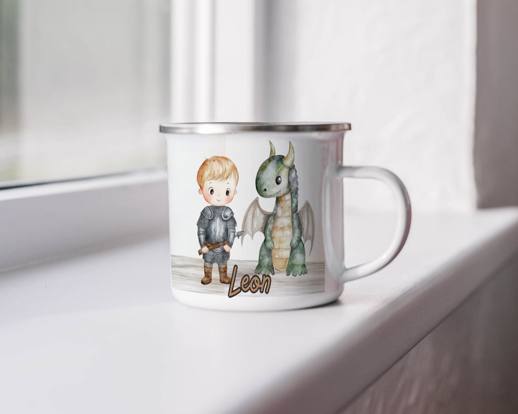 Emaille Tasse kleiner Ritter und kleiner Drache personalisiert mit Namen Kinder Becher mit Motiv – Emaille Becher für Jungen & Mädchen – Camping Tasse leicht & robust Geschenkidee Kindertasse (7537)