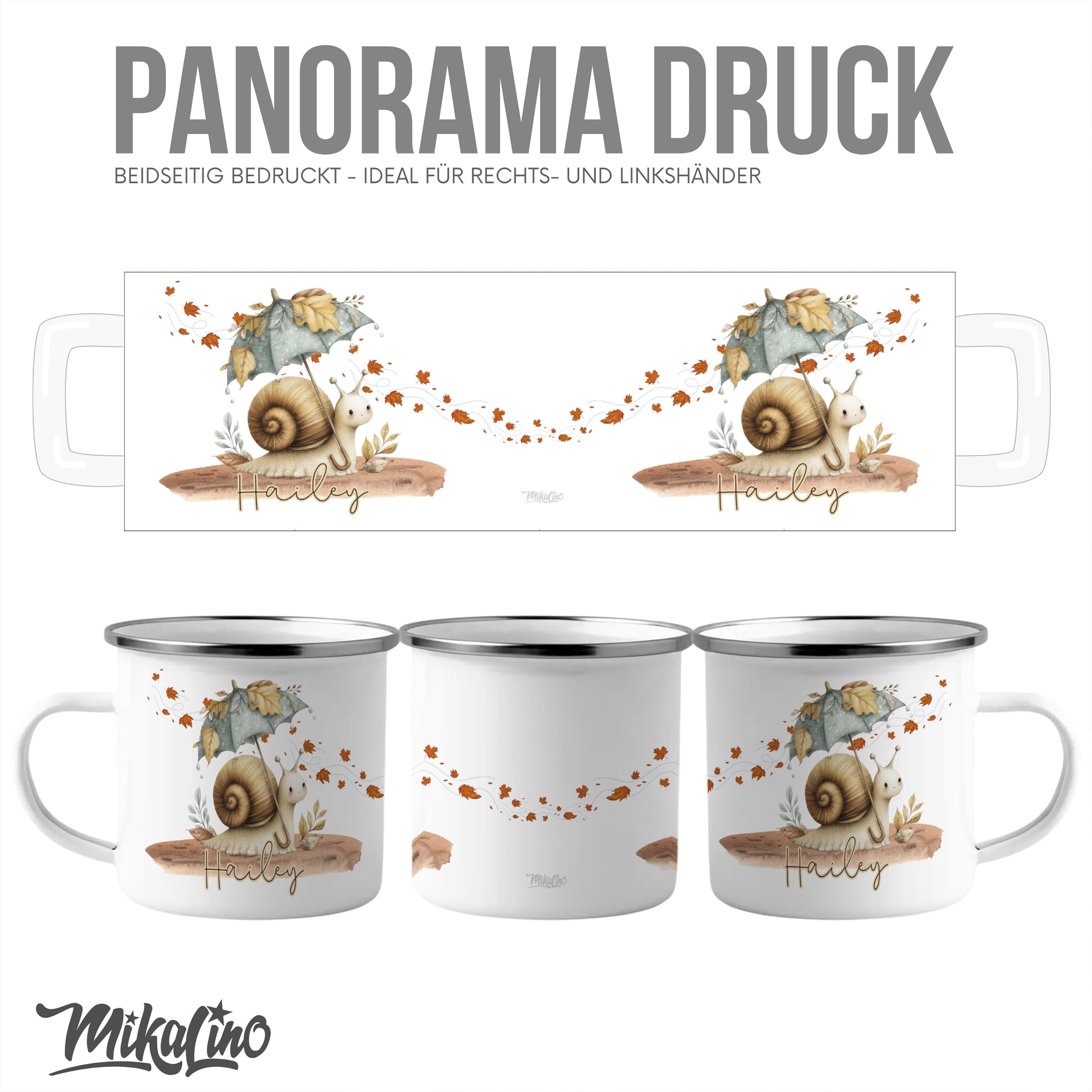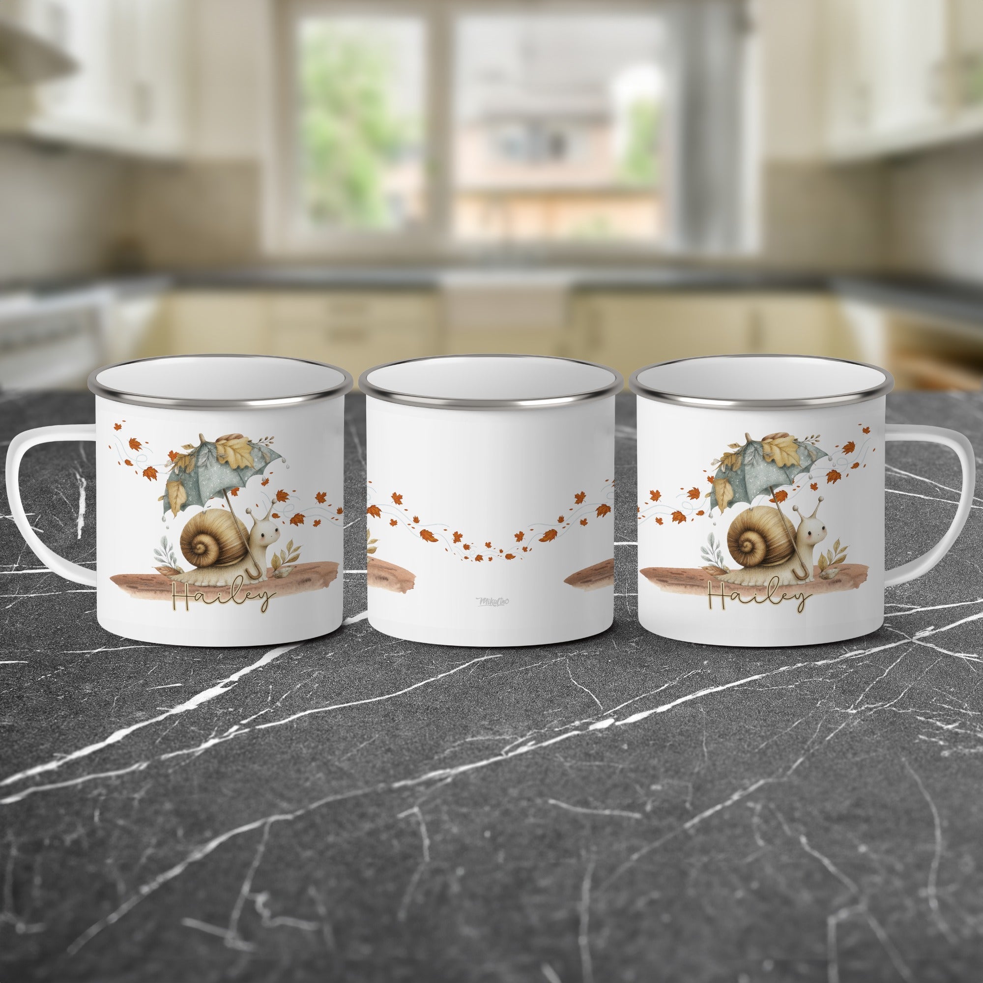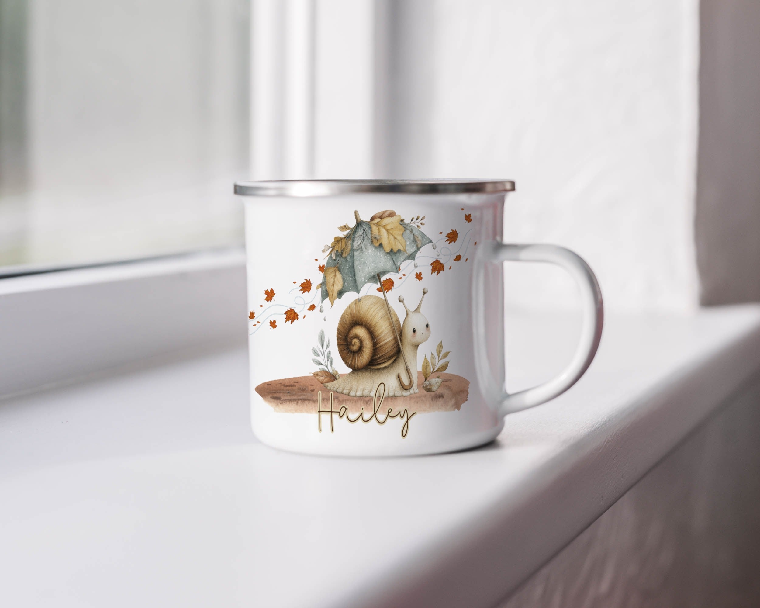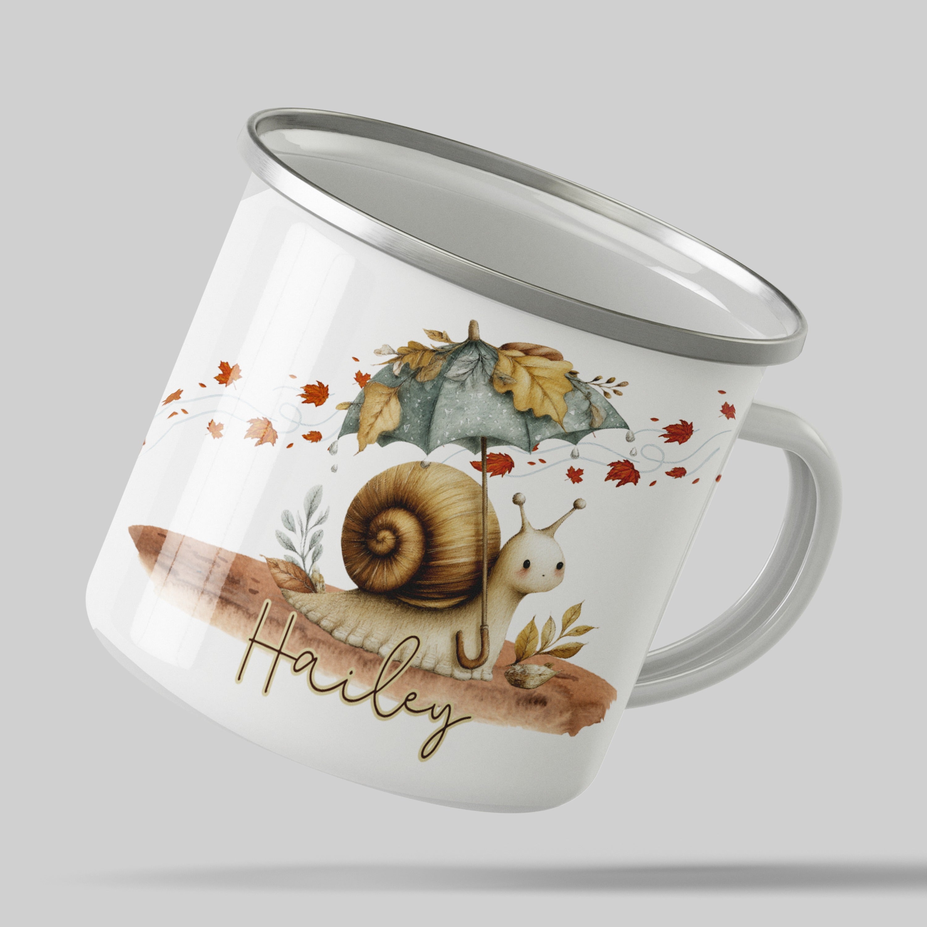 Emaille Tasse süße Schnecke mit Regenschirm personalisiert mit Namen Kinder Becher mit Motiv – Emaille Becher für Jungen & Mädchen – Camping Tasse leicht & robust Geschenkidee Kindertasse (7521)