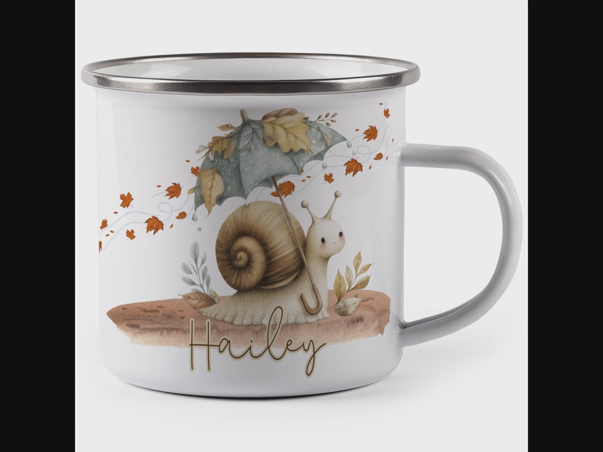 Die personalisierte Emaille Tasse mit süße Schnecke mit Regenschirm-Motiv von MIKALINO ist das perfekte Geschenk für alle, die Schnecken und liebevoll illustrierte Tiermotive mögen – ein charmantes Design, das Ruhe, Gelassenheit und die Schönheit der kleinen Dinge in der Natur zeigt.. Jede Tasse wird mit deinem Wunschnamen bedruckt und so zu einem ganz persönlichen Unikat.
