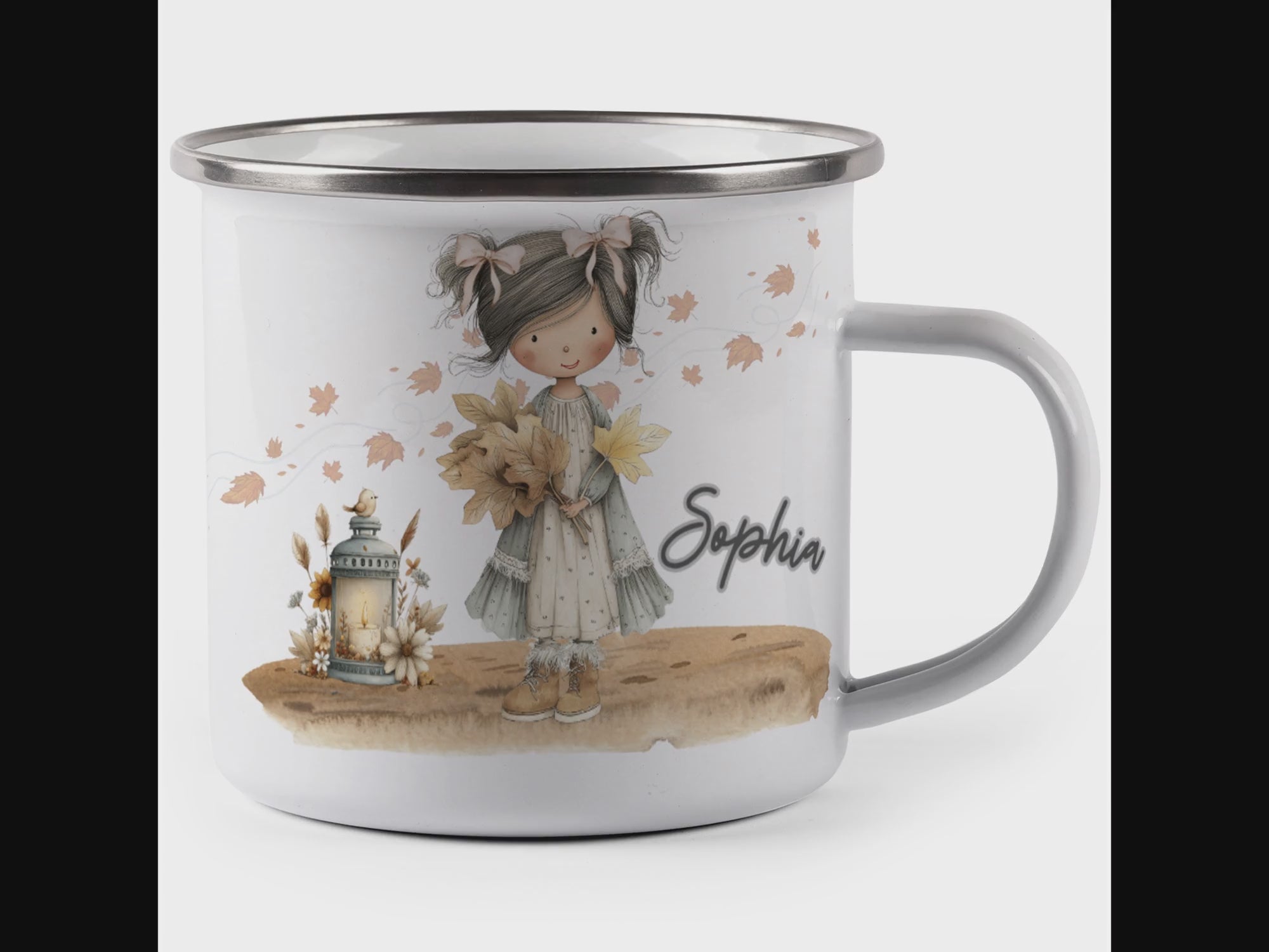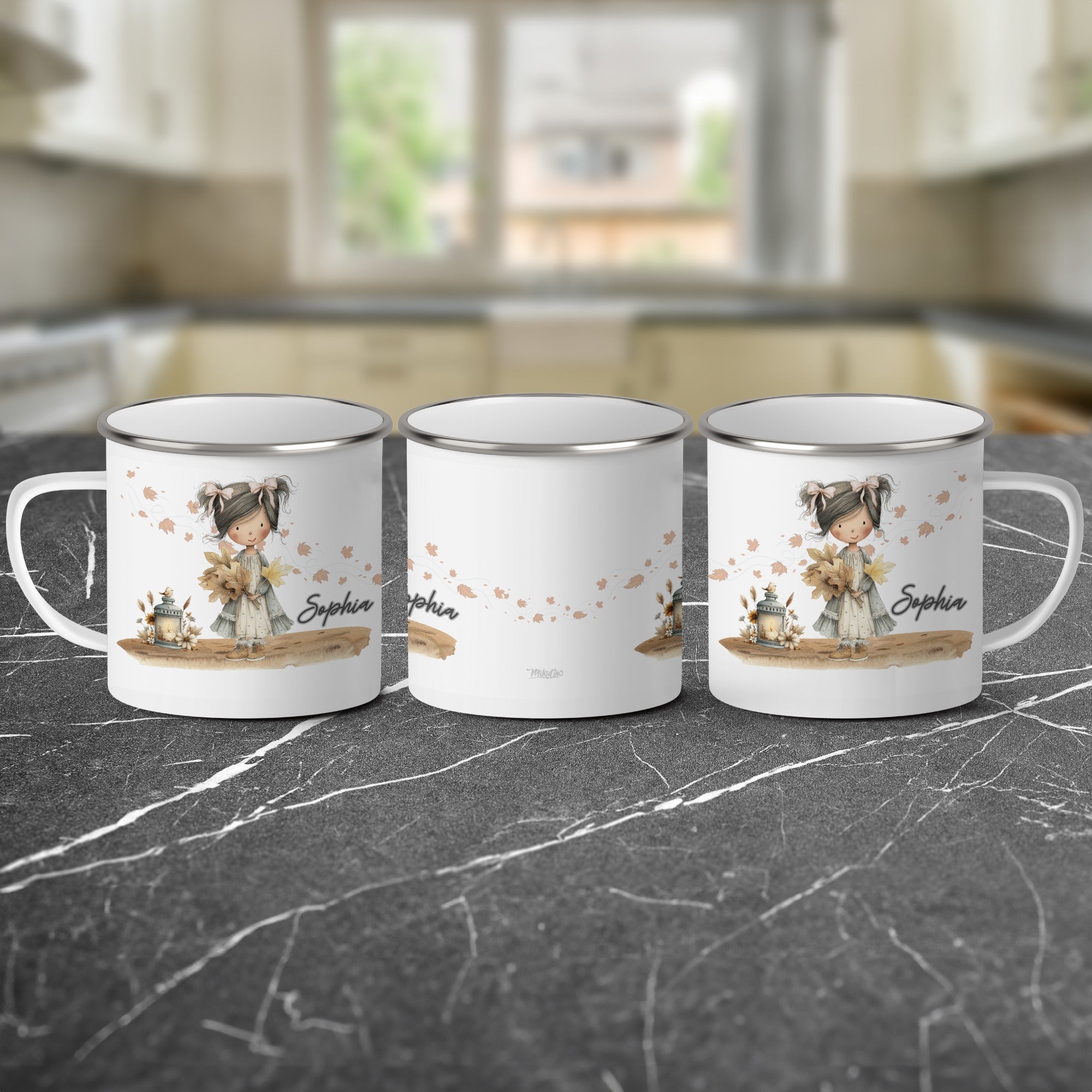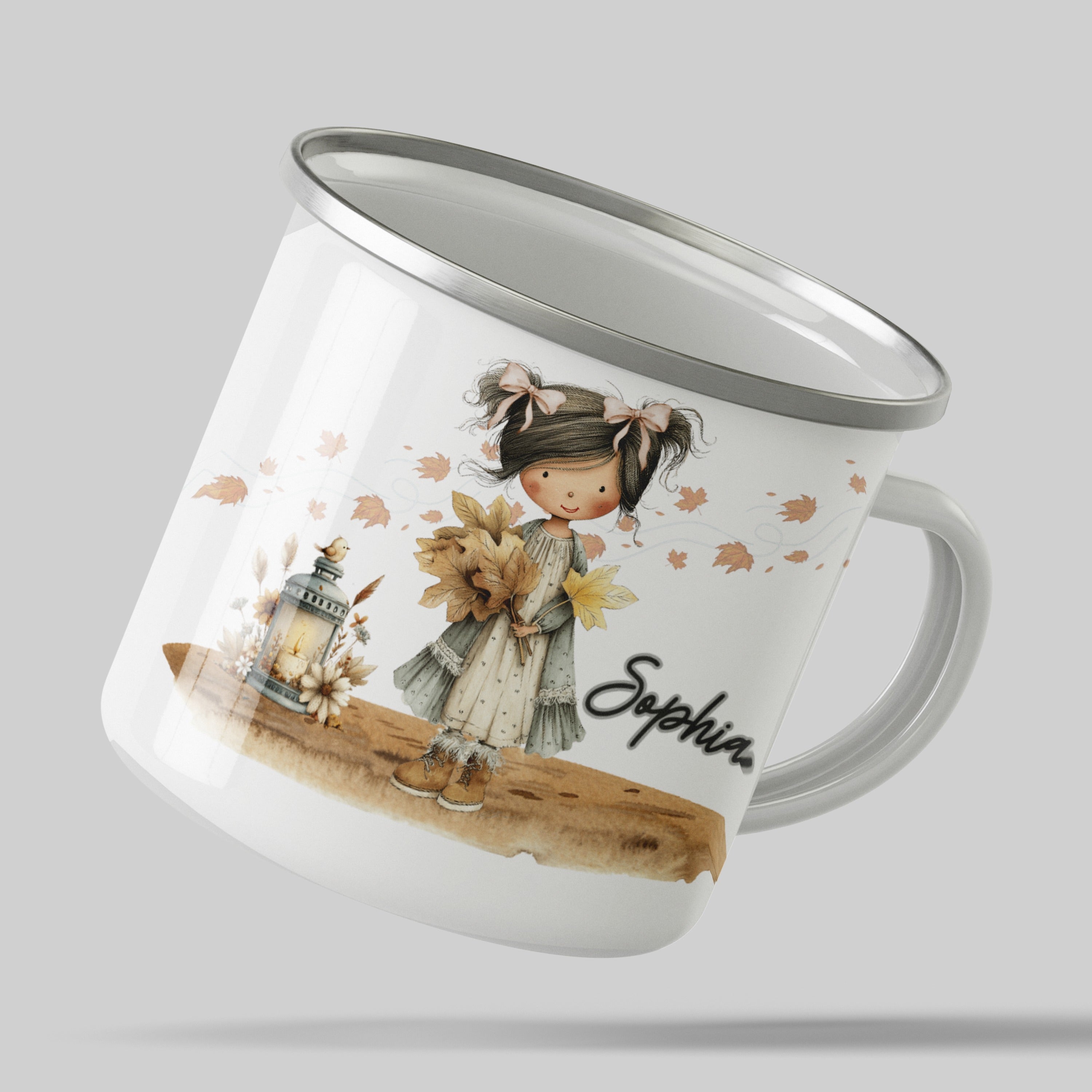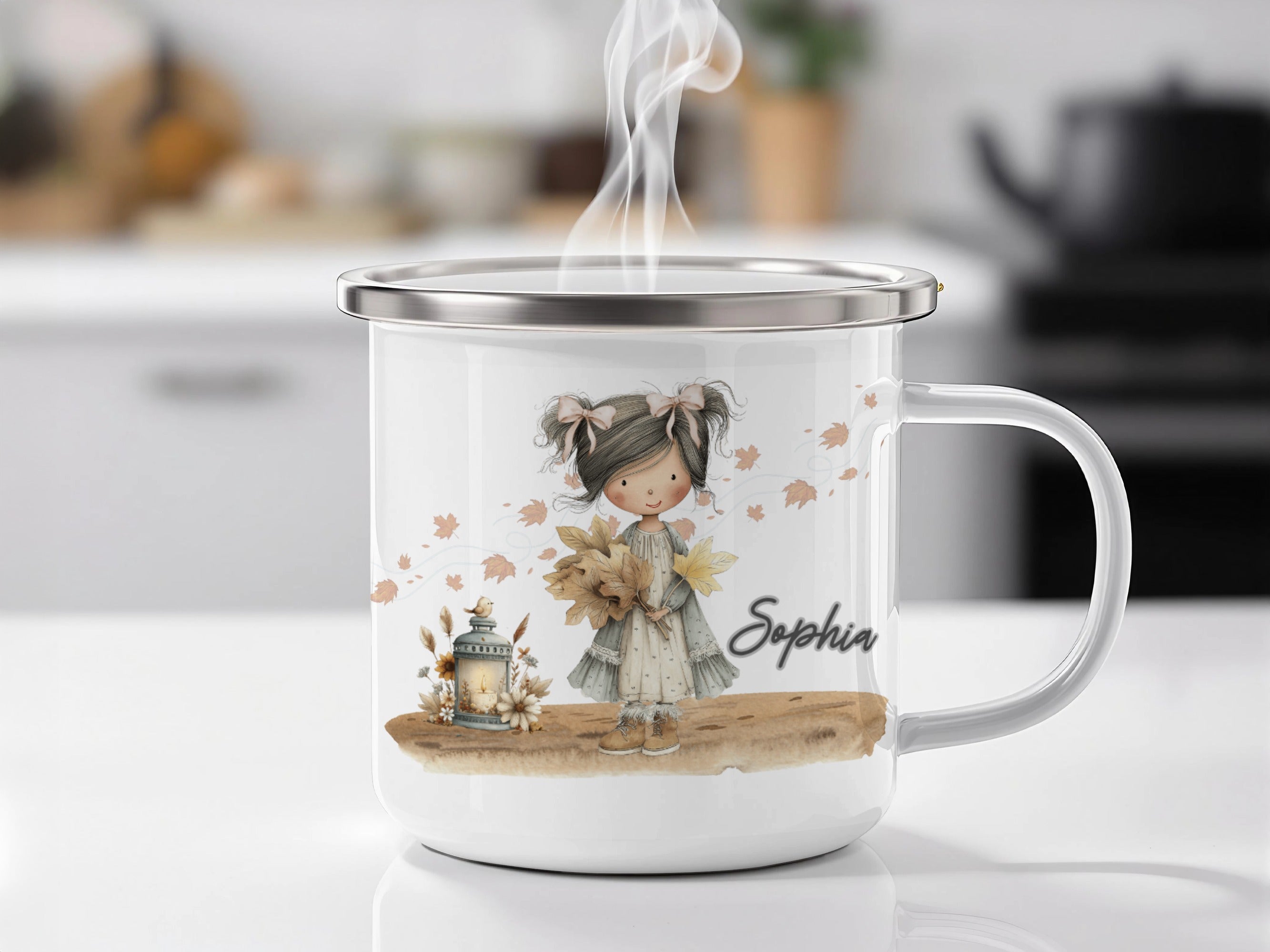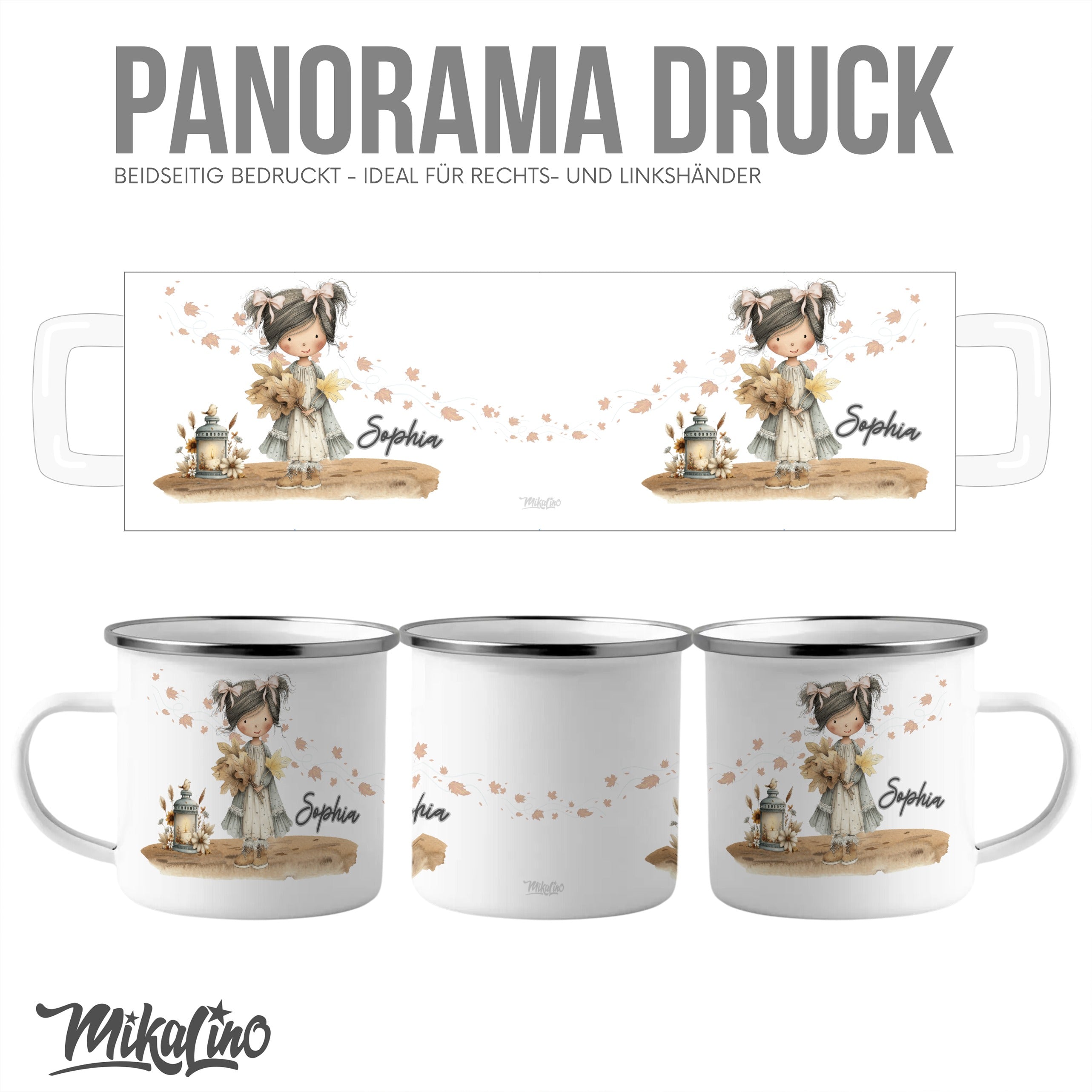 Die personalisierte Emaille Tasse mit süßes Mädchen mit Schleifen in den Haaren-Motiv von MIKALINO ist das perfekte Geschenk für alle, die liebevoll illustrierte Kindermotive und stimmungsvolle Herbstdesigns lieben – das Mädchen mit Blättern und Laterne strahlt Geborgenheit, Wärme und herbstliche Magie aus.. Jede Tasse wird mit deinem Wunschnamen bedruckt und so zu einem ganz persönlichen Unikat.