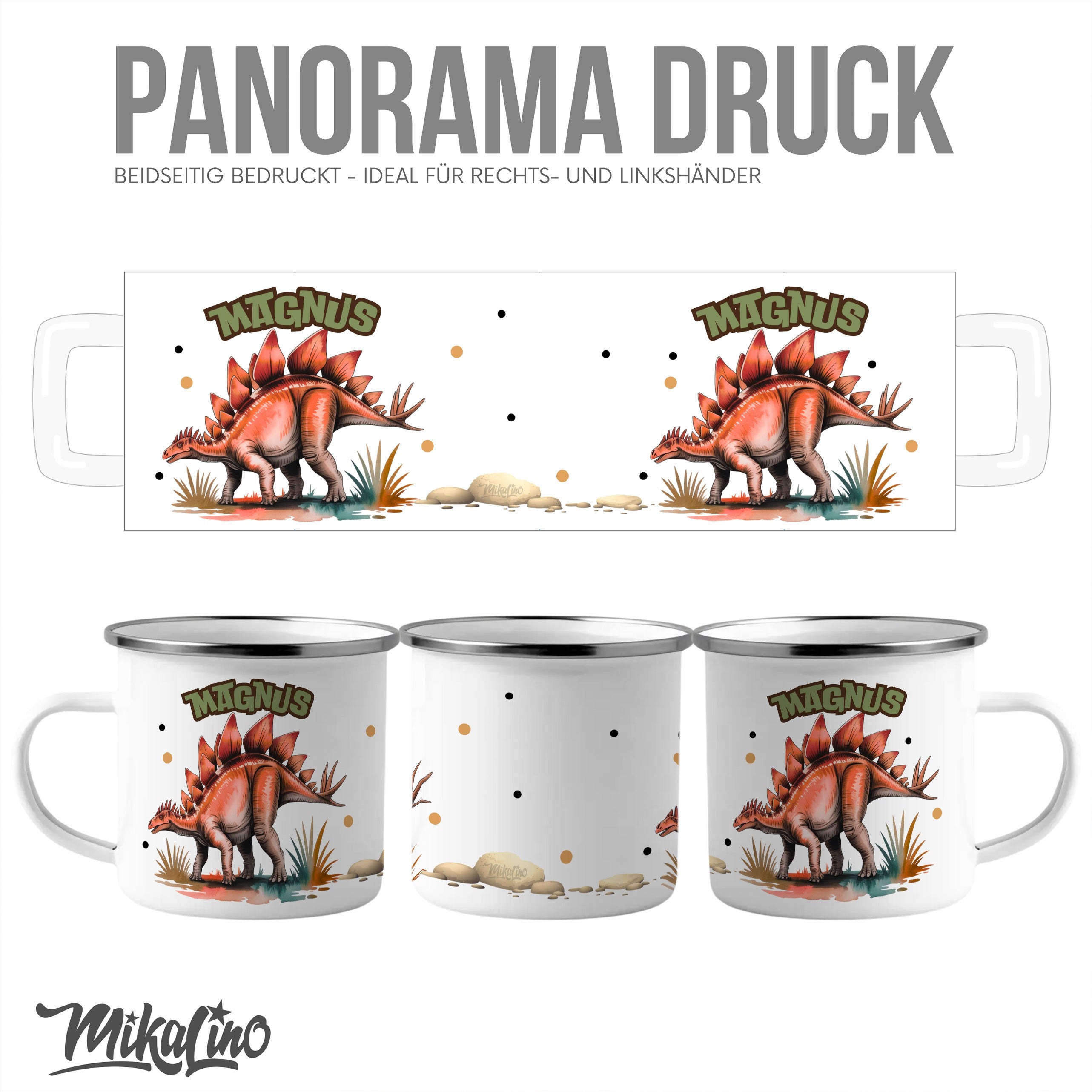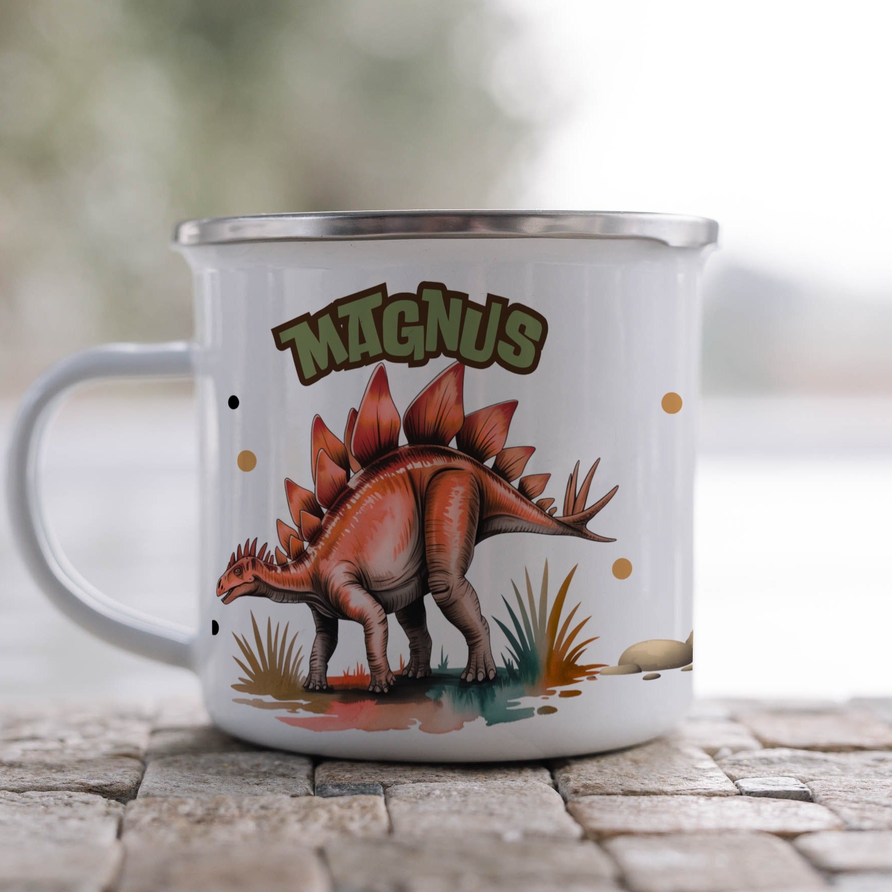Emaille Tasse Starker Stegosaurus personalisiert mit Namen Kinder Becher mit Motiv – Emaille Becher für Jungen & Mädchen – Camping Tasse leicht & robust Geschenkidee Kindertasse (7317)