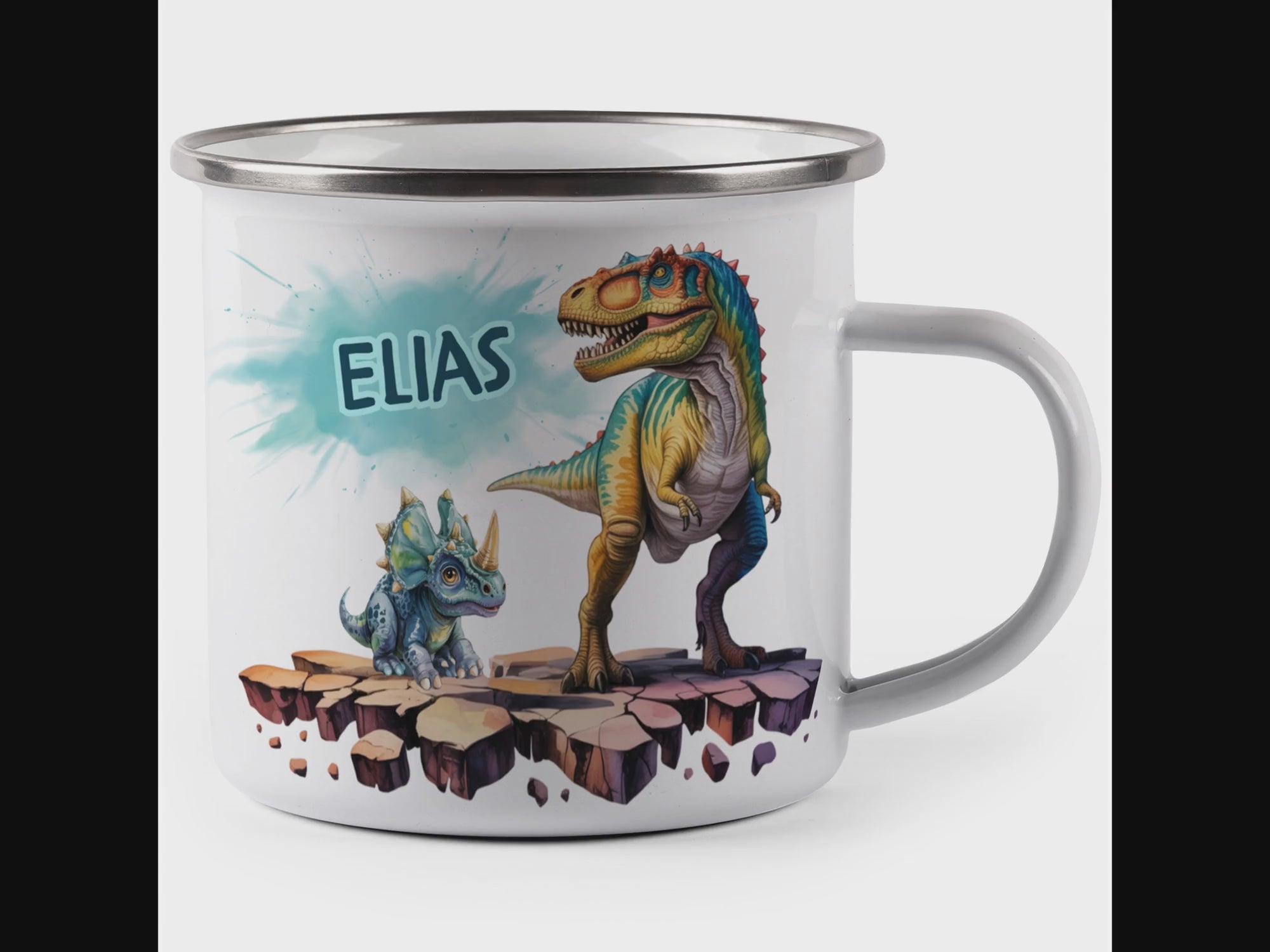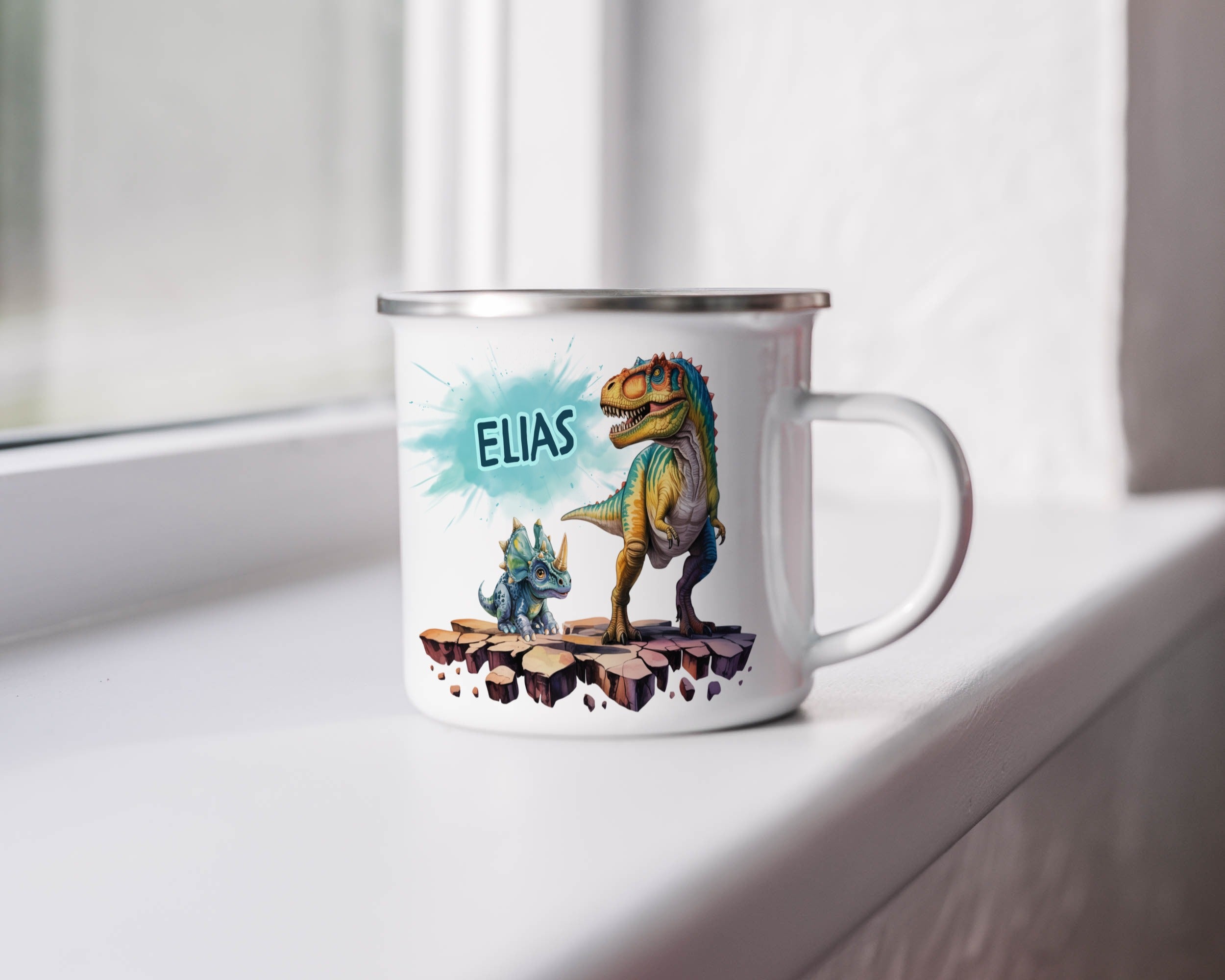 Die personalisierte Emaille Tasse mit T-Rex & Mini Triceratops-Motiv von MIKALINO ist das perfekte Geschenk für Kinder, die Dinosaurier lieben und T-Rex & Triceratops als beste Freunde sehen. Jede Tasse wird mit deinem Wunschnamen bedruckt und so zu einem ganz persönlichen Unikat.