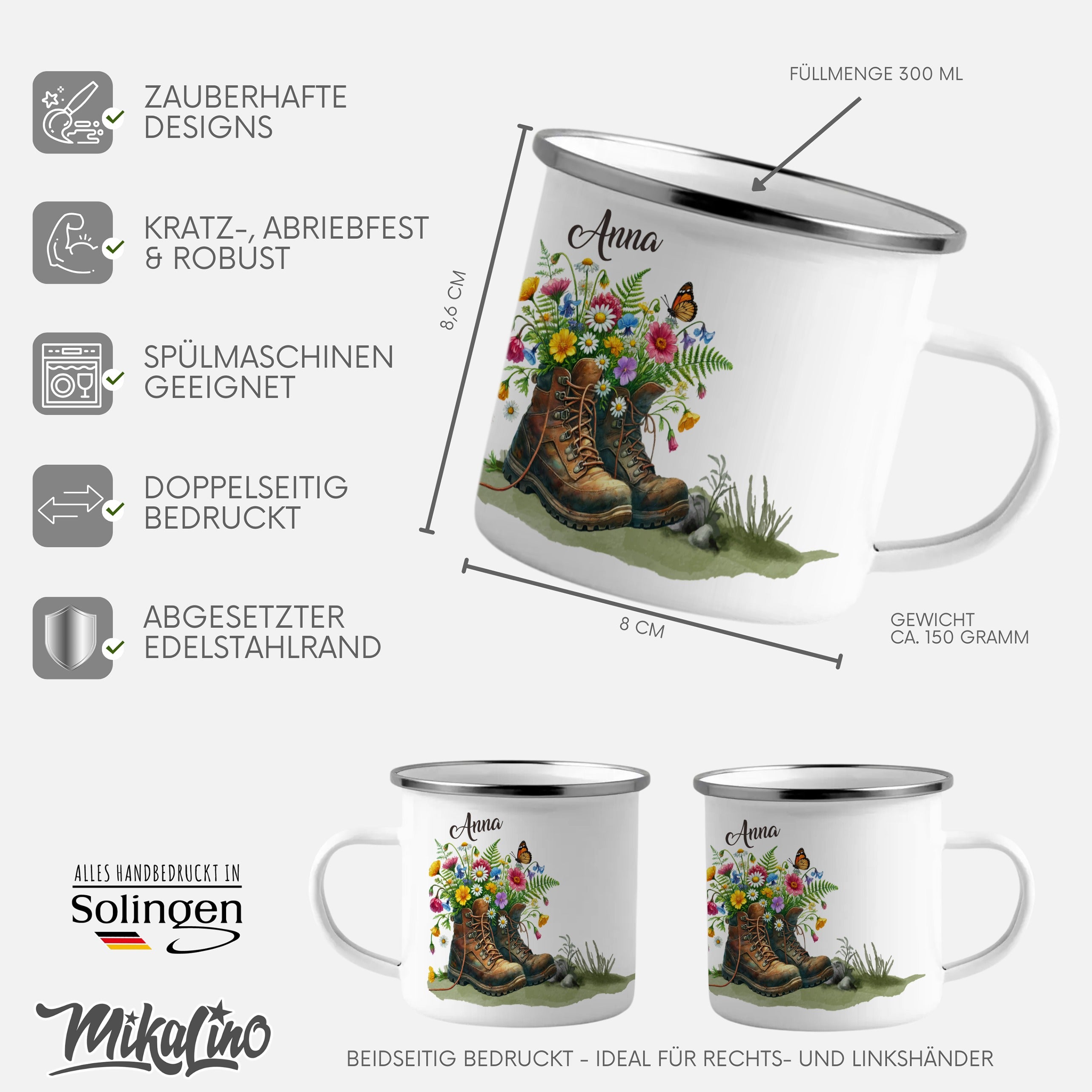 Emaille Tasse Wanderschuhe mir bunten Blumen personalisiert mit Namen Kinder Becher mit Motiv – Emaille Becher für Jungen & Mädchen – Camping Tasse leicht & robust Geschenkidee Kindertasse (7505)