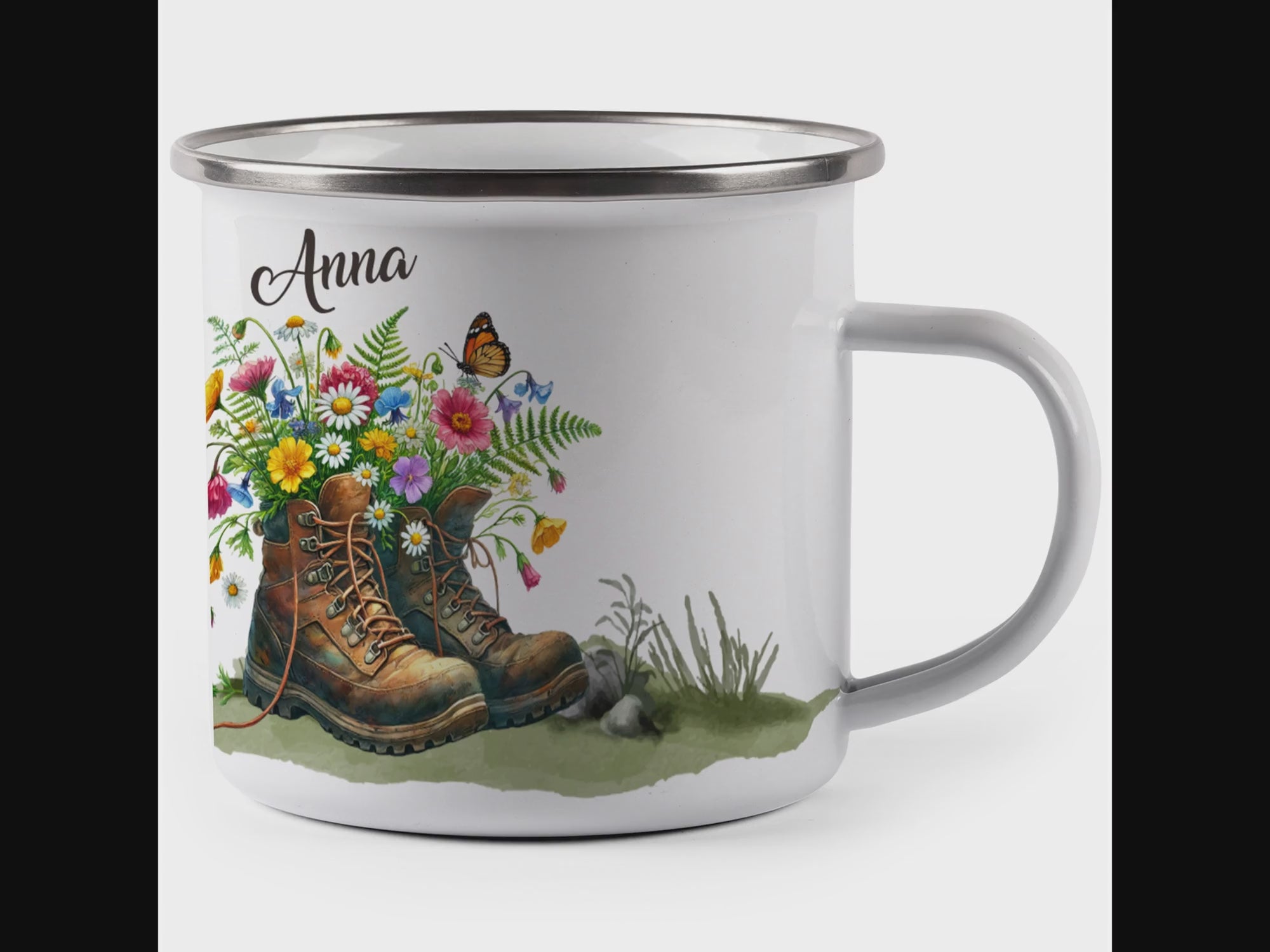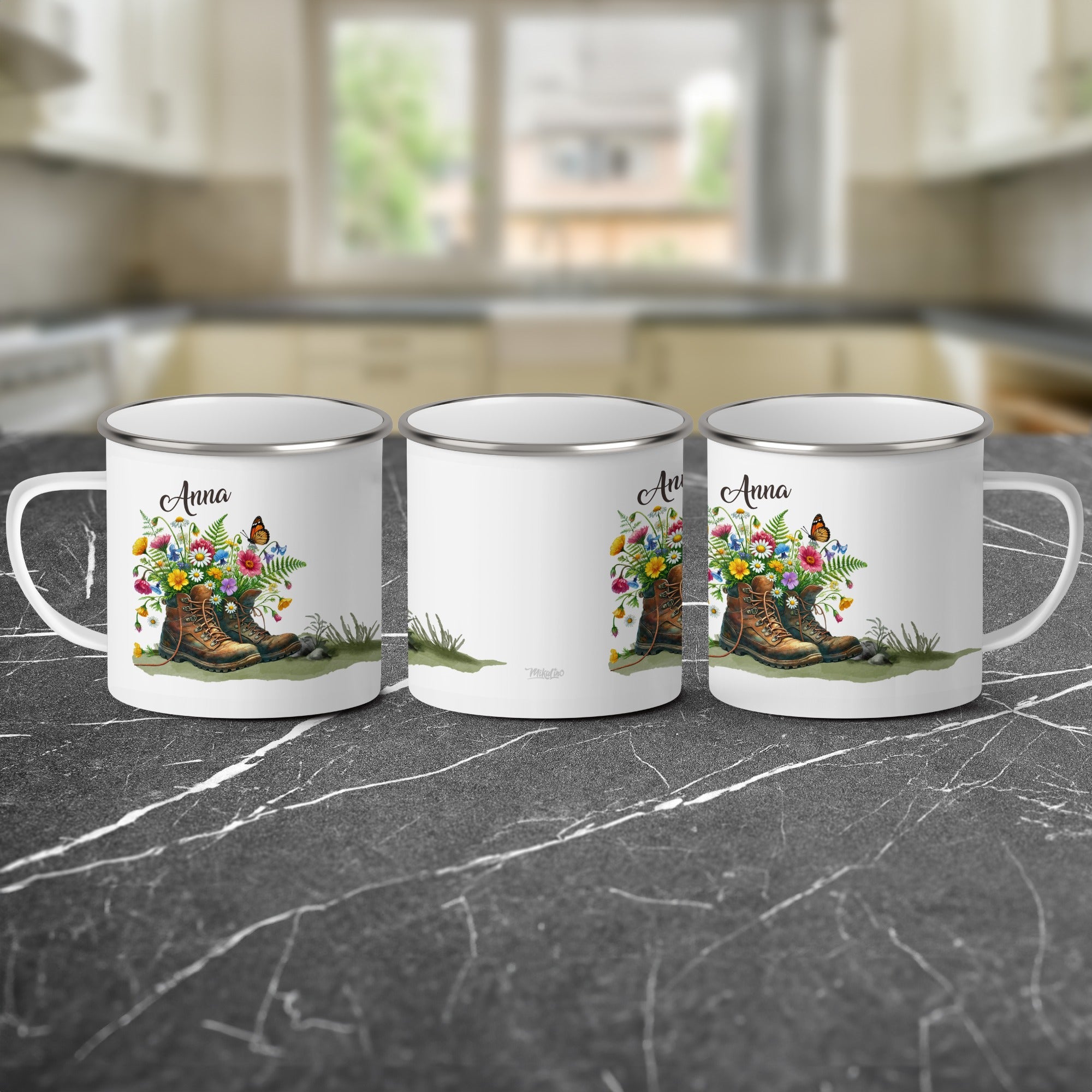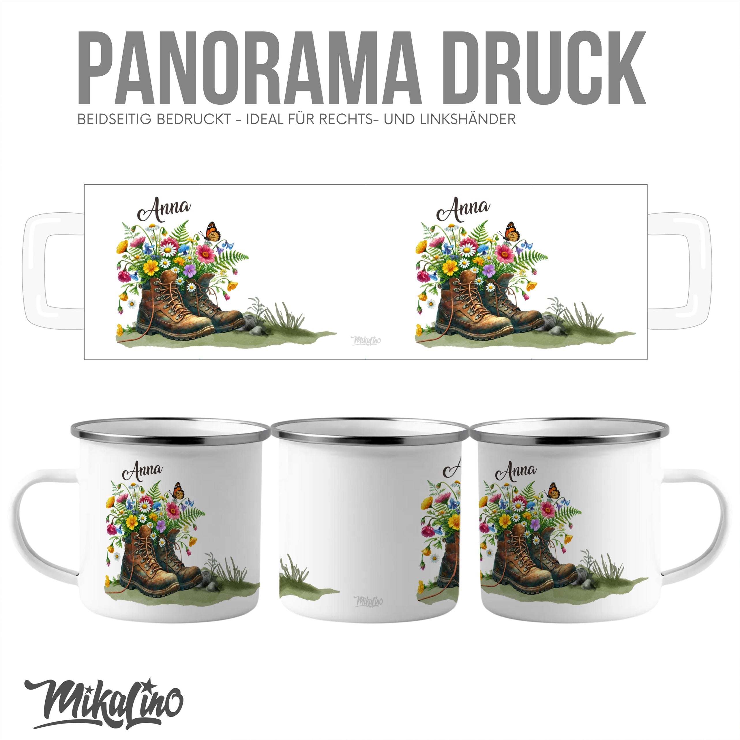 Die personalisierte Emaille Tasse mit Wanderschuhe mir bunten Blumen-Motiv von MIKALINO ist das perfekte Geschenk für die das Wandern, die Berge und die Natur lieben – ob auf Gipfeltour, am Bergsee oder beim nächsten Outdoor-Abenteuer.. Jede Tasse wird mit deinem Wunschnamen bedruckt und so zu einem ganz persönlichen Unikat.