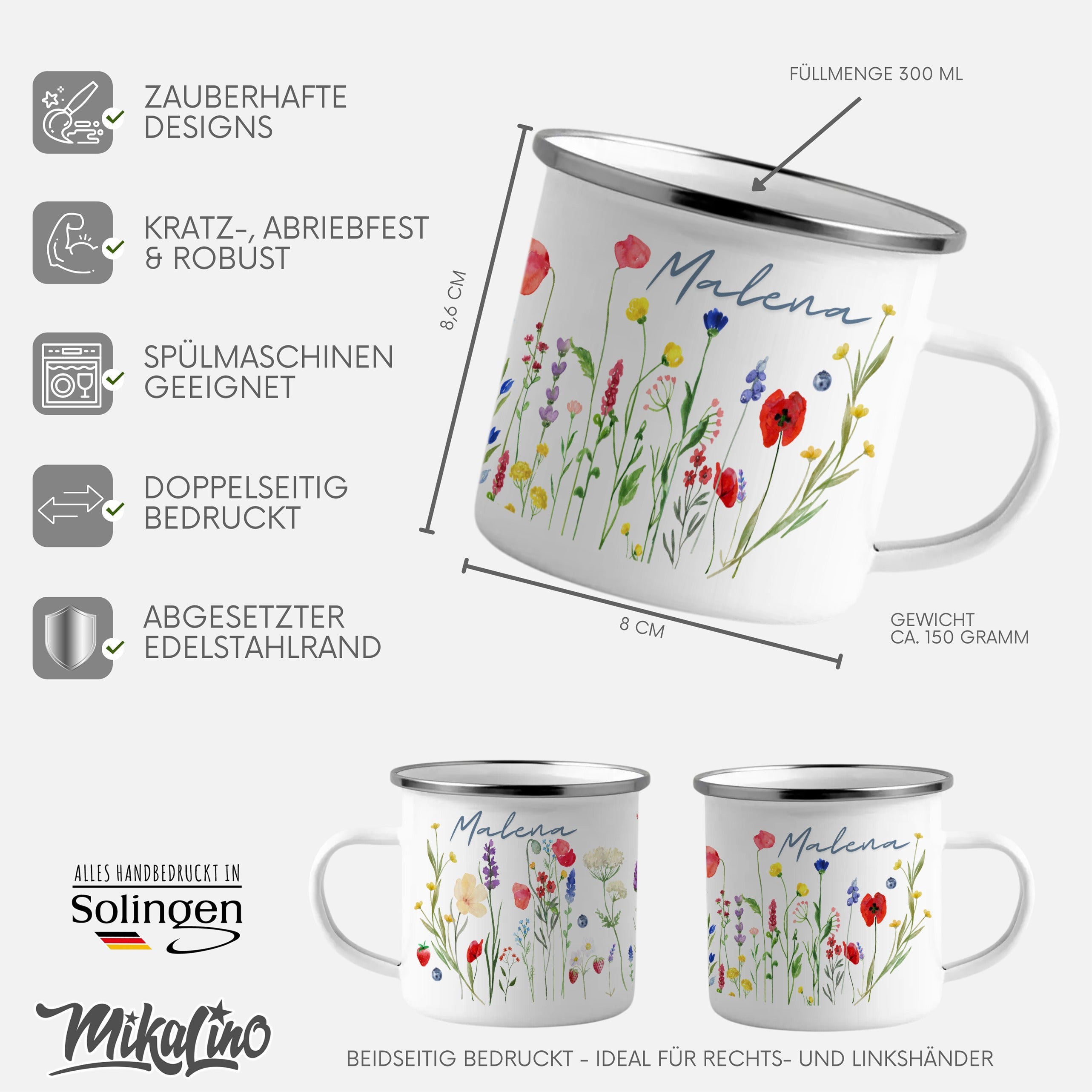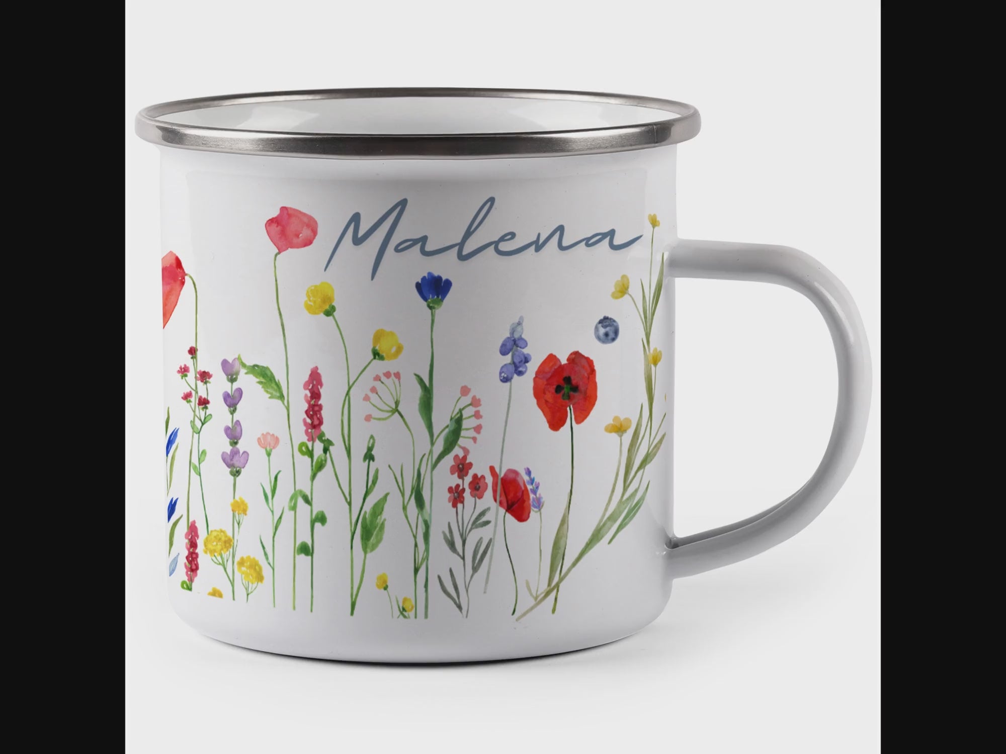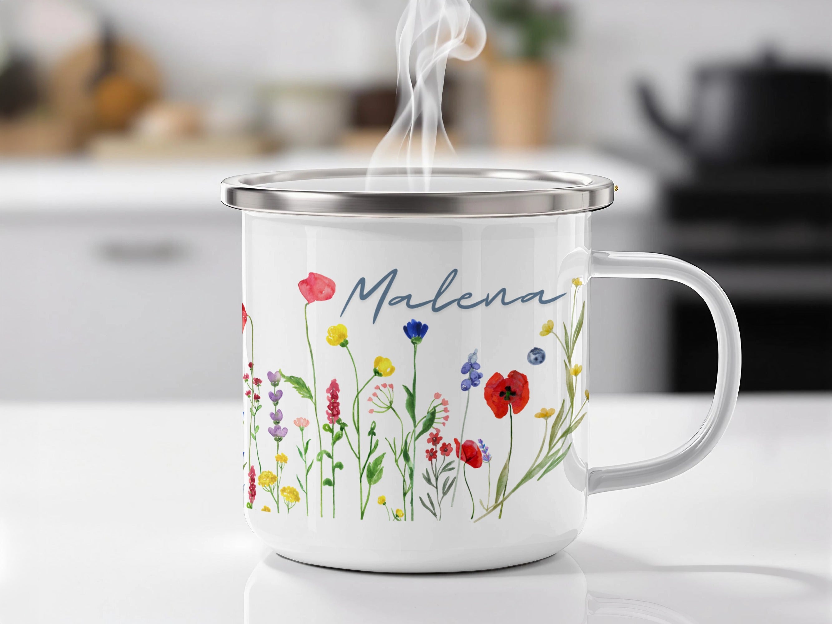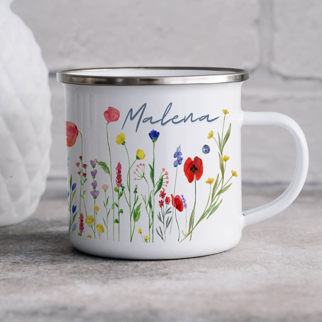 Die personalisierte Emaille Tasse mit Wildblumen – Blumenmotiv & Naturmotiv-Motiv von MIKALINO ist das perfekte Geschenk für alle, die Wildblumen und liebevoll gestaltete Blumenmotive lieben – eine wunderschöne Tasse für alle, die den Zauber der Natur jeden Tag genießen möchten.. Jede Tasse wird mit deinem Wunschnamen bedruckt und so zu einem ganz persönlichen Unikat.