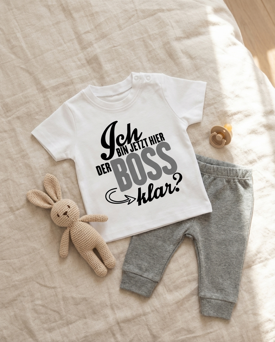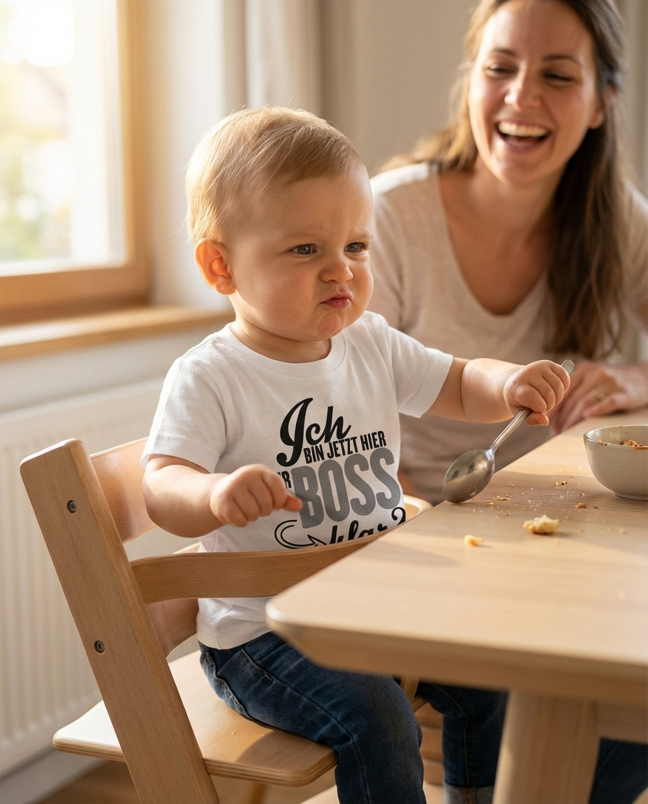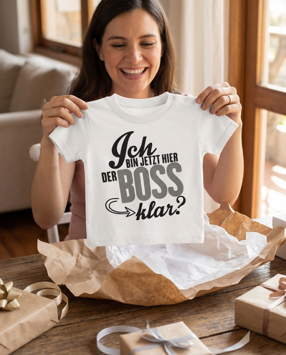 Stell dir vor: Dein kleines Wunder kommt ins Zimmer, alle schauen hin — und dann lesen sie den Spruch auf dem Shirt. Ein Schmunzeln, ein Lachen, und das Herz wird warm. "Ich bin jetzt hier der Boss, klar?" — drei Wörter, die alles sagen, was Eltern insgeheim längst wissen.